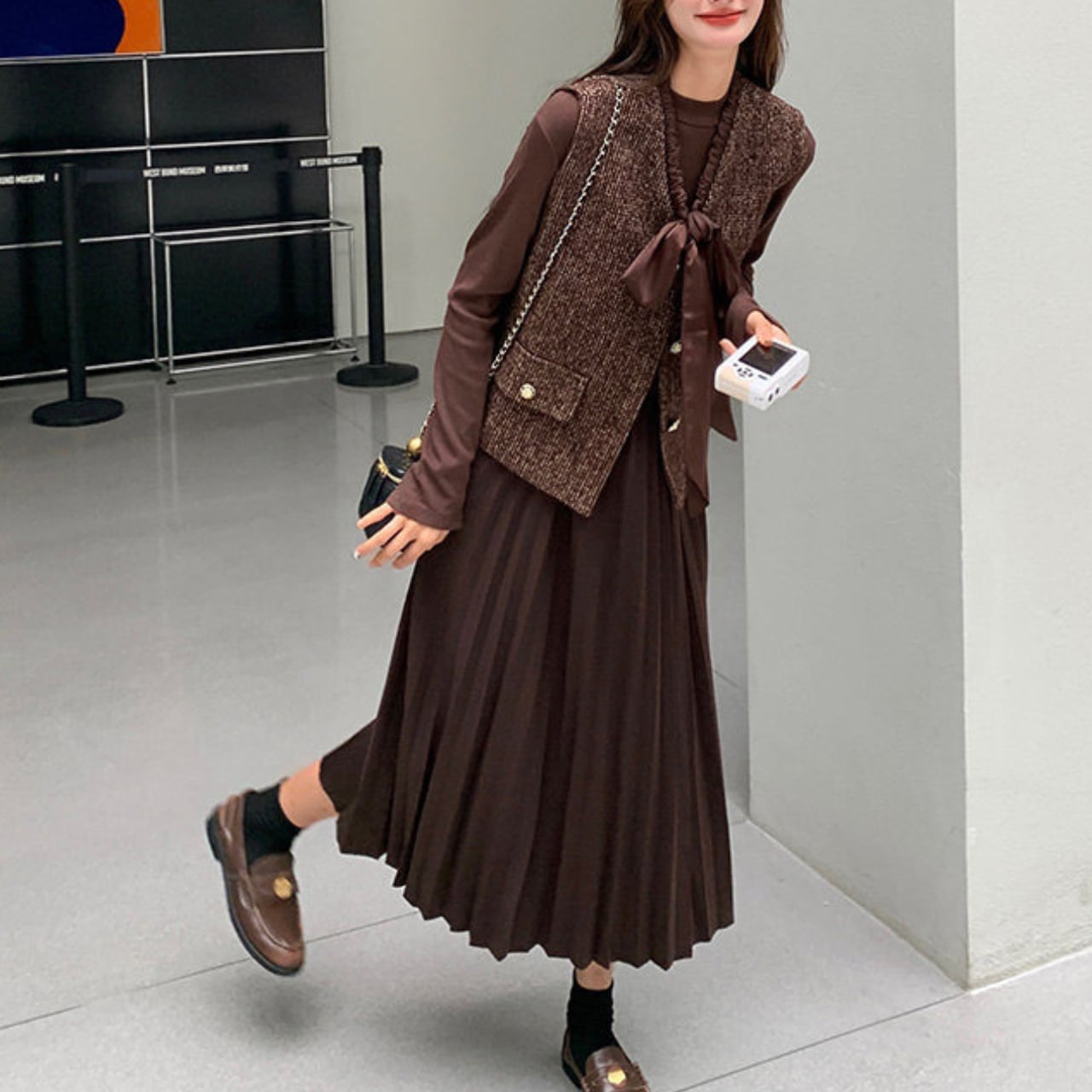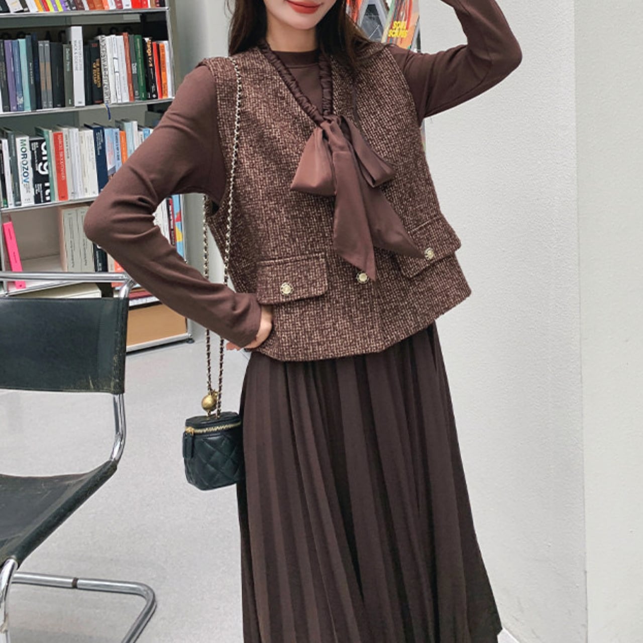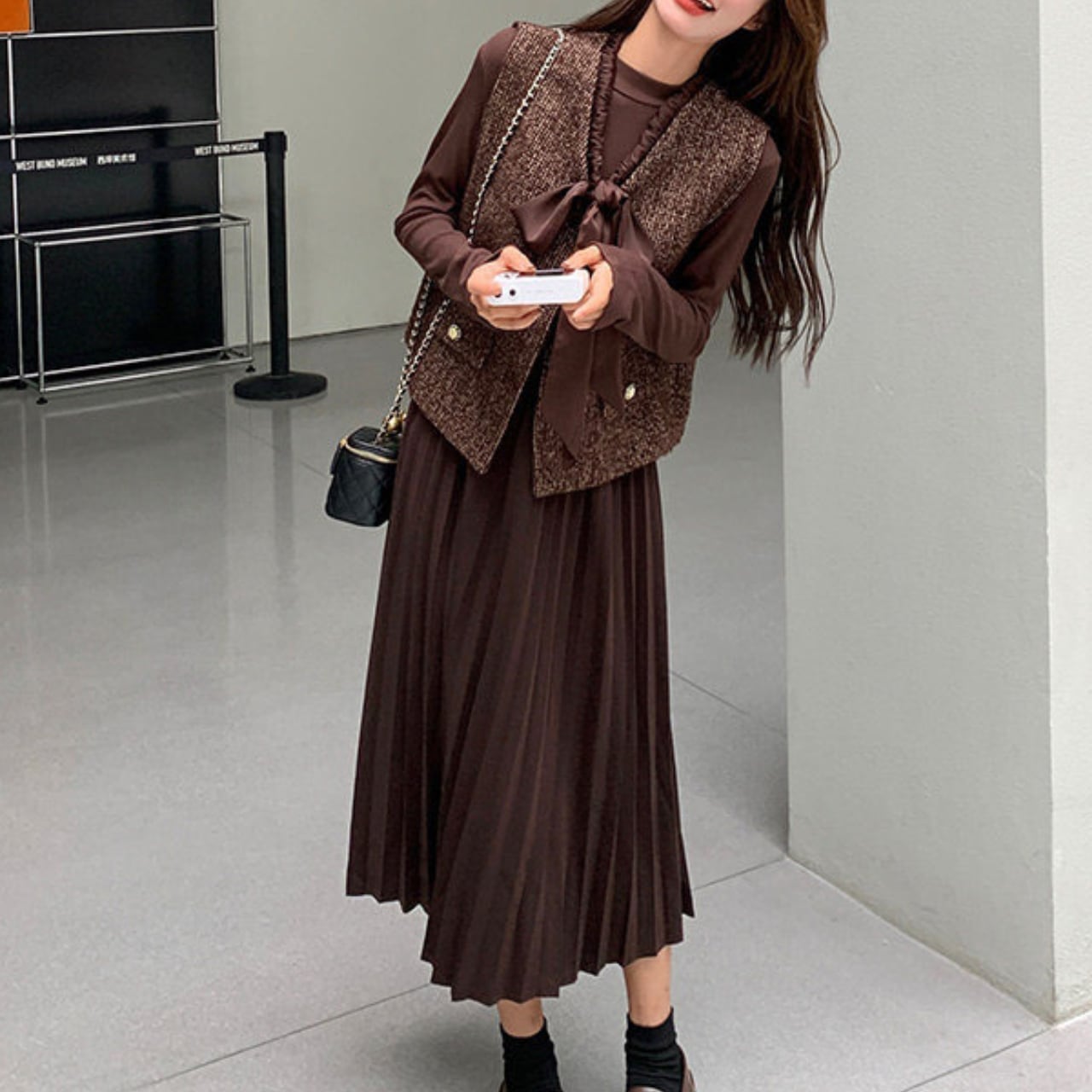 落ち着いたブラウンのプリーツワンピースに、上品なツイード調ベストのセットアイテム。