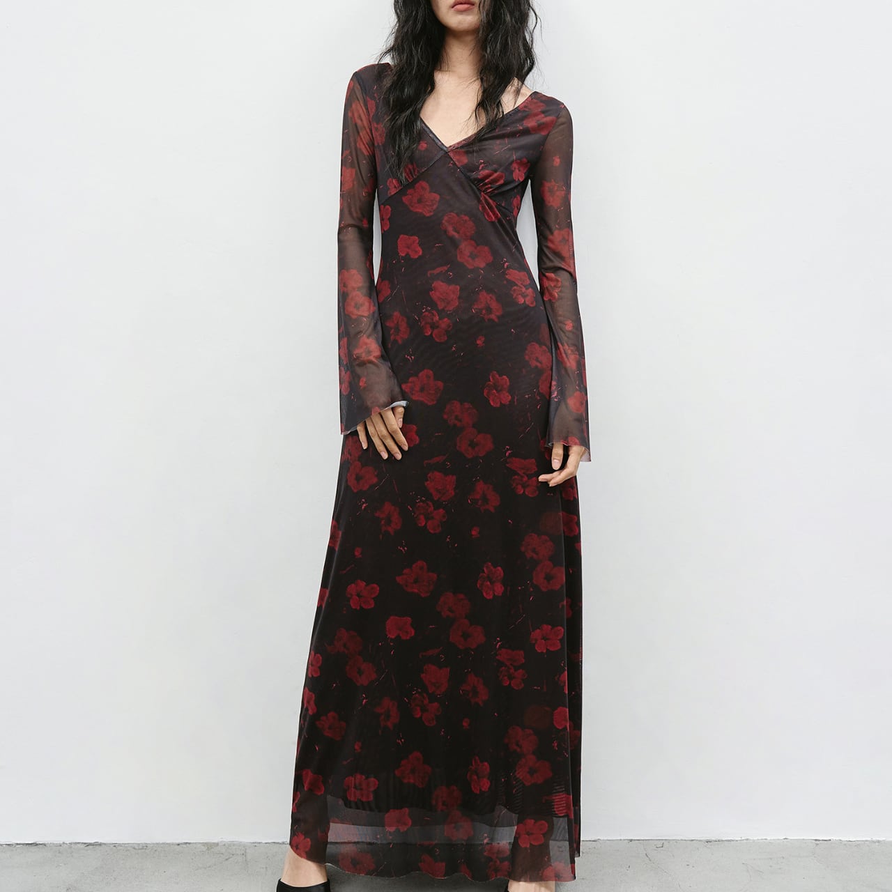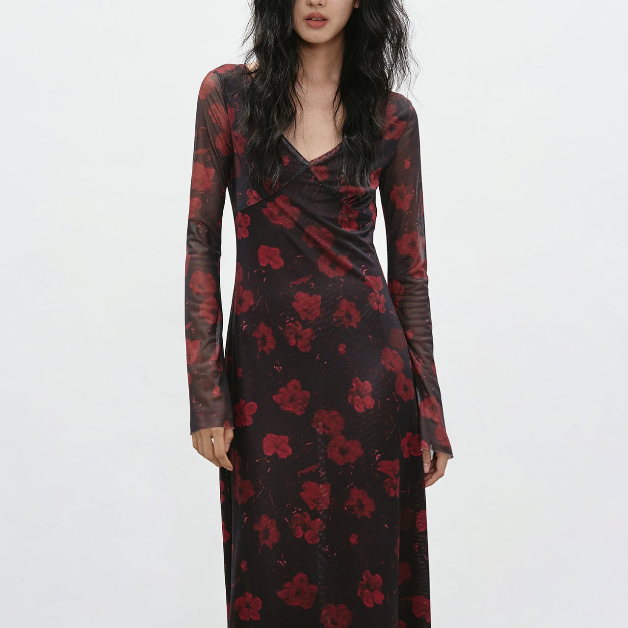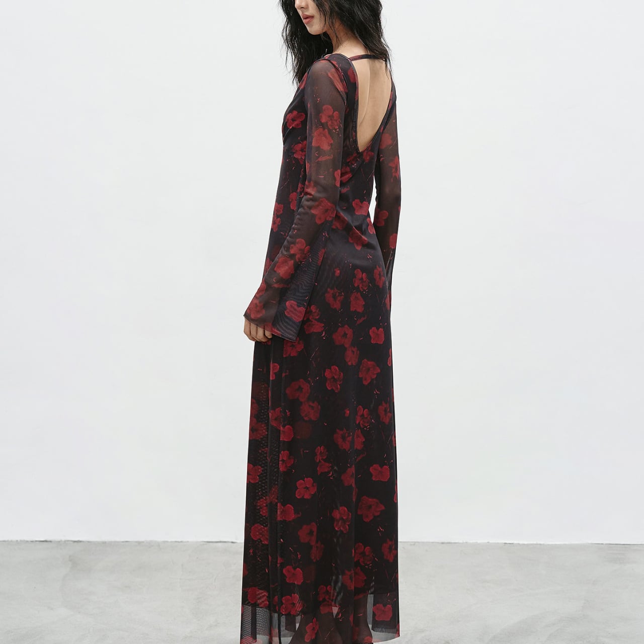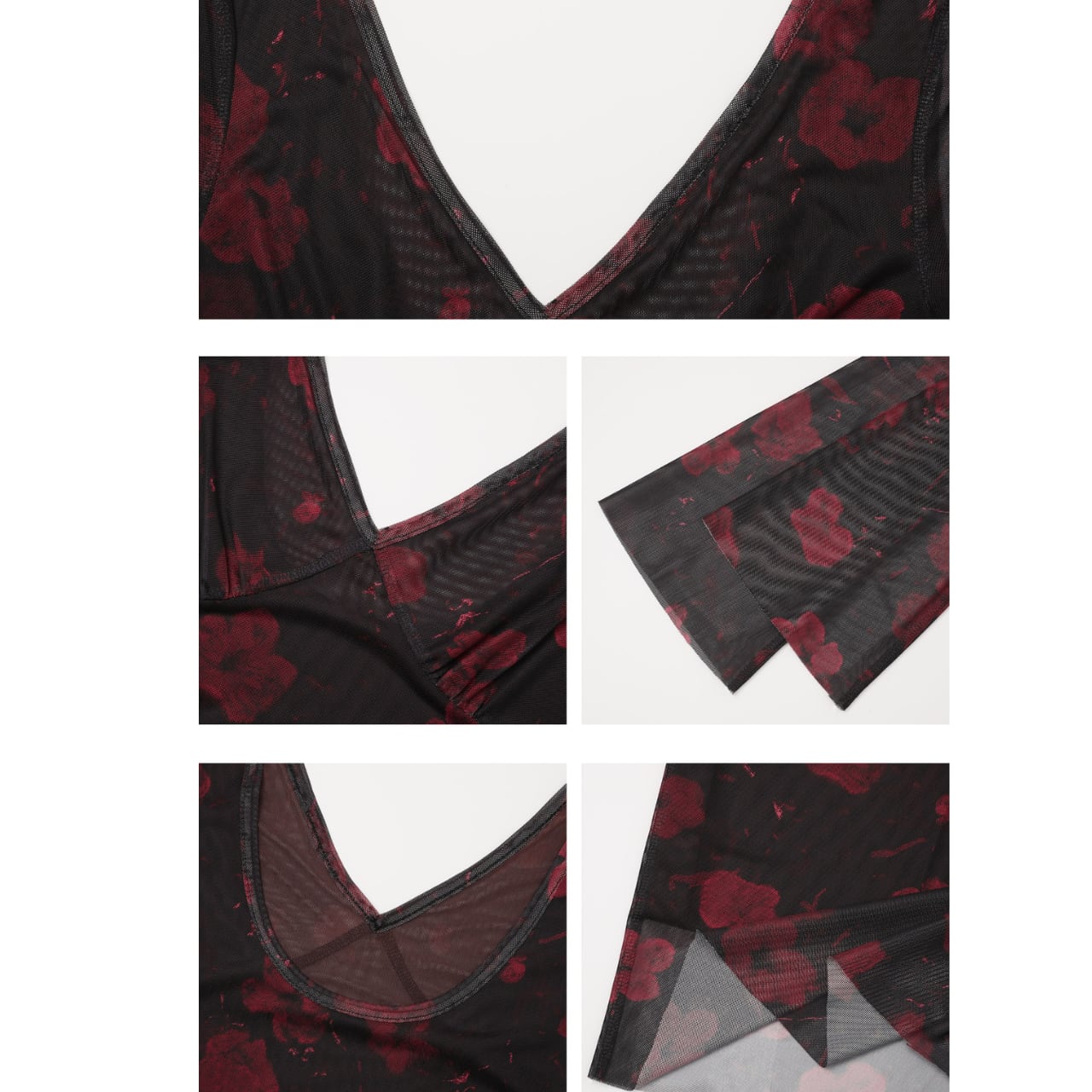 深い黒地に燃えるような深紅の花々が揺れる——シアー素材を纏うことで、プリントはまるで肌の奥から滲み出るように浮かび上がります。
