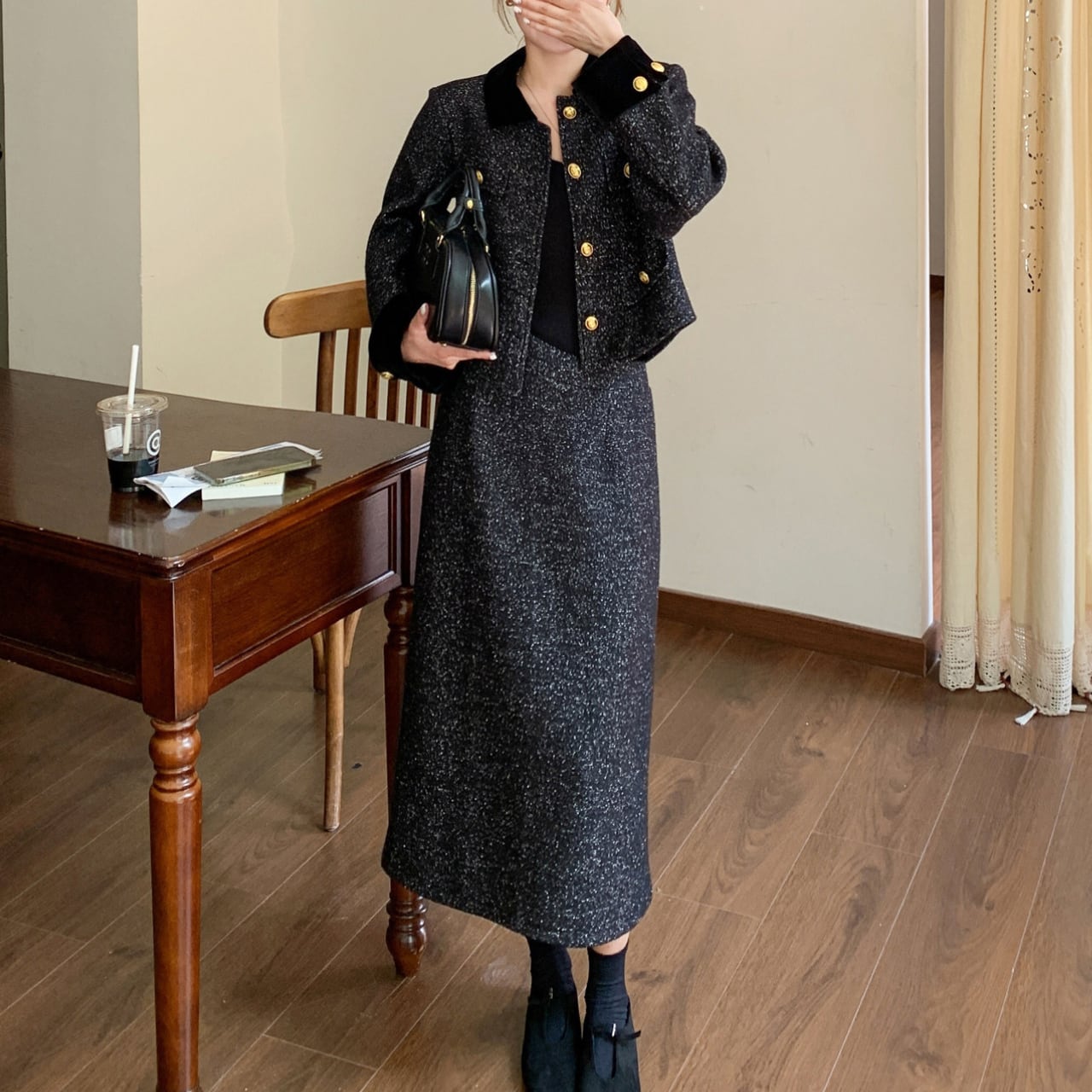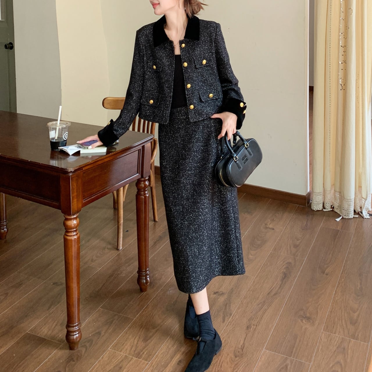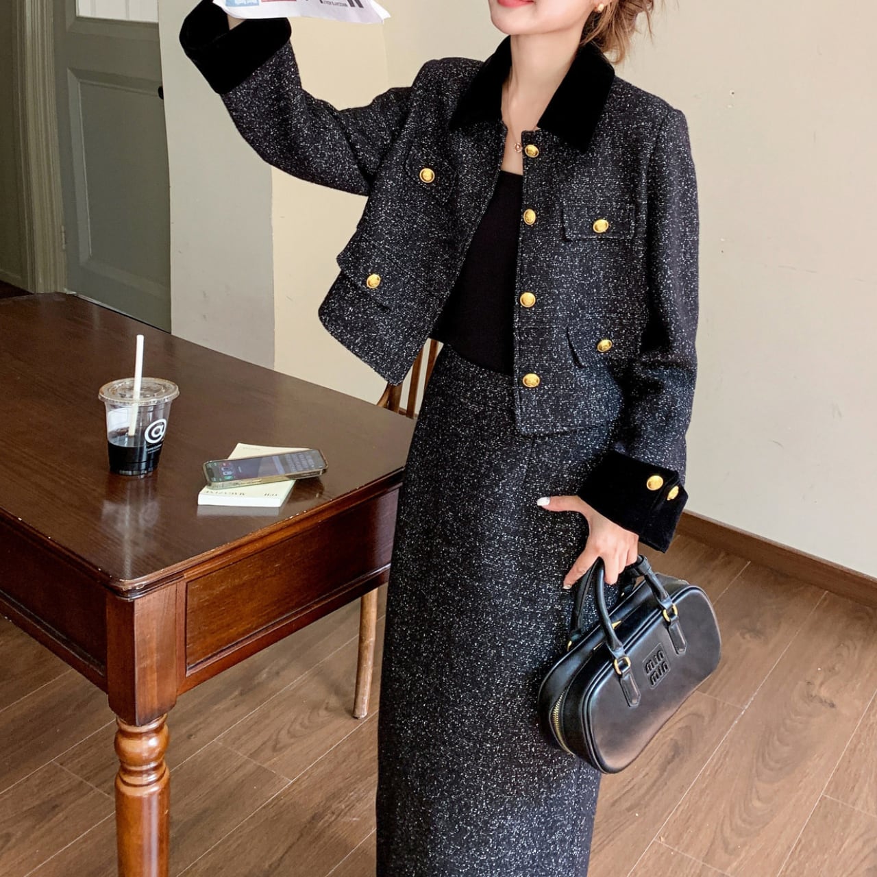 グレーのツイード生地にベルベットの衿と袖口が全体を引き締め、フレンチクチュール的な気品を日常に持ち込みます。