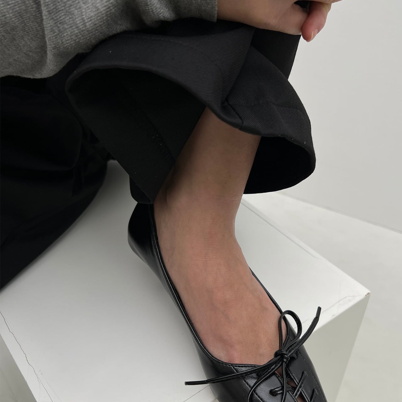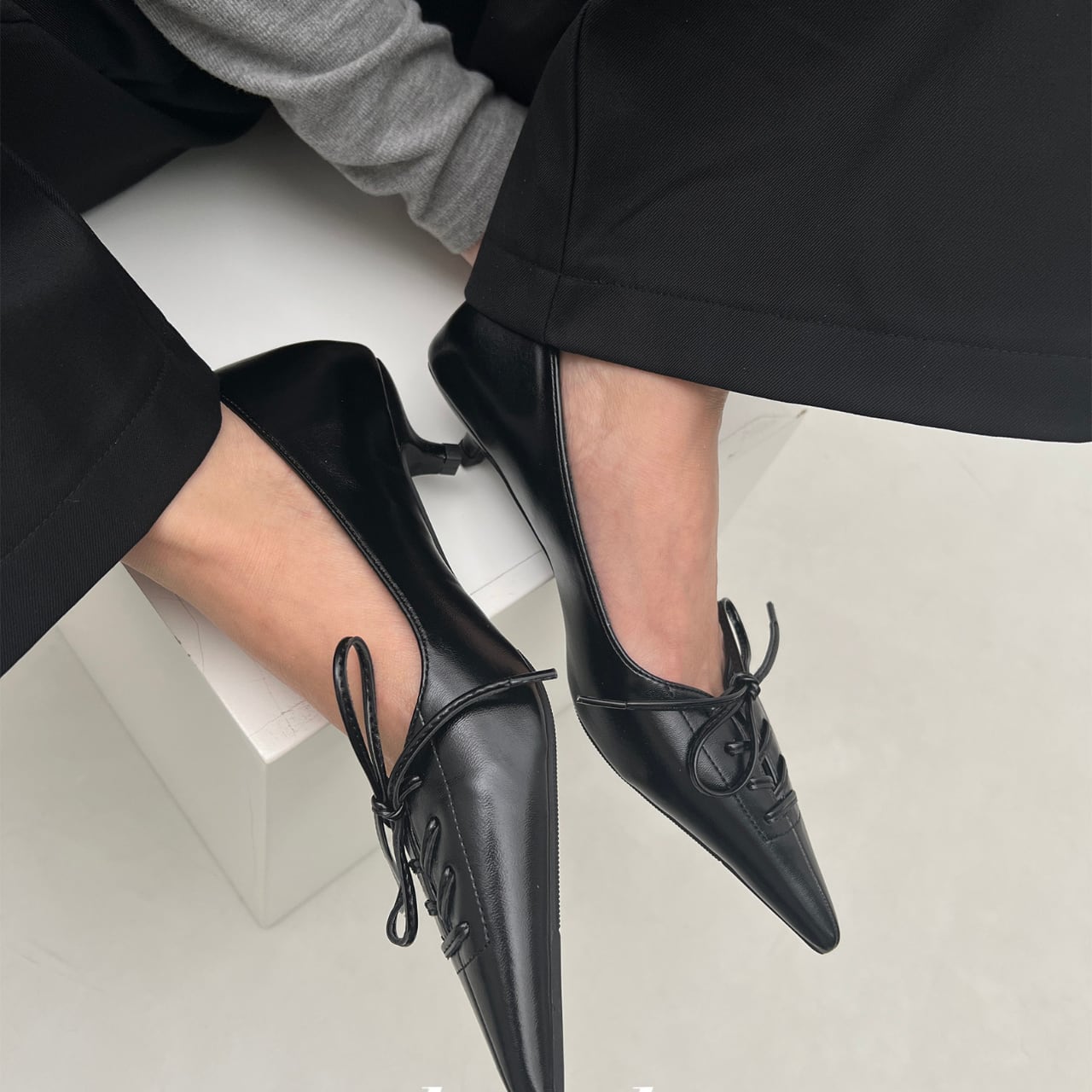 すっきりとしたポインテッドトゥが脚のラインを綺麗に見せ、レースアップデザインがアクセントをプラス。