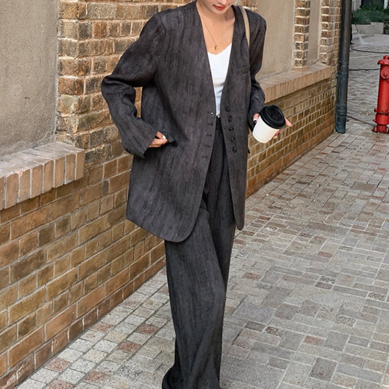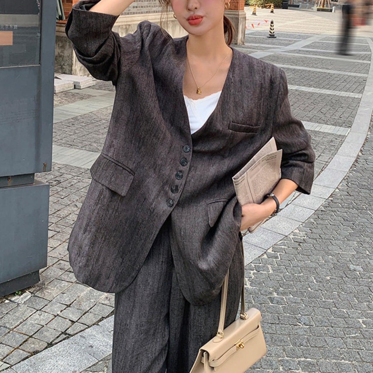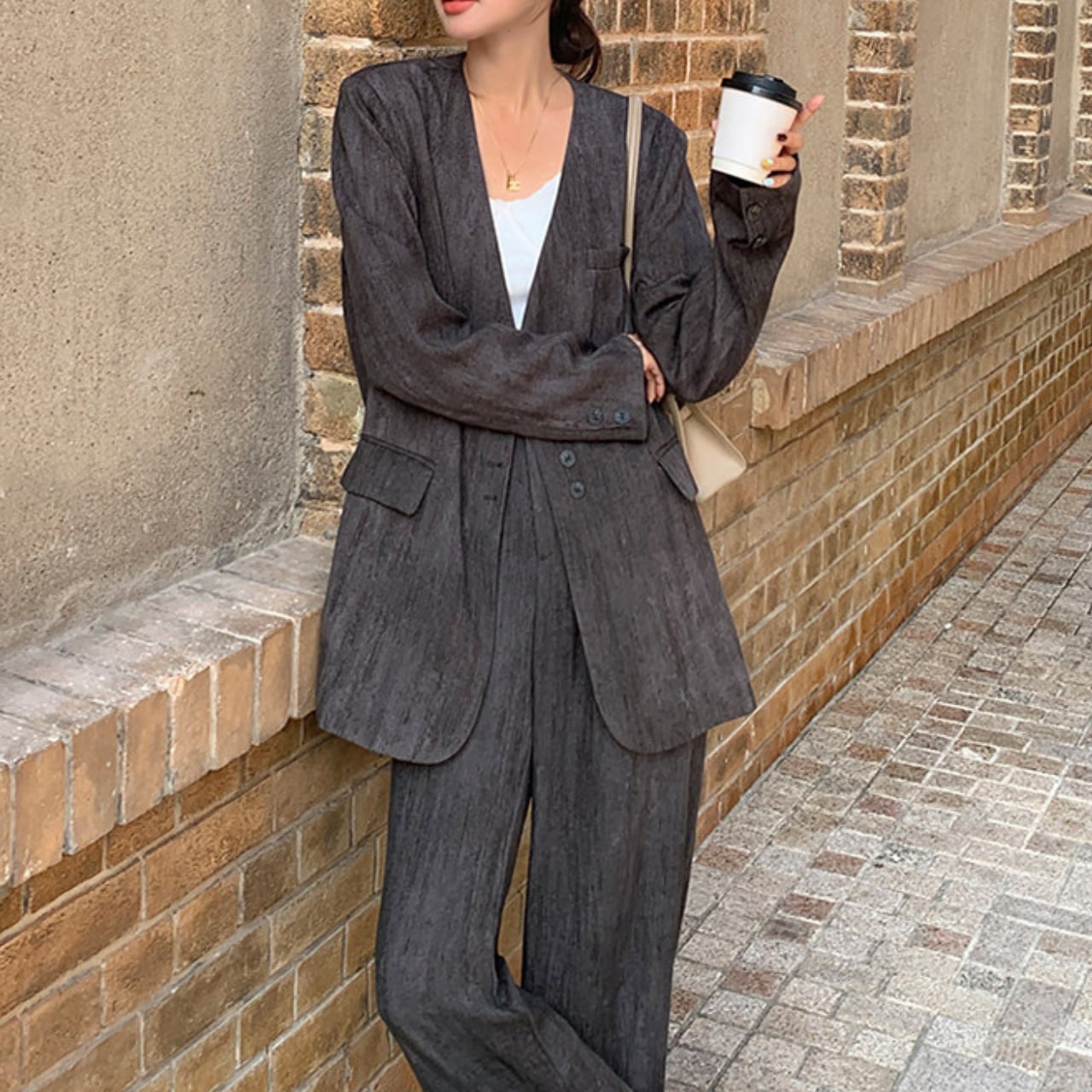 柔らかく表情のあるニュアンス柄が魅力のジャケットとパンツのセットアップ。
