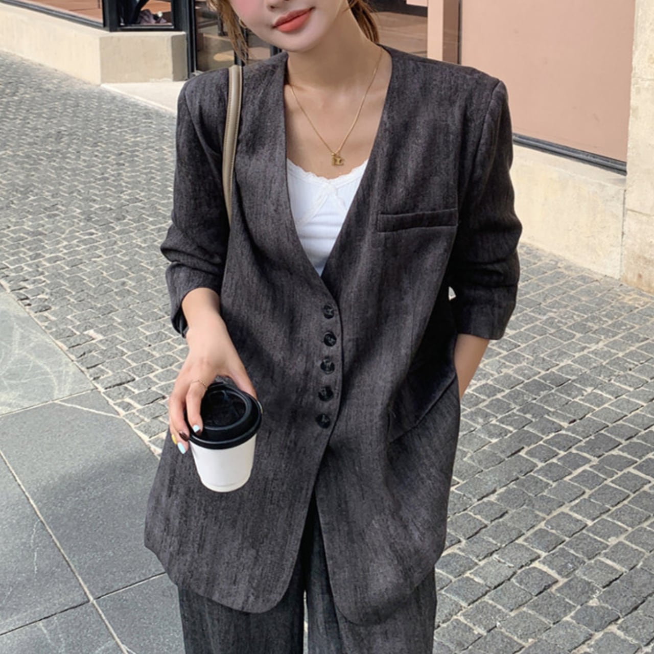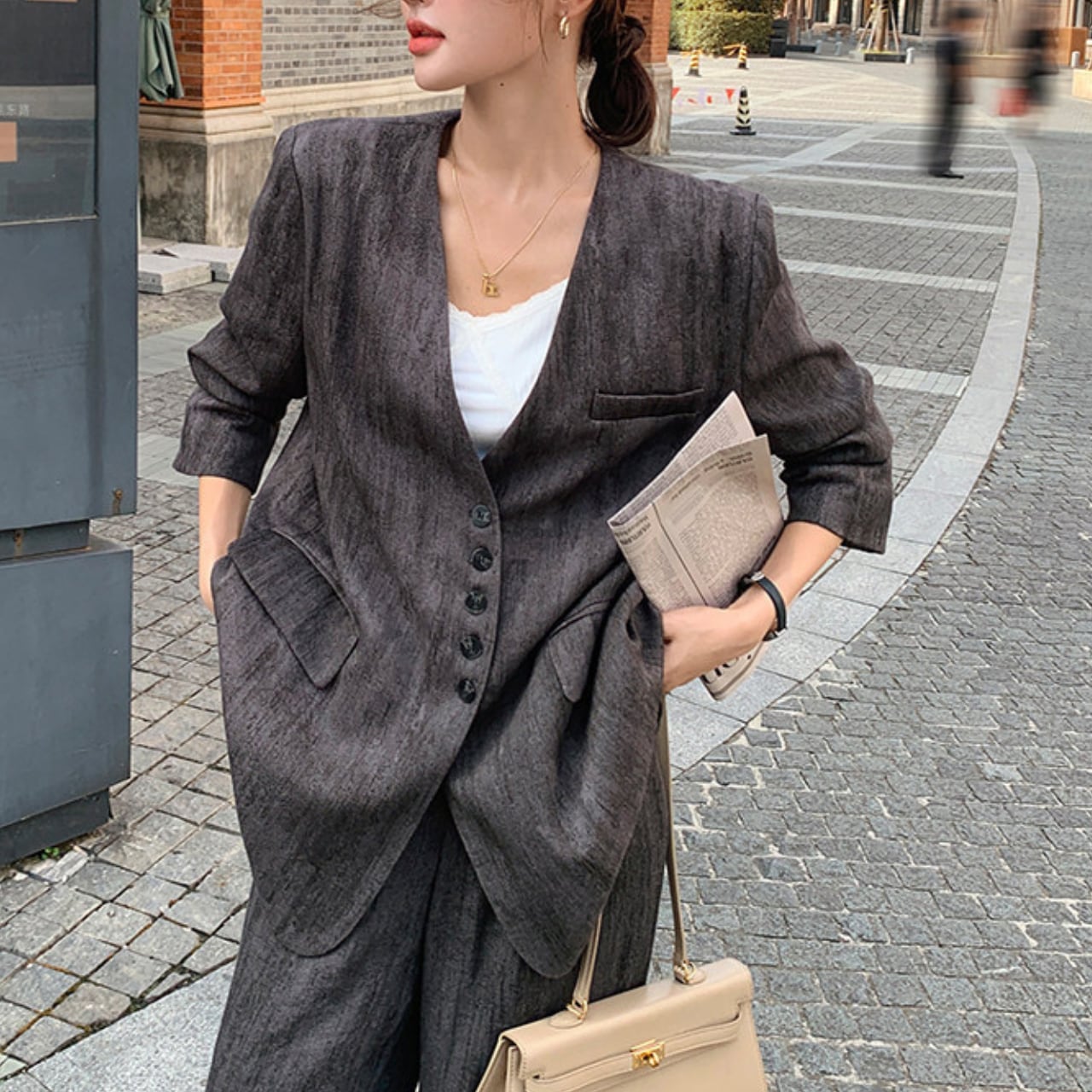 ジャケットはすっきりとしたノーカラー仕様で、顔周りをシャープに見せながら女性らしい印象に。