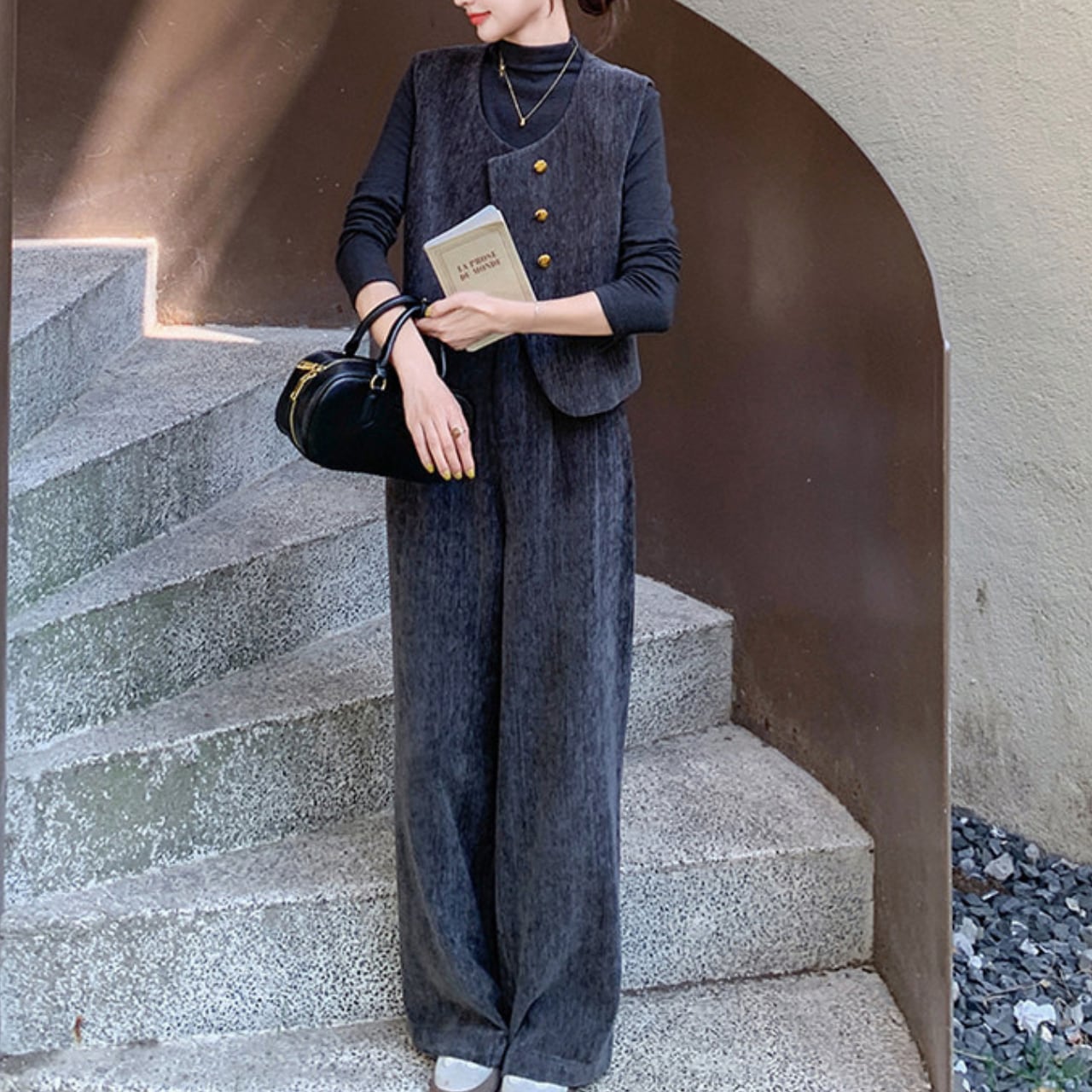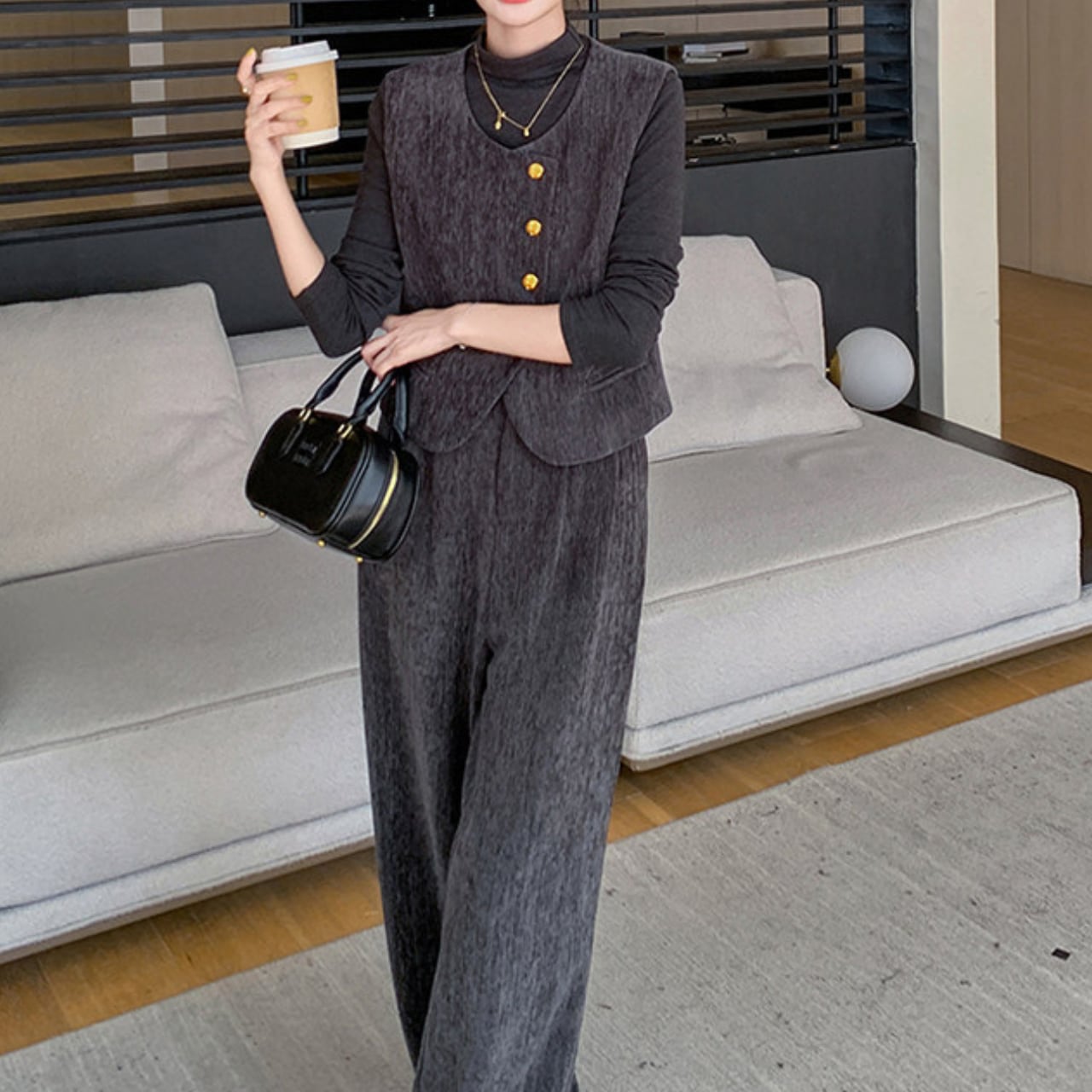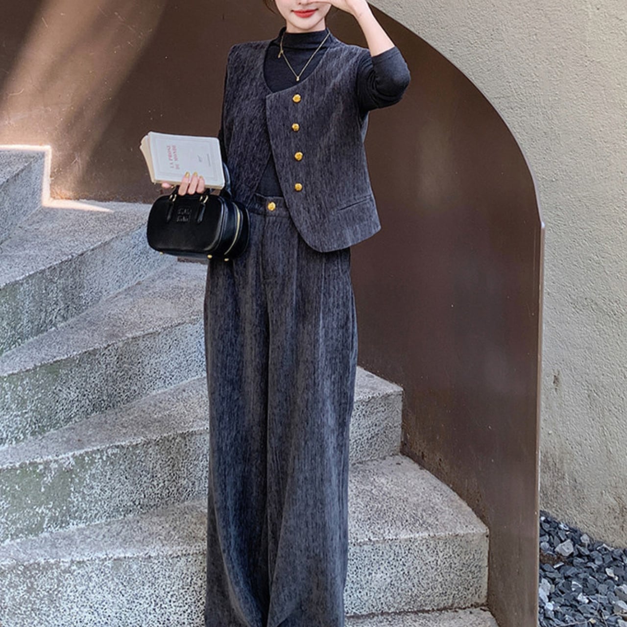 ハイネックのインナーと上品なゴールドボタンがアクセントのベスト、リラックス感のあるワイドパンツを組み合わせた大人のためのスタイリングセットです。