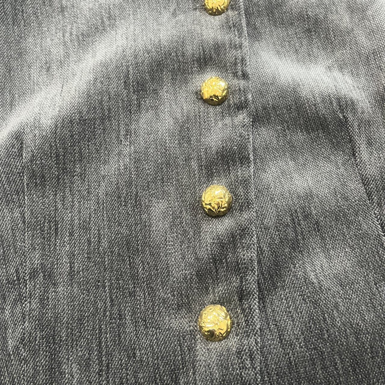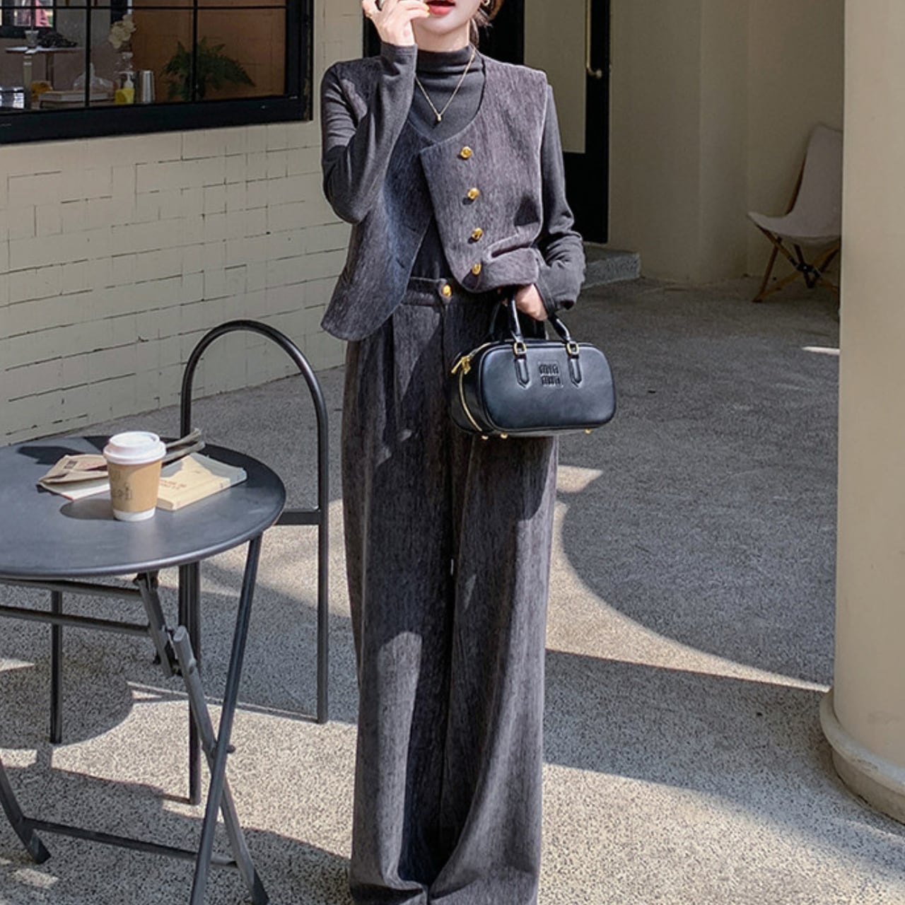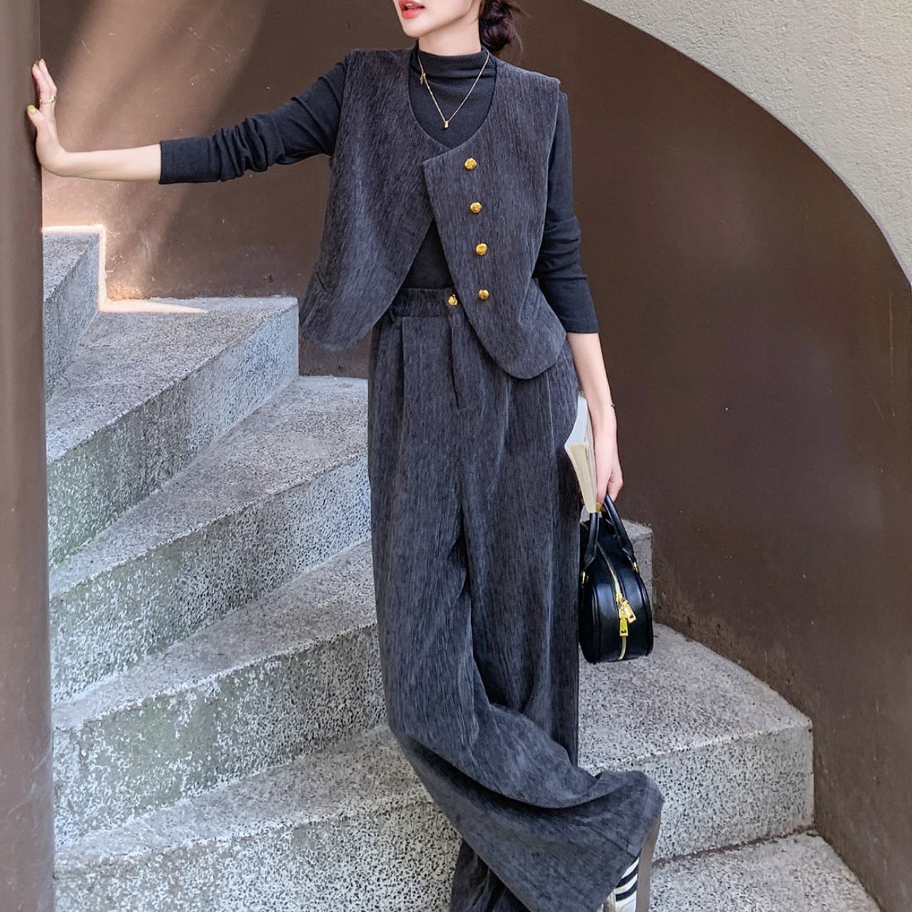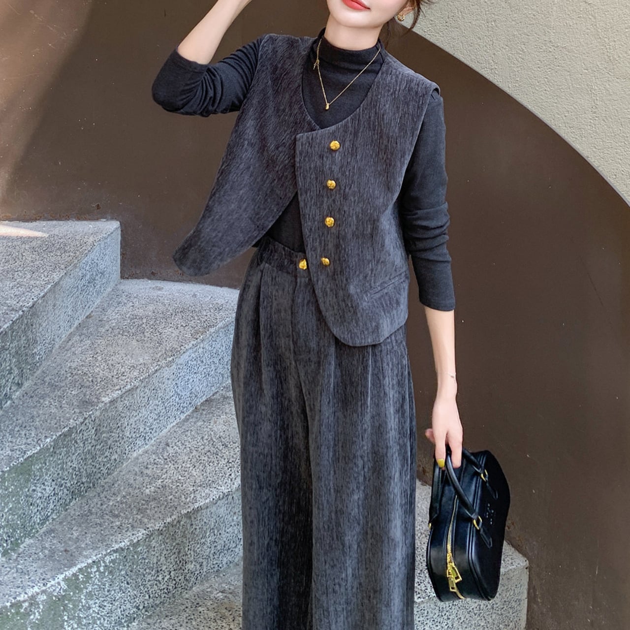 ハイネックのインナーと上品なゴールドボタンがアクセントのベスト、リラックス感のあるワイドパンツを組み合わせた大人のためのスタイリングセットです。