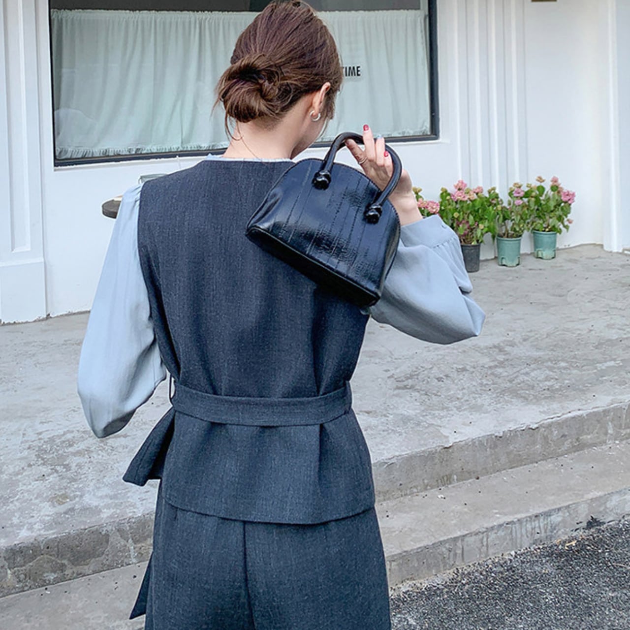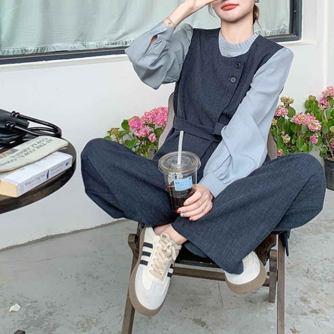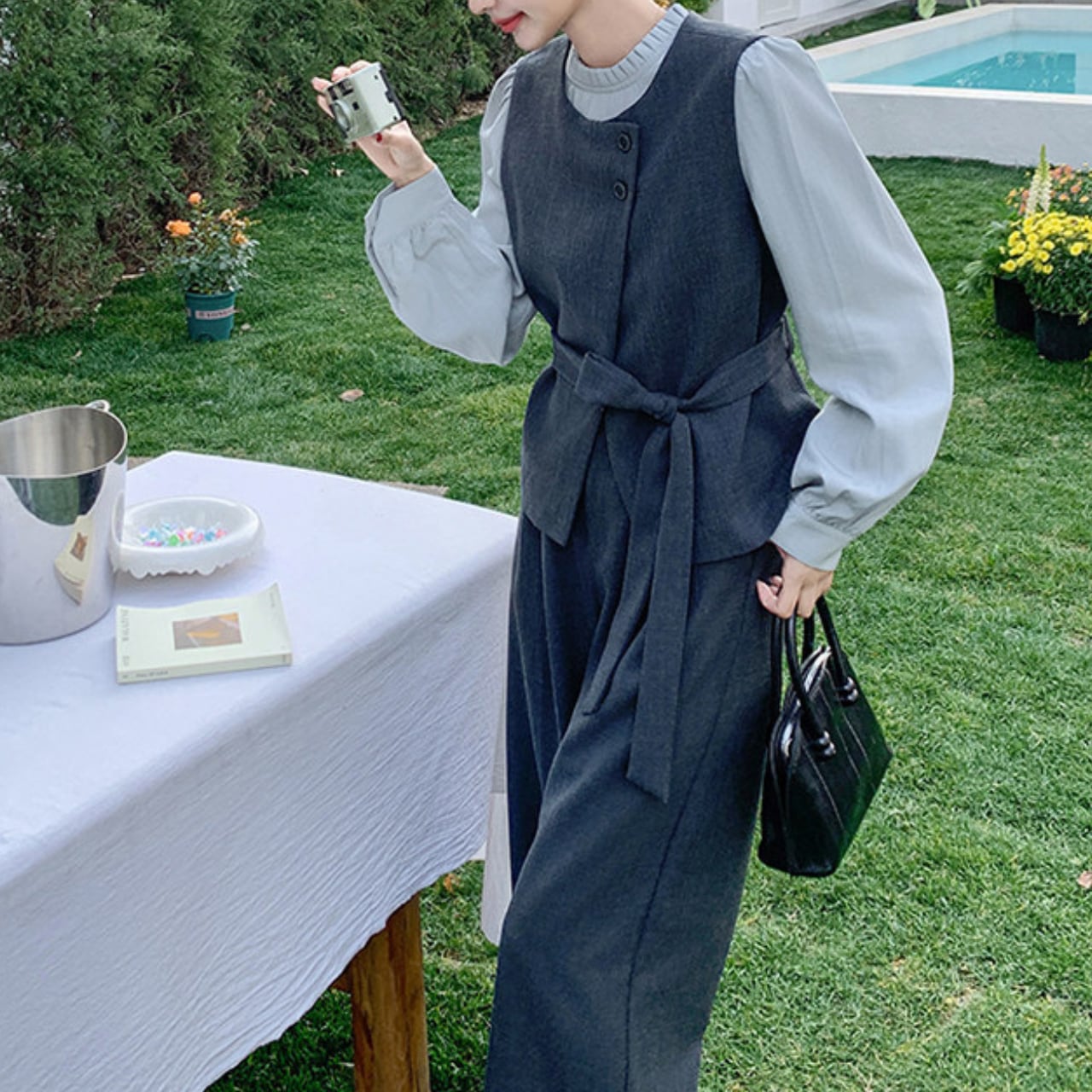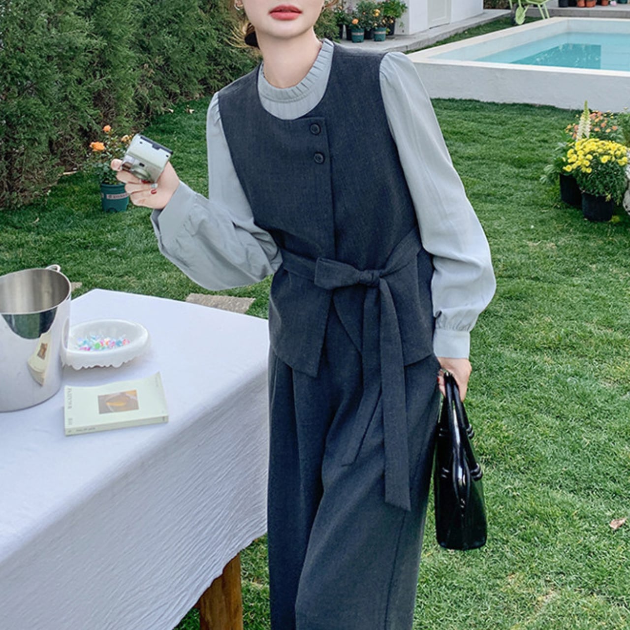 上品なシャツとレースアップベスト、ワイドパンツを組み合わせたコーディネートが完成する3点セットアイテム。