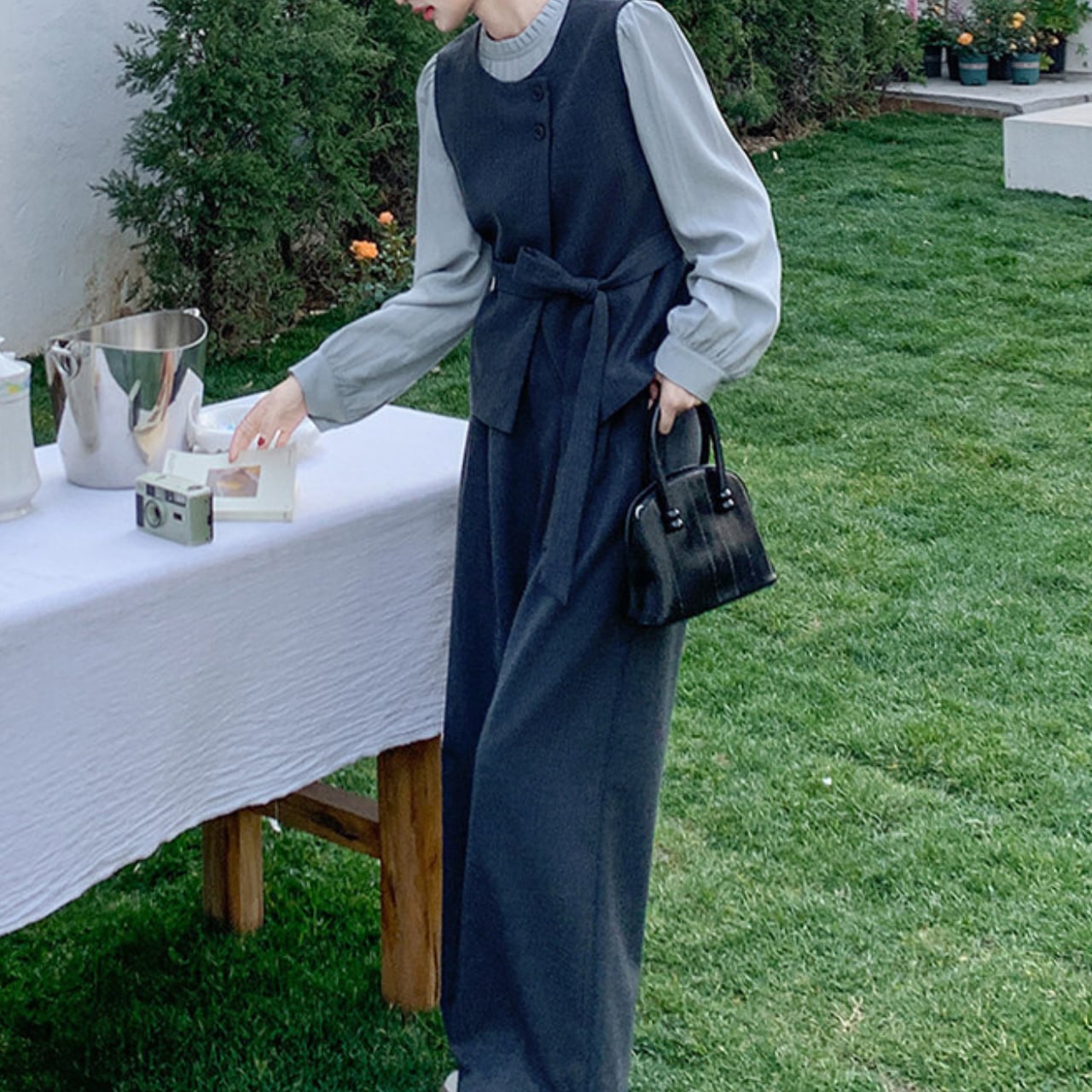 シンプルながらもデザイン性のあるレースアップベストがスタイルのアクセントになり、ウエストマークで自然にスタイルアップを叶えます。