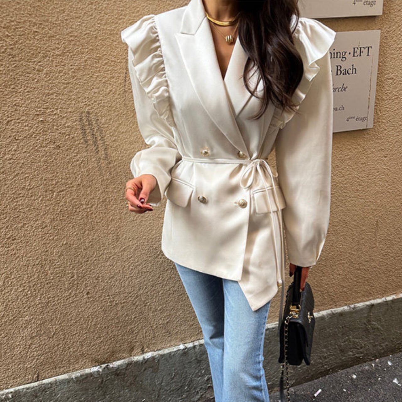 クラシックなダブルボタンデザインに、女性らしいフリルディテールを組み合わせることで、上品さとトレンド感を兼ね備えた一着に仕上がっています。