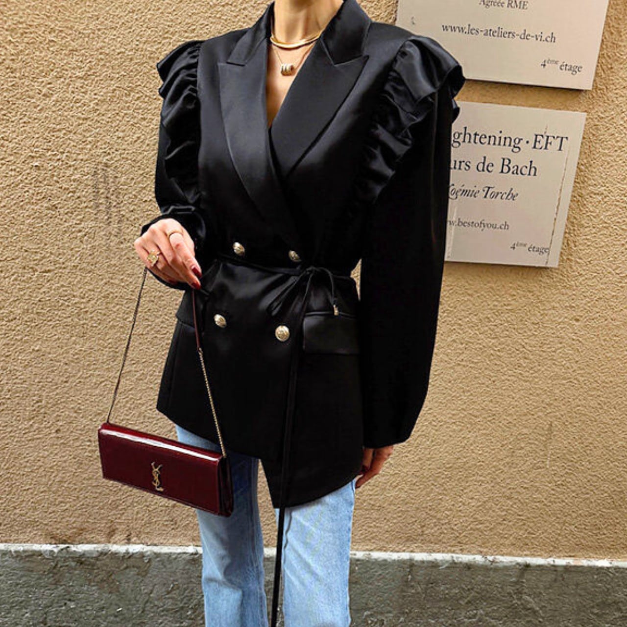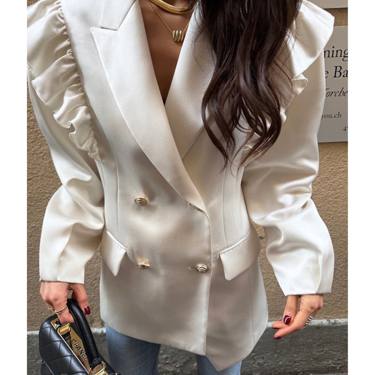 華やかなラッフルショルダーが目を惹く、エレガントなジャケット。