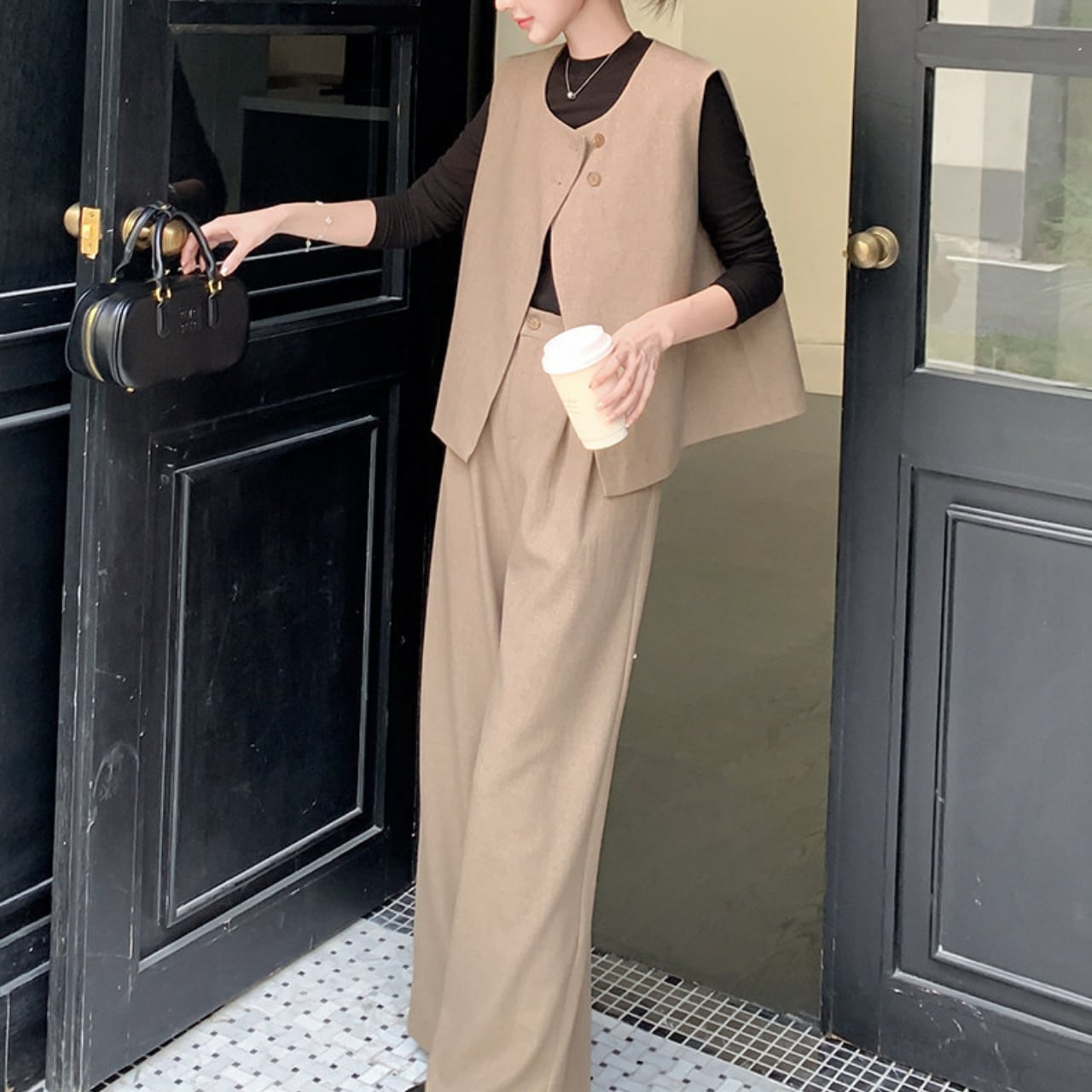 ノーカラー×非対称ボタンのベストは、首元をすっきりと見せながら、さりげないデザイン性をプラス。