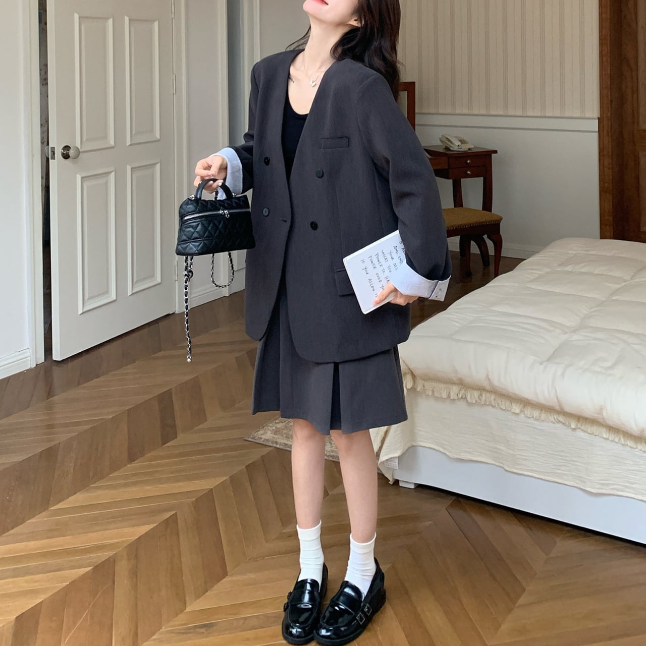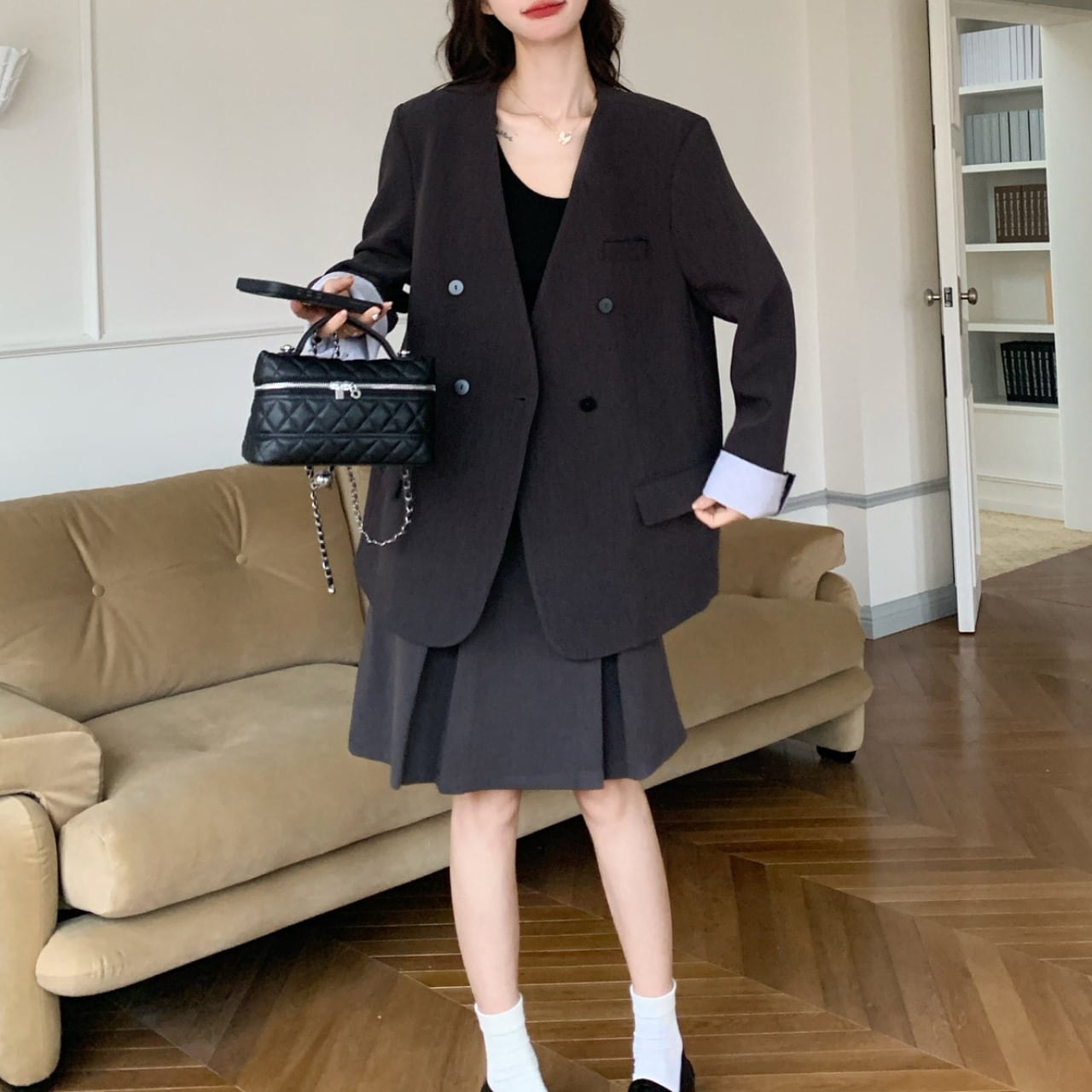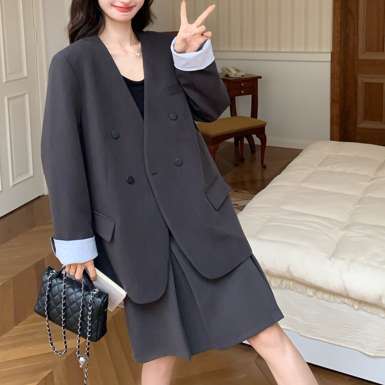 異なる色彩が生み出す美しいコントラストが、視線を惹きつけるダブルジャケット&スカートセット。