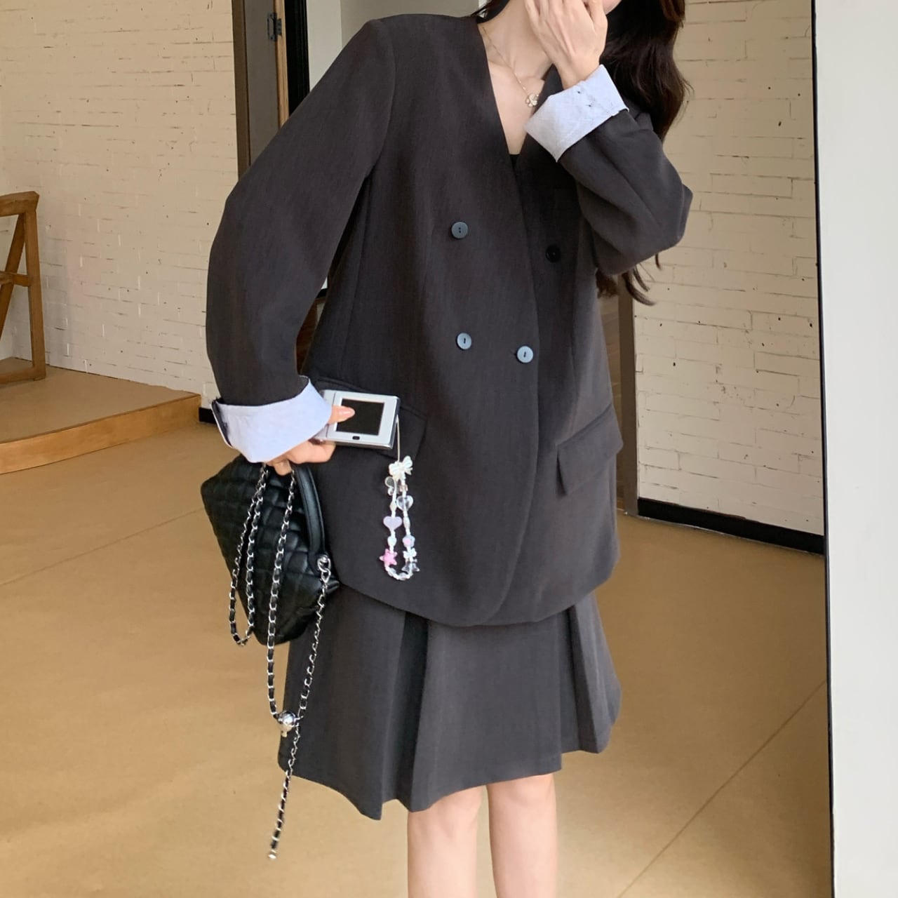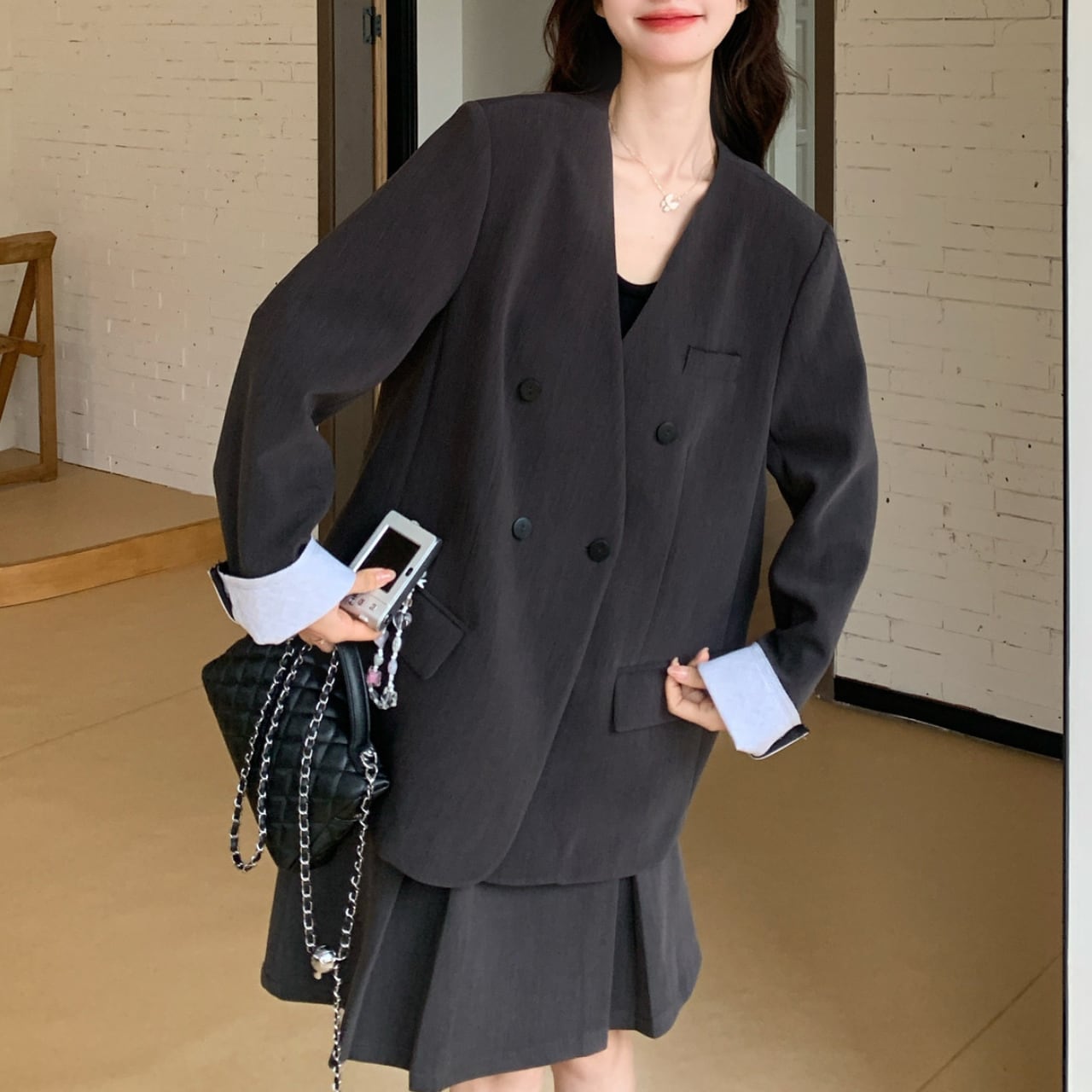 ダークグレーのジャケットにさりげなく差し込まれた淡色が、コーデ全体に抜け感と洒落っ気をプラスします。