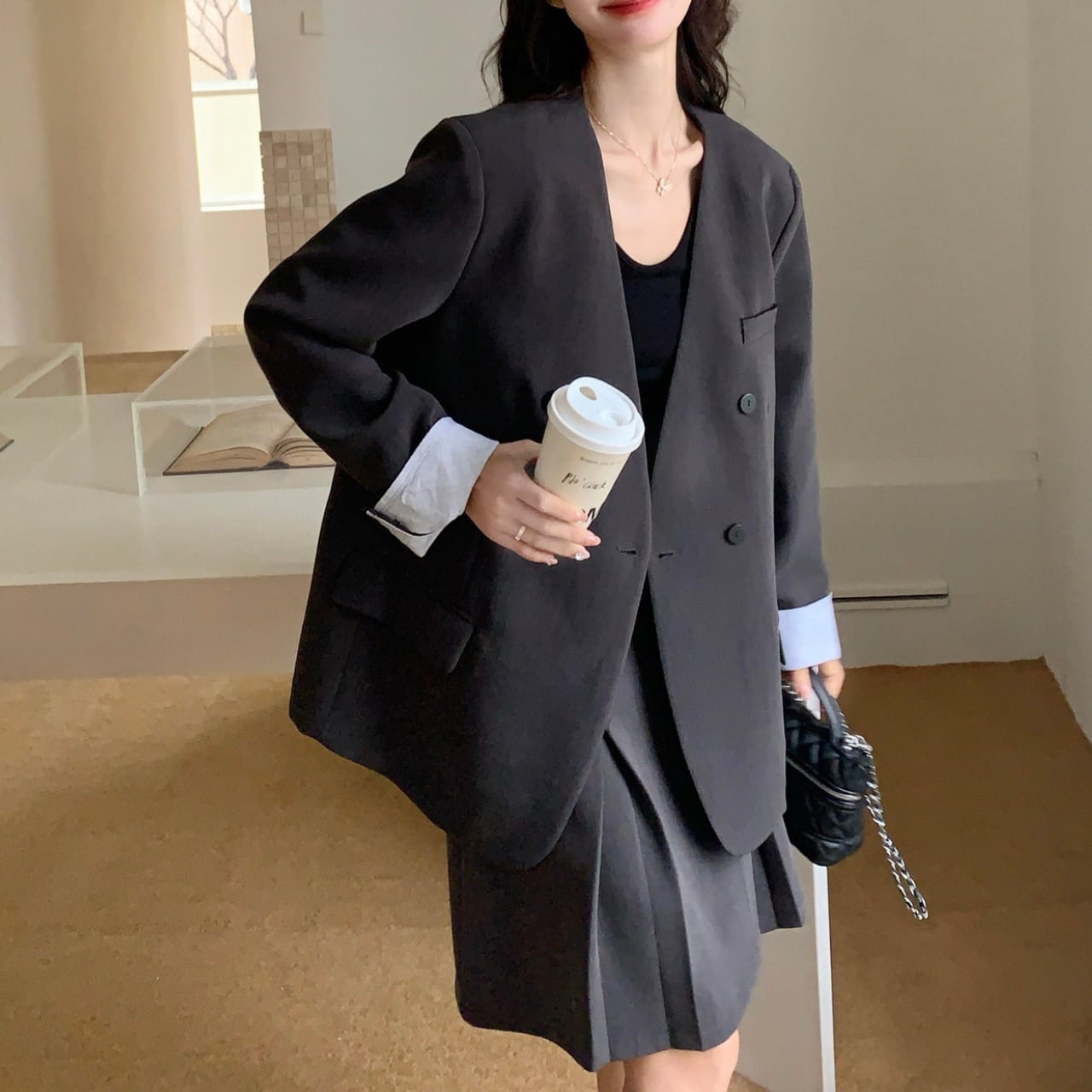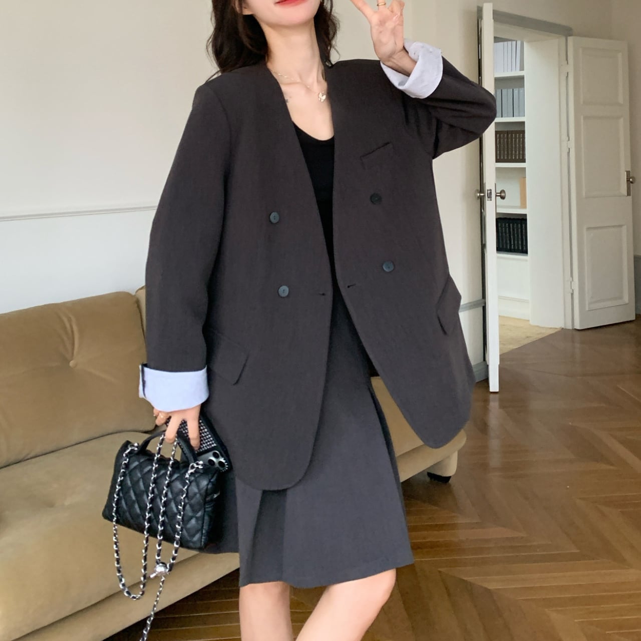 オーバーサイズ気味のダブルブレストジャケットは、肩まわりにゆとりを持たせた今どきのリラックスフィット。