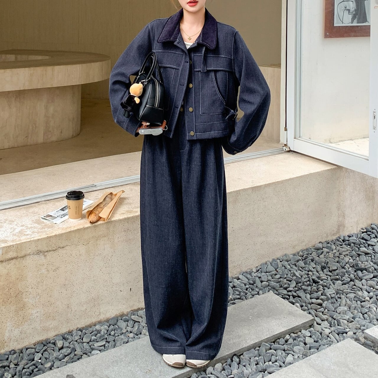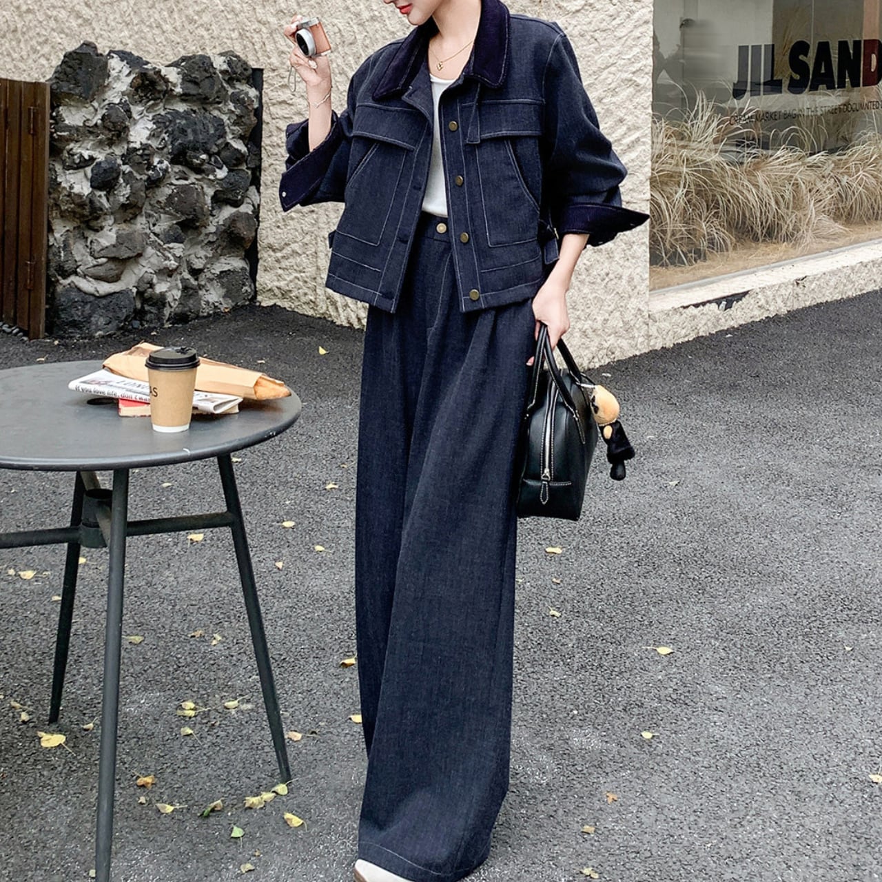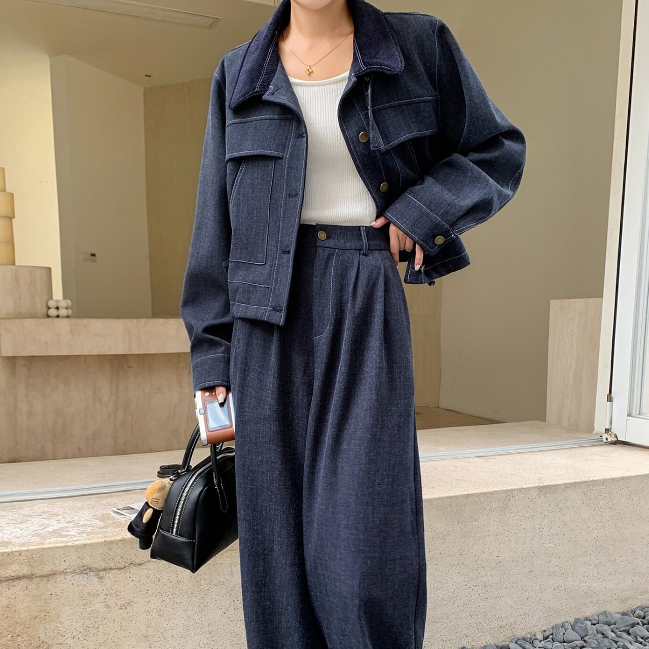 程よく力の抜けたデニムスタイルに、洗練された大人のエッセンスをプラスしたジャケット&ワイドパンツセット。