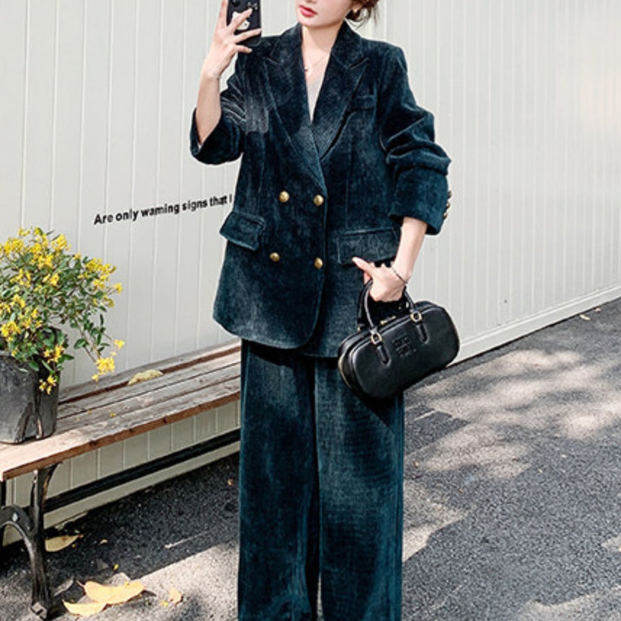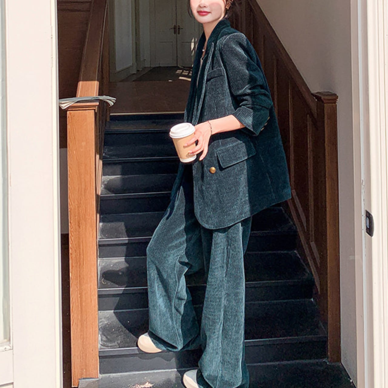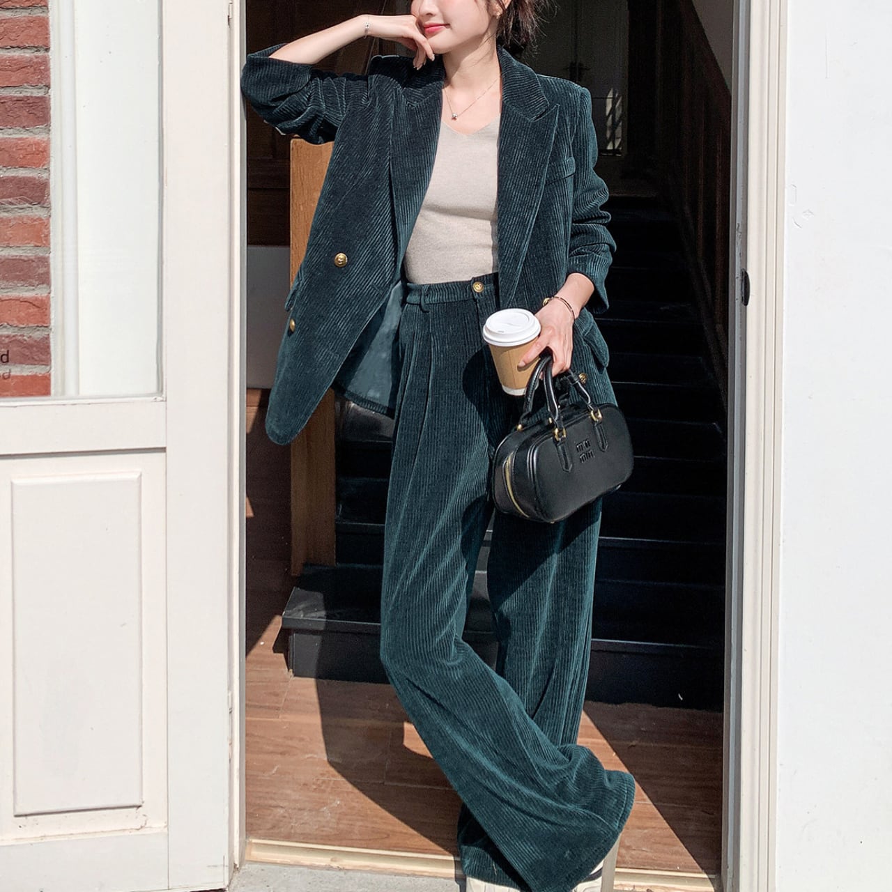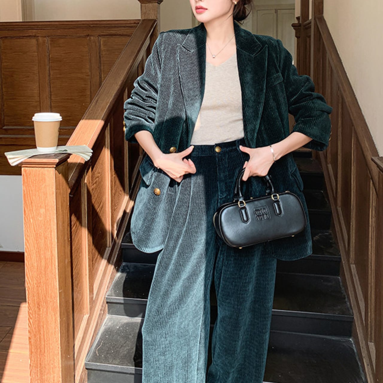 コーデュロイ素材が生み出す立体的な表情と、ダークグリーンの深みある色合いが、大人の品格をさりげなく演出するセットアップ。