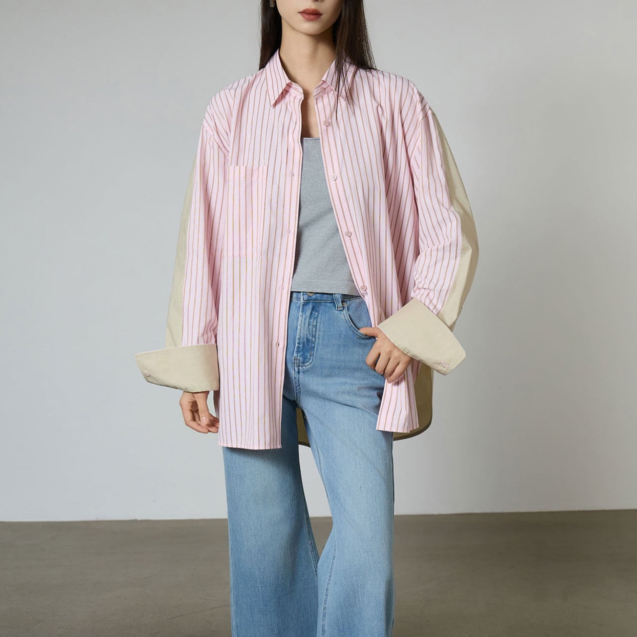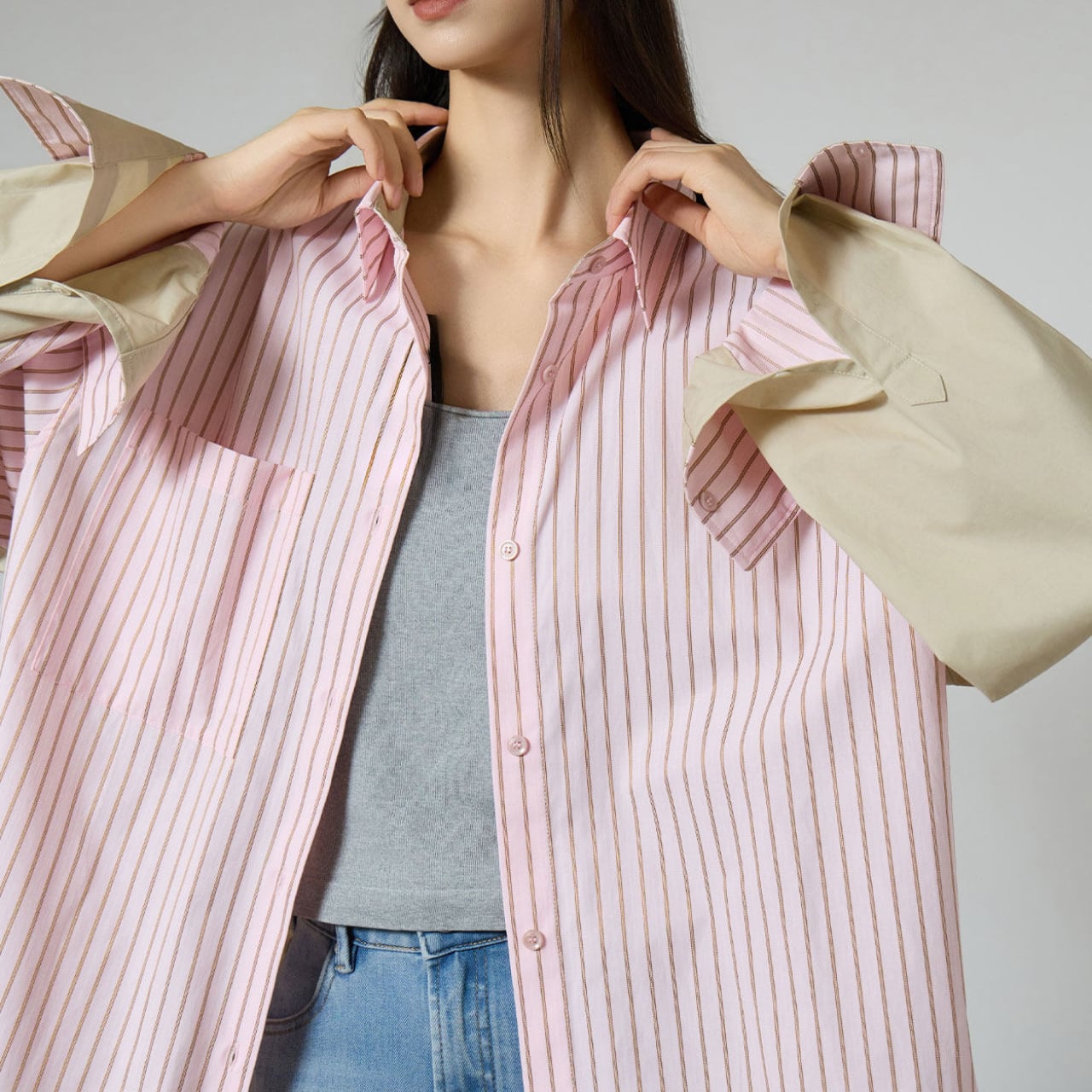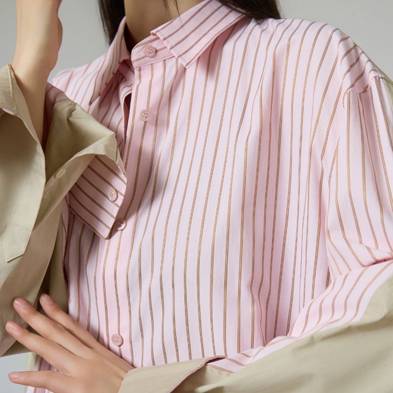 ピンクベースのピンストライプに、ベージュの無地パッチワークをあしらったデザインは、シャツの概念をひとつ更新するような新鮮さ。