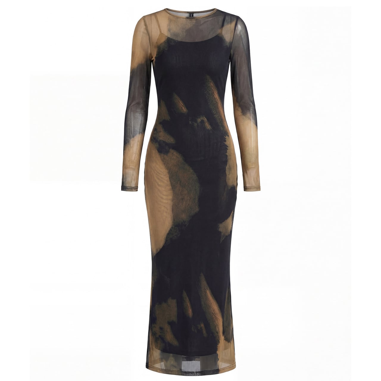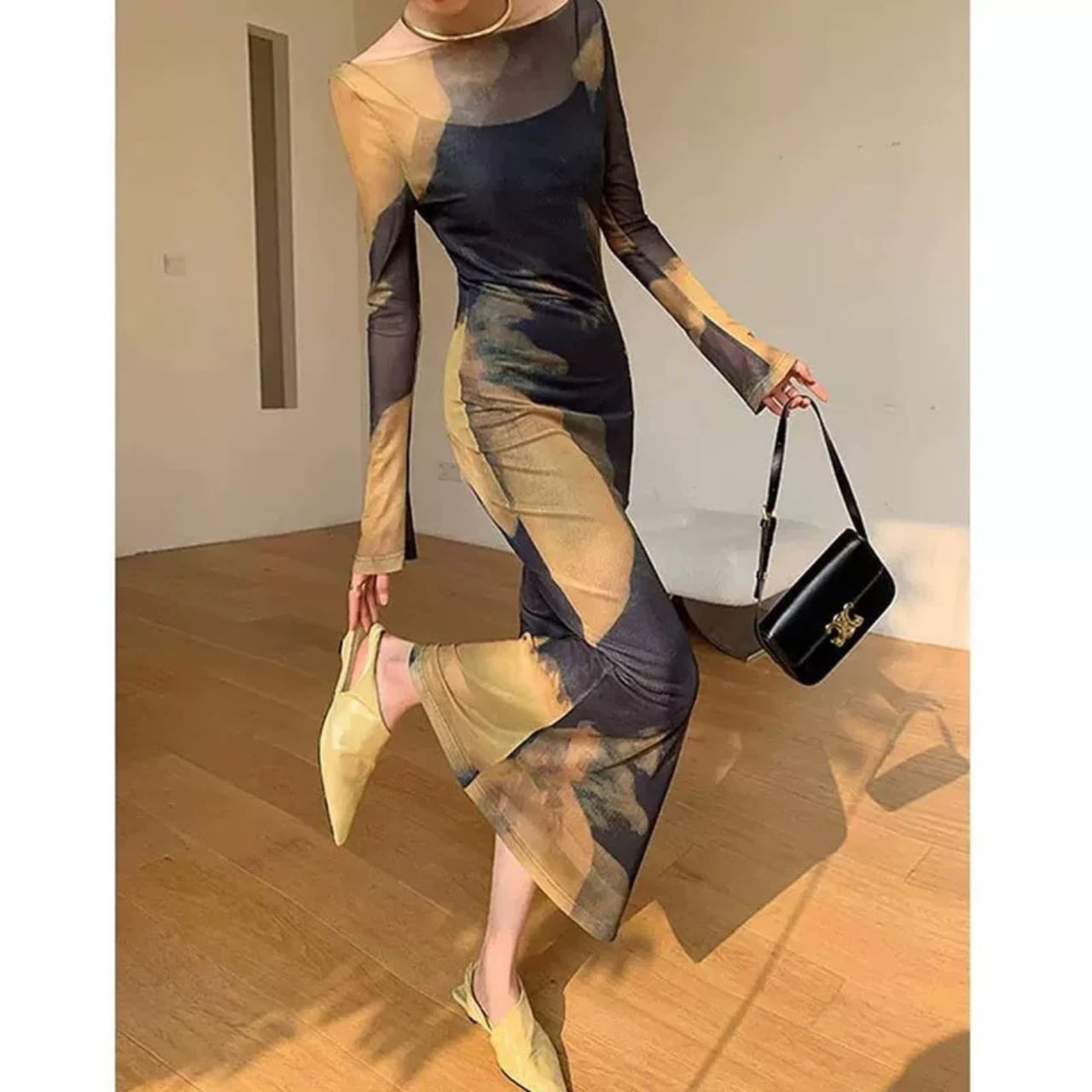 ブラック×アースカラーのアブストラクト柄が、着る人の動きに合わせて表情を変え、まるで一枚のアート作品のように纏わりつきます。