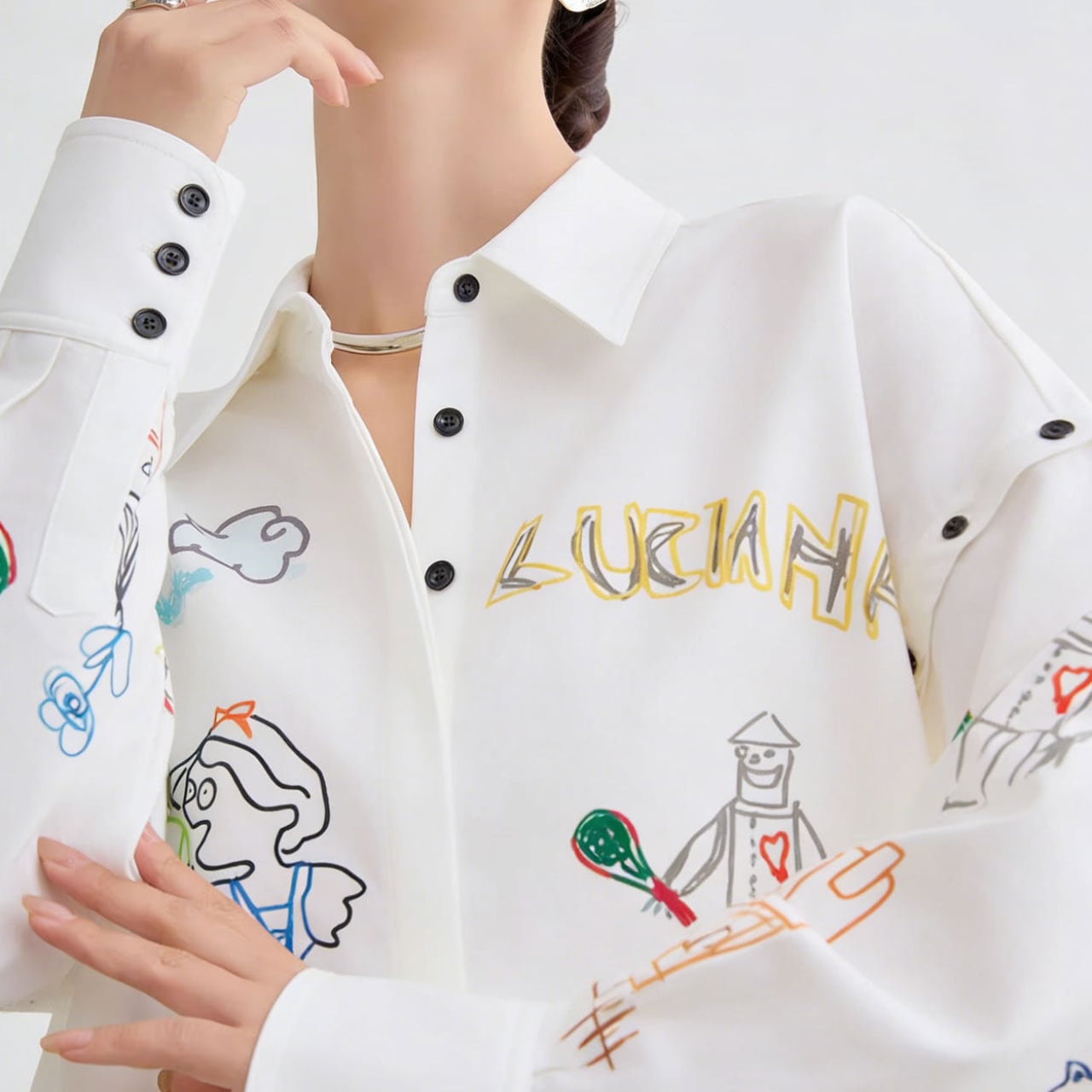 子どもが無邪気にノートに描いたような、自由奔放なグラフィティイラストが全面に躍る、遊び心あふれるオーバーサイズシャツ。