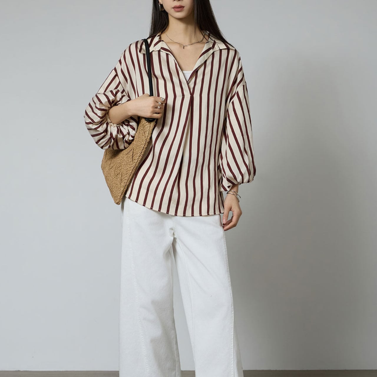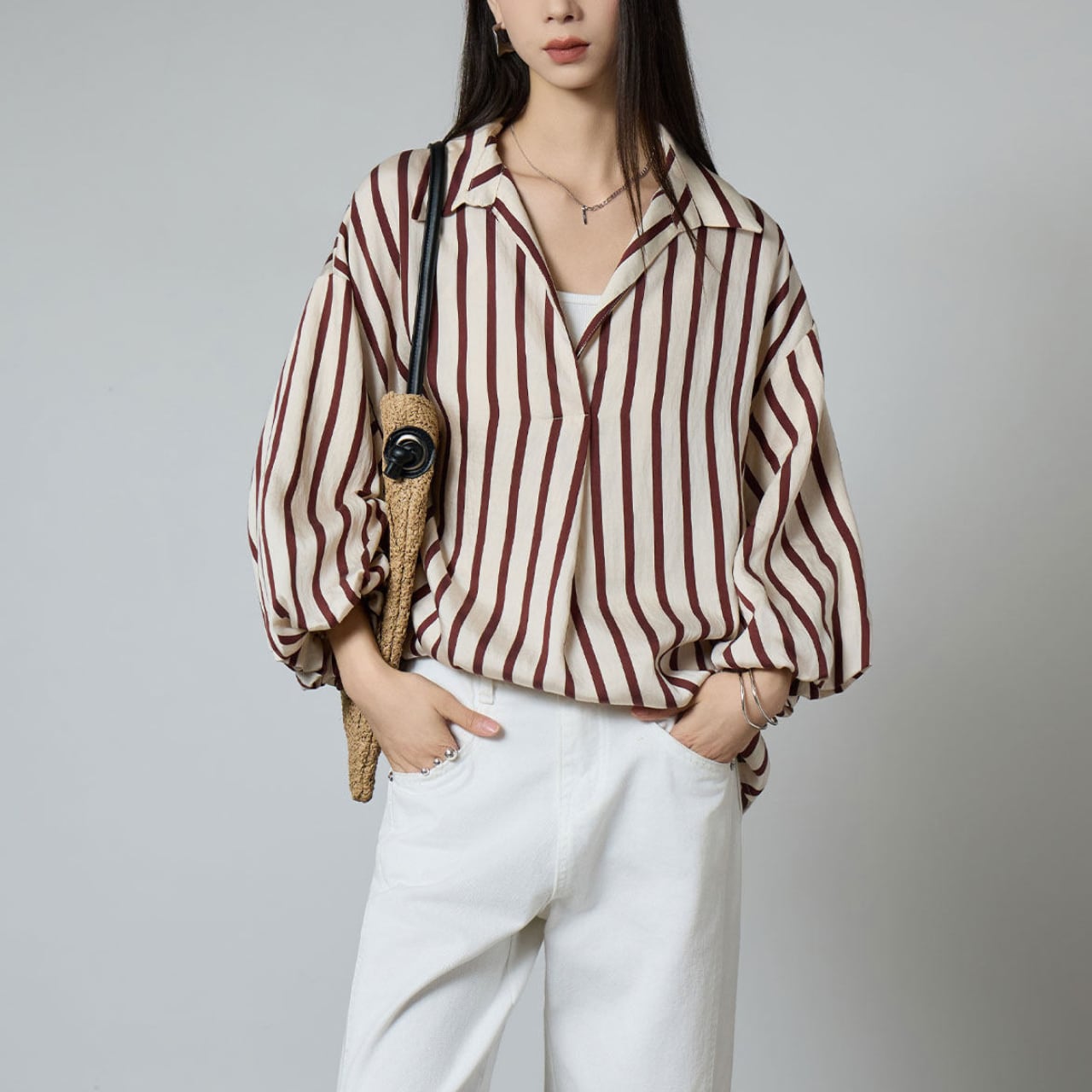 ゆったりとしたオーバーサイズのボディは、インにキャミソールやタンクトップを忍ばせてカジュアルに、白パンツやデニムと合わせれば、こなれたフレンチカジュアルスタイルが完成。