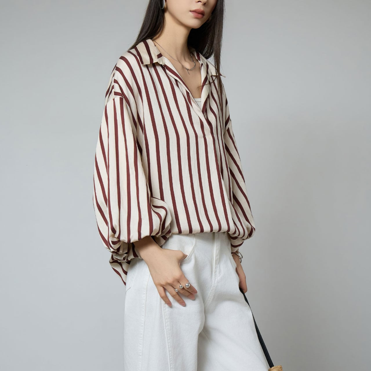 Striped V-neck puff-sleeve shirt S1914