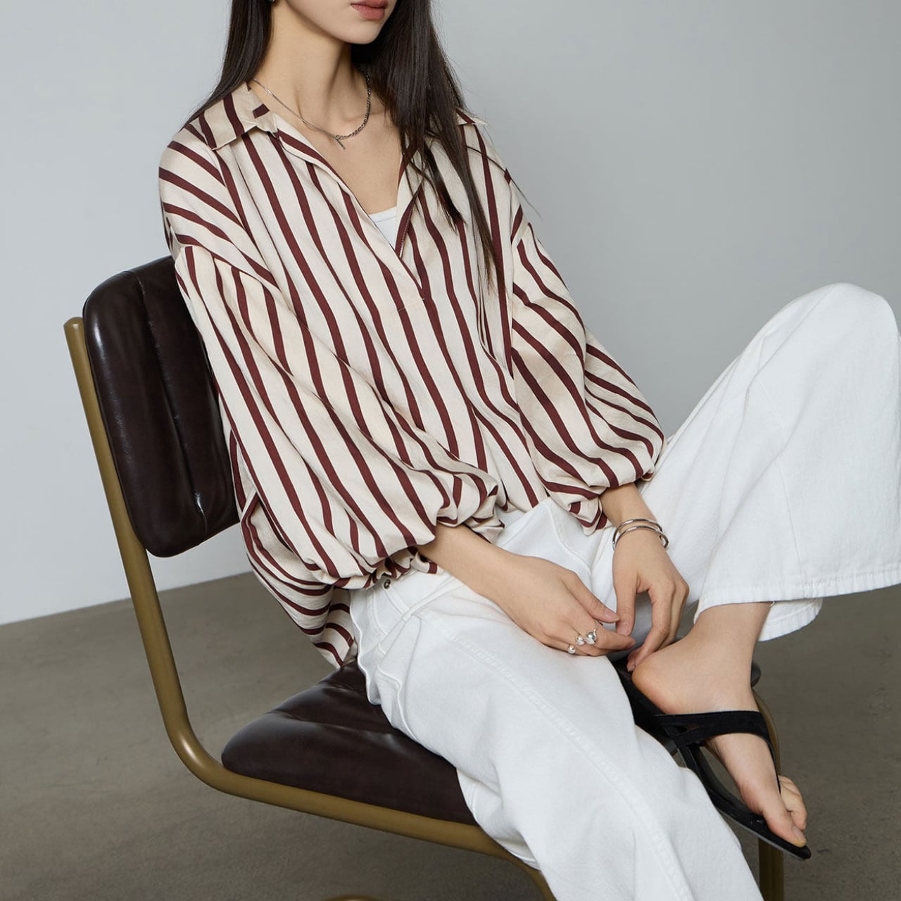 Vネックの深めの開きが顔まわりをスッキリと引き立て、デコルテの美しさを引き出します。