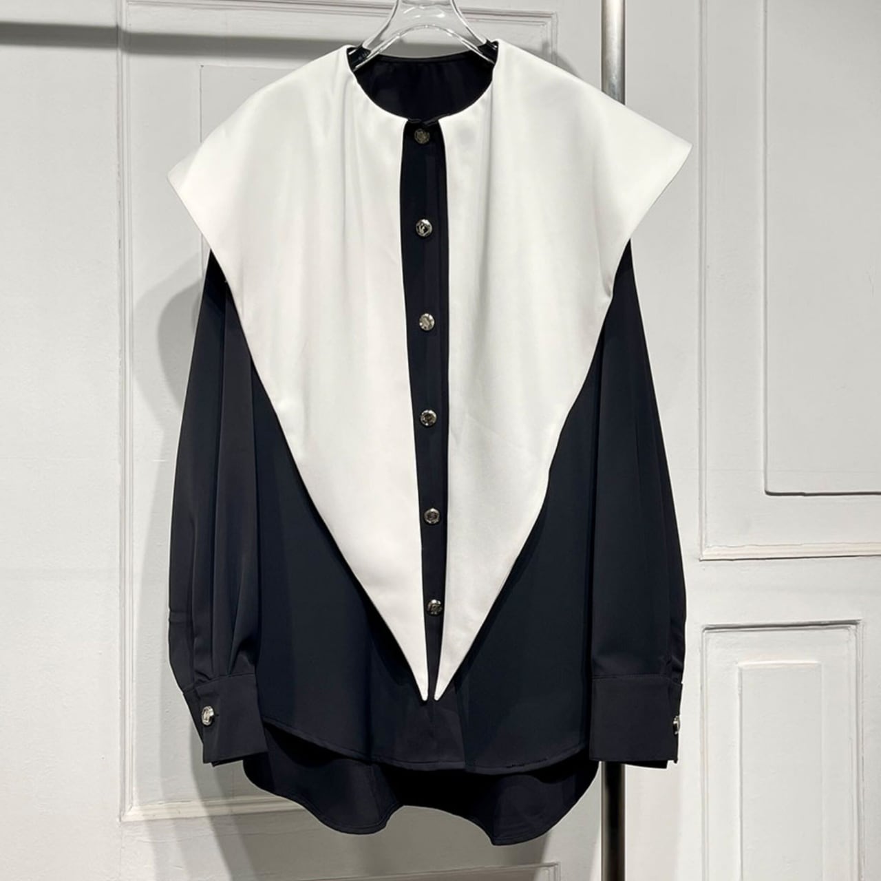 胸元から大きくV字に広がるケープ風のフロントパネルが、シャツにドラマティックな存在感をもたらします。