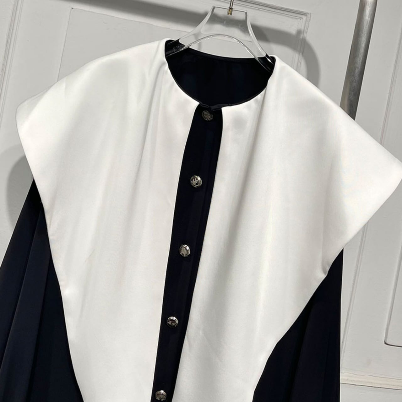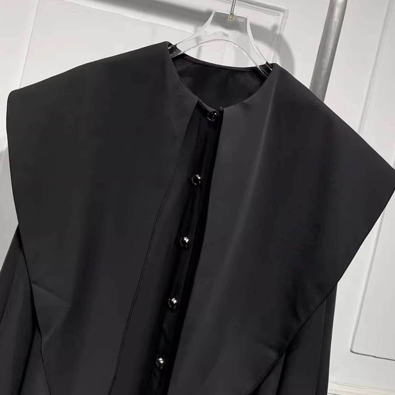 ゆったりとしたオーバーサイズのボディとケープの重なりが、肩から胸にかけてのラインを美しく構築し、着るだけで"作られたシルエット"を纏えます。