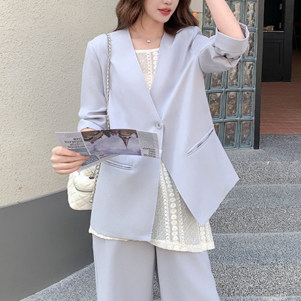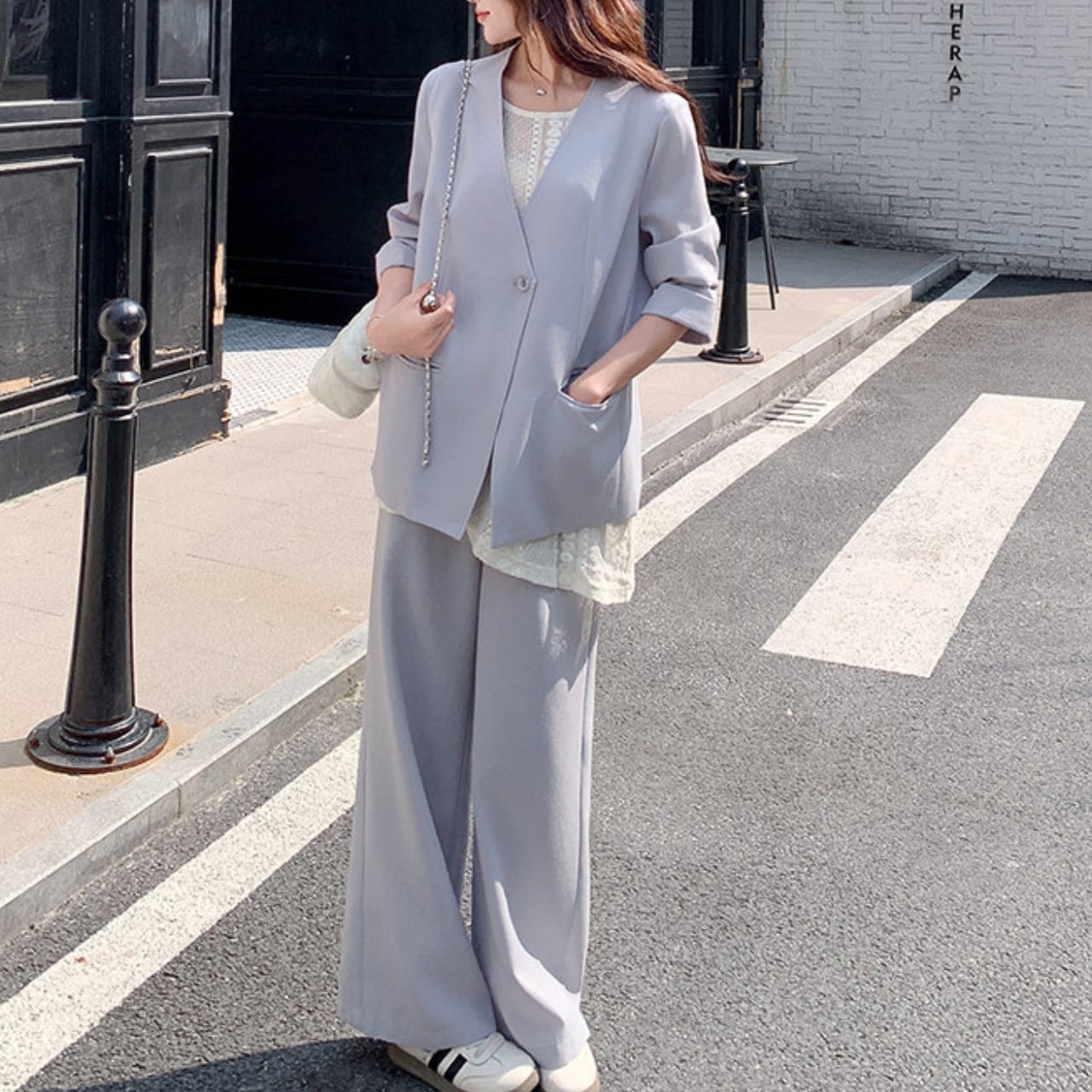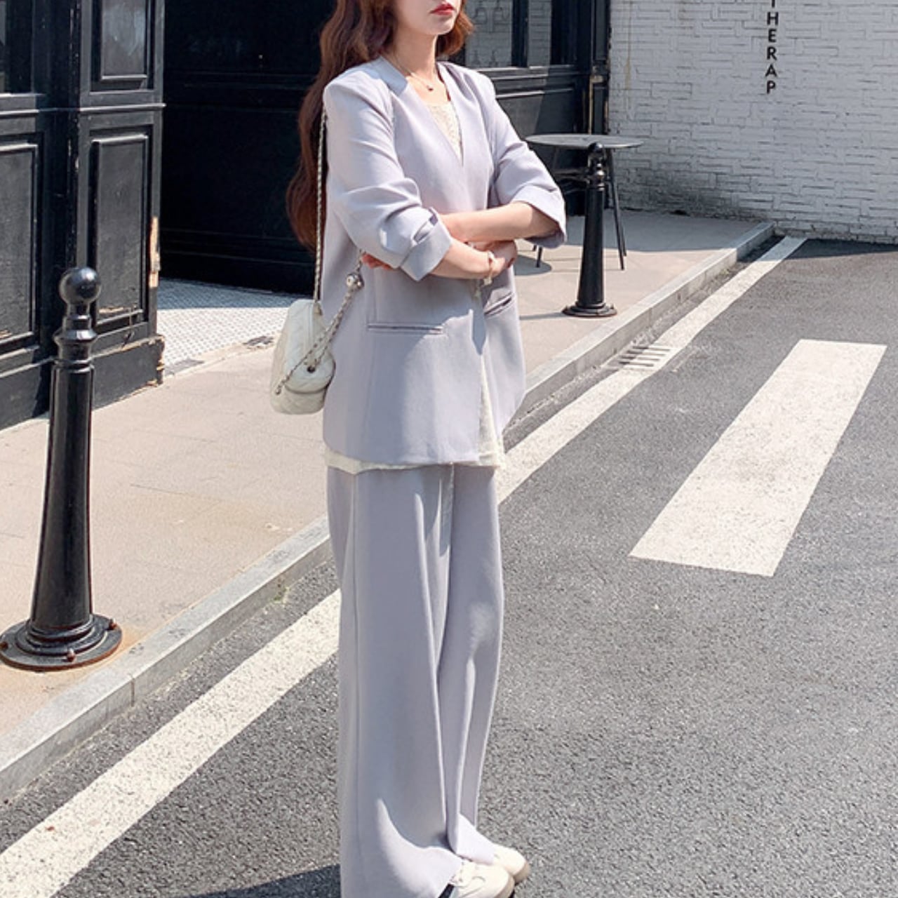 ジャケット・レースベスト・ワイドパンツの三点が絶妙なバランスで揃ったセットアップが、着るだけでスタイリングを完成させます。