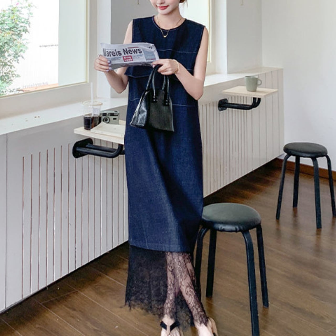 すっきりとしたノースリーブデザインが腕まわりをほっそりと見せ、マキシ丈のシルエットが脚のラインをすらりと演出。