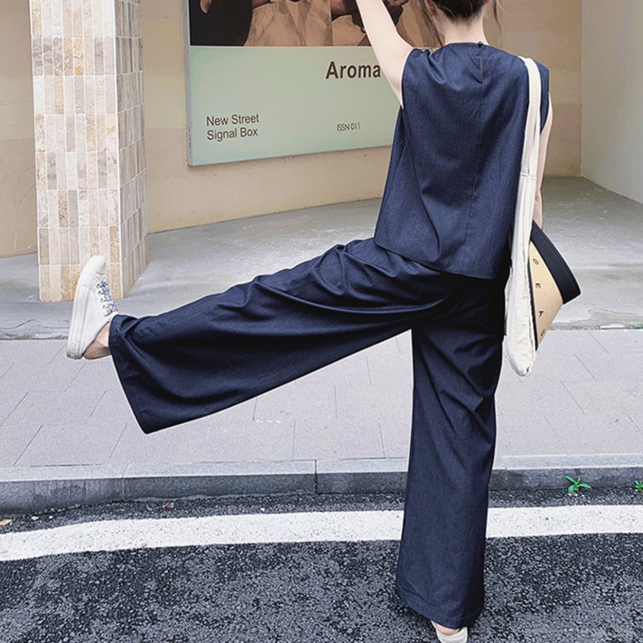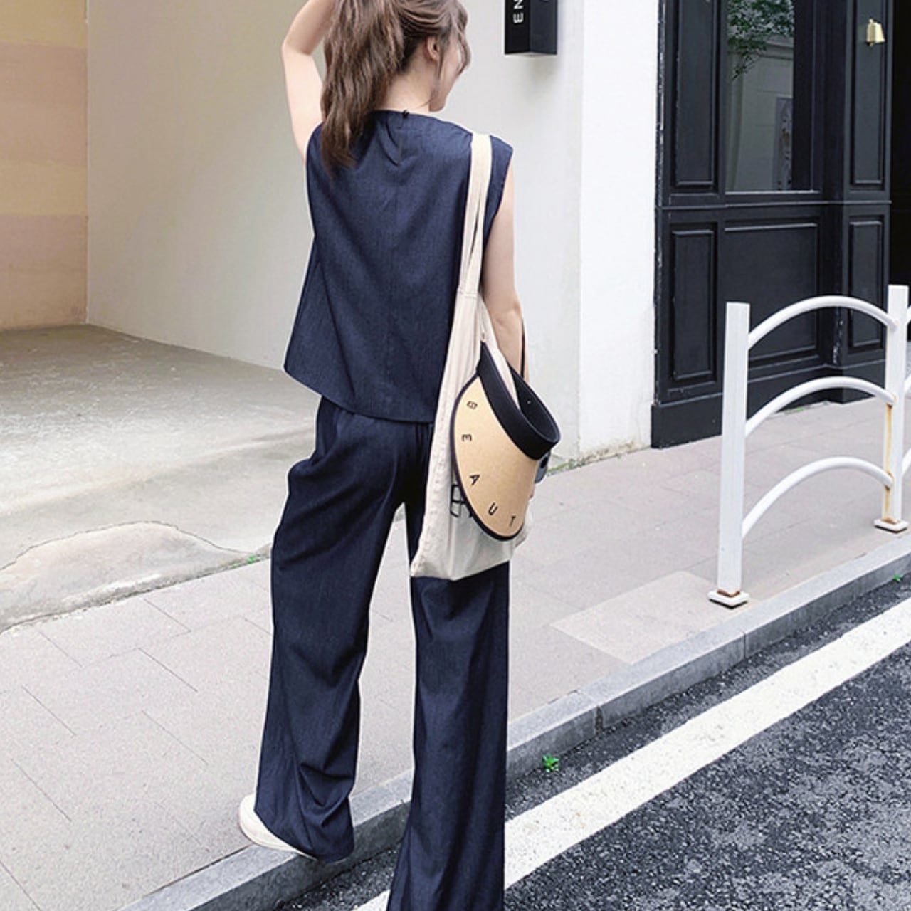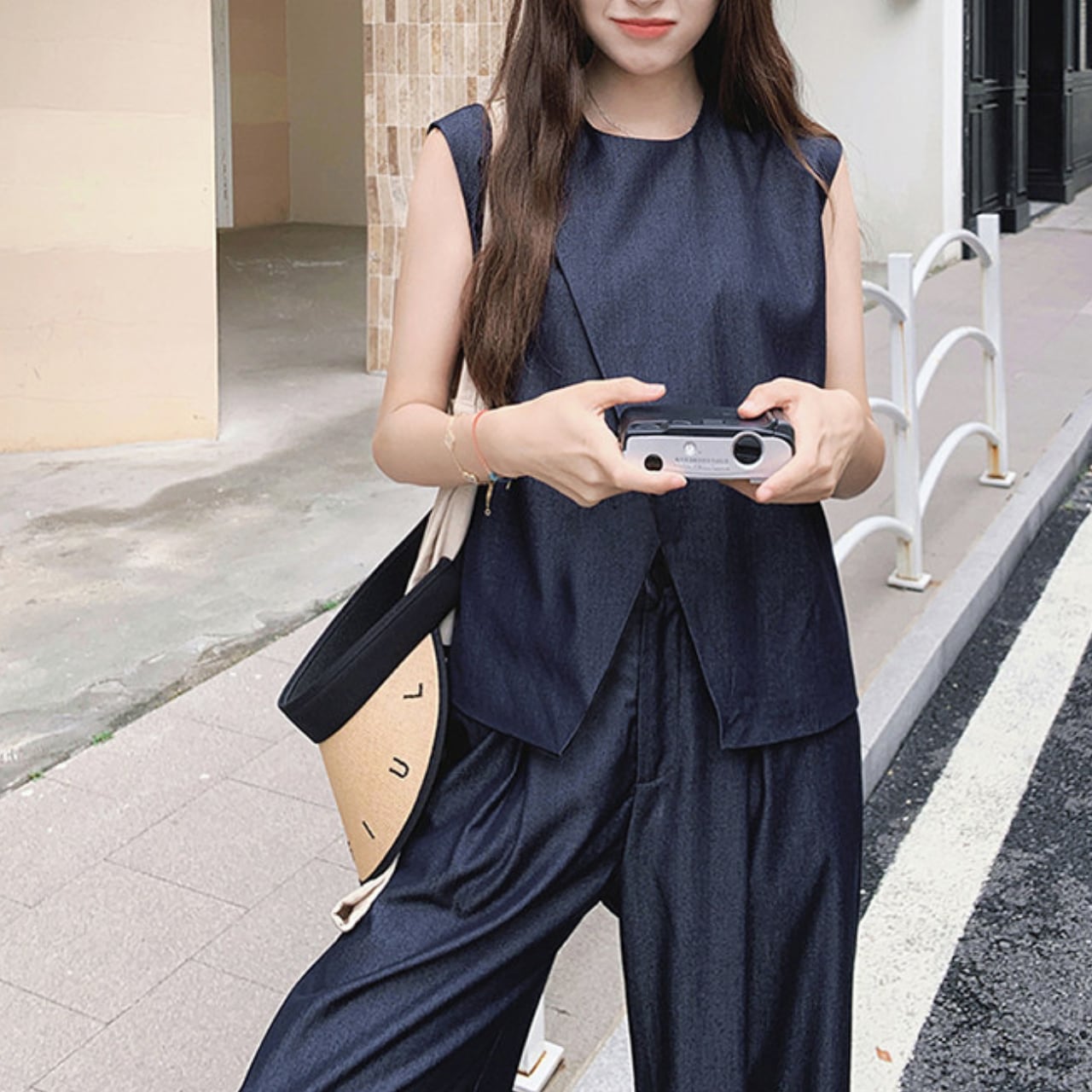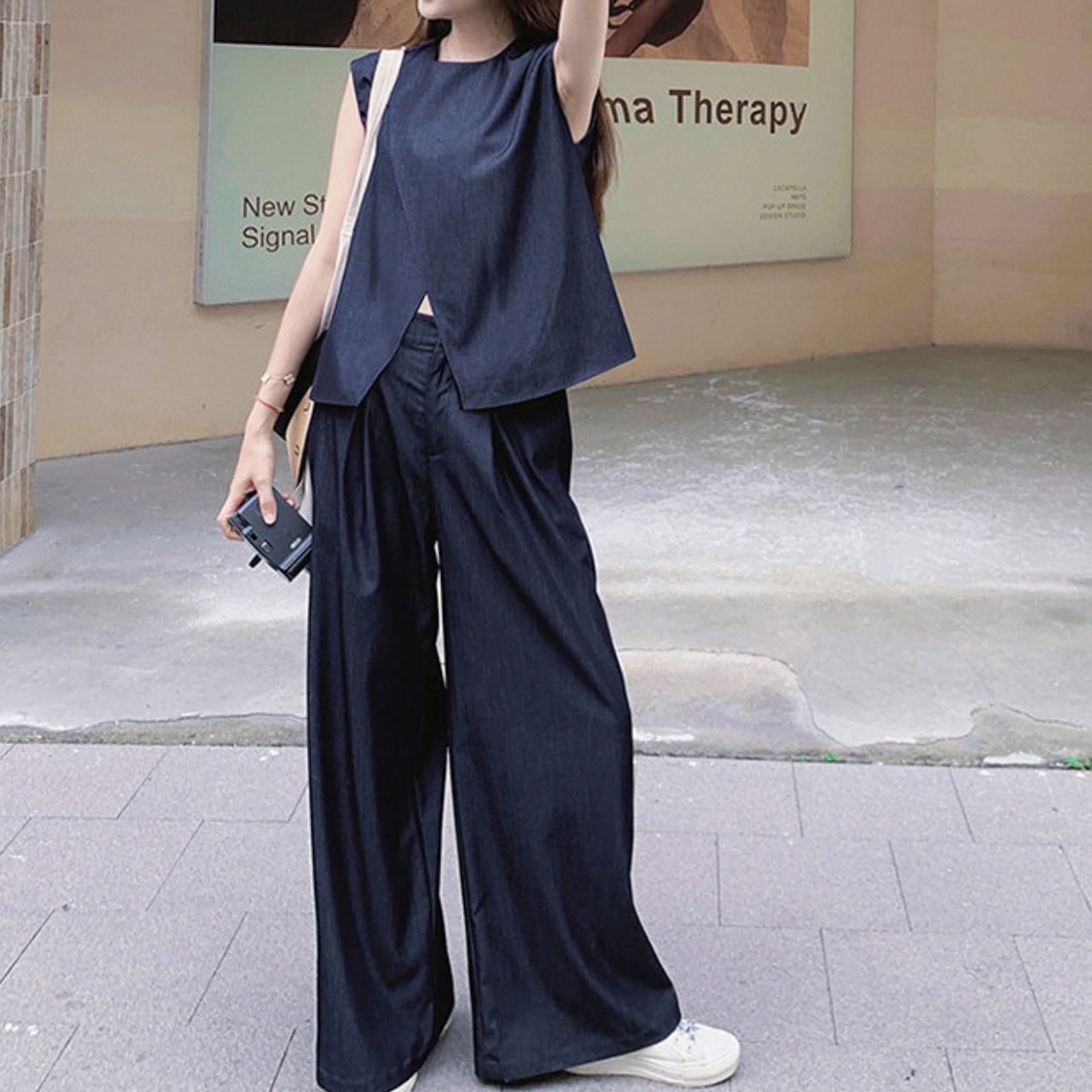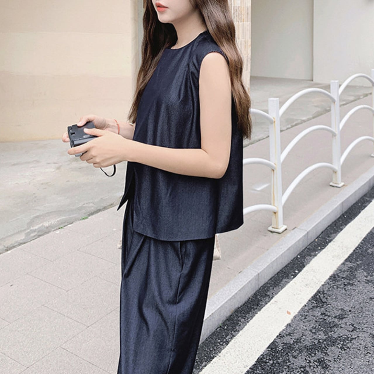 ミニマルでありながら一線を画す、ベスト×ワイドパンツのモードセットアップ。