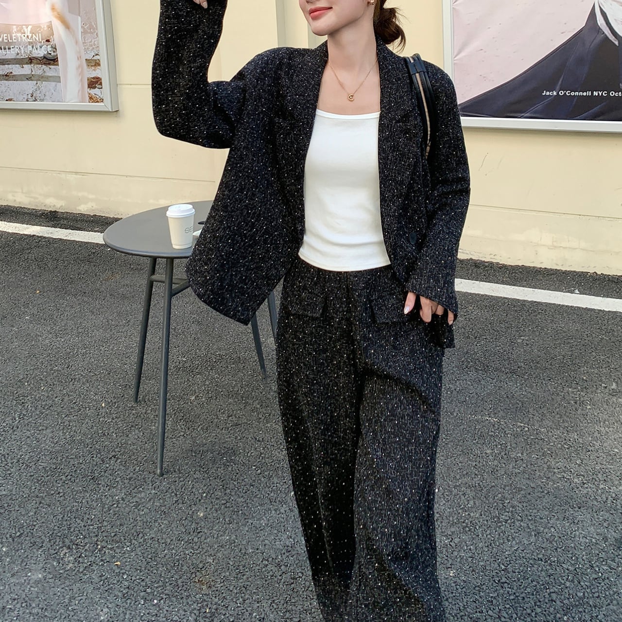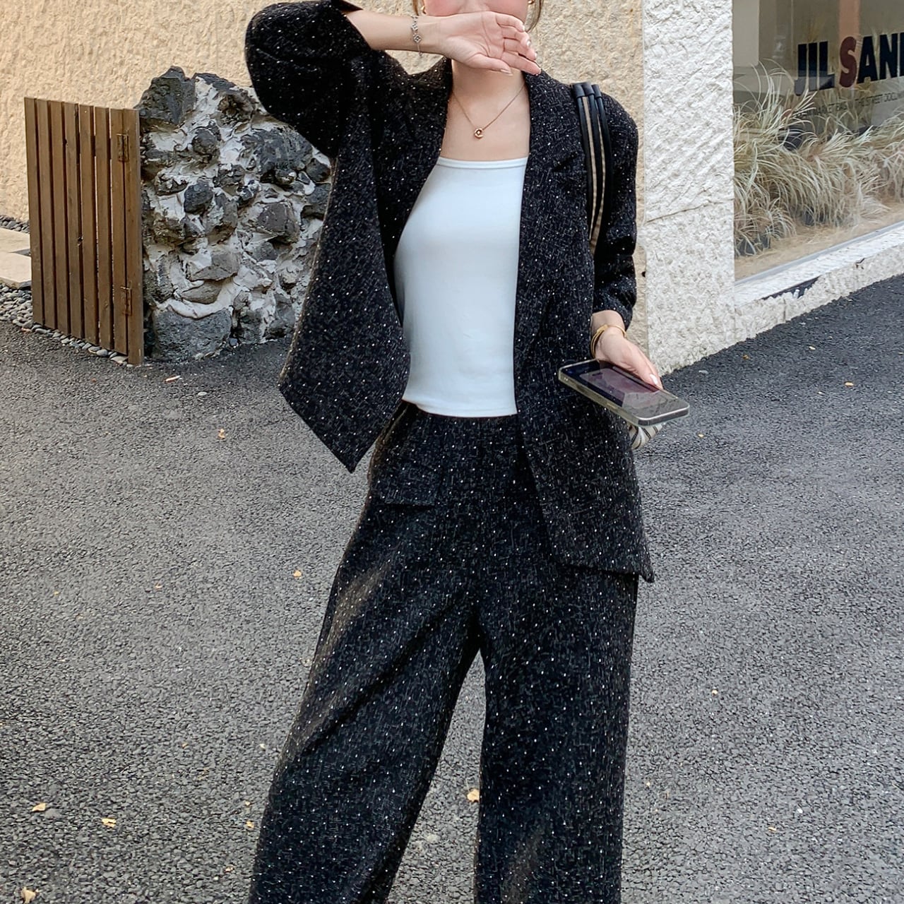 ・バッグや靴もカラーを合わせてオールブラックコーデ。