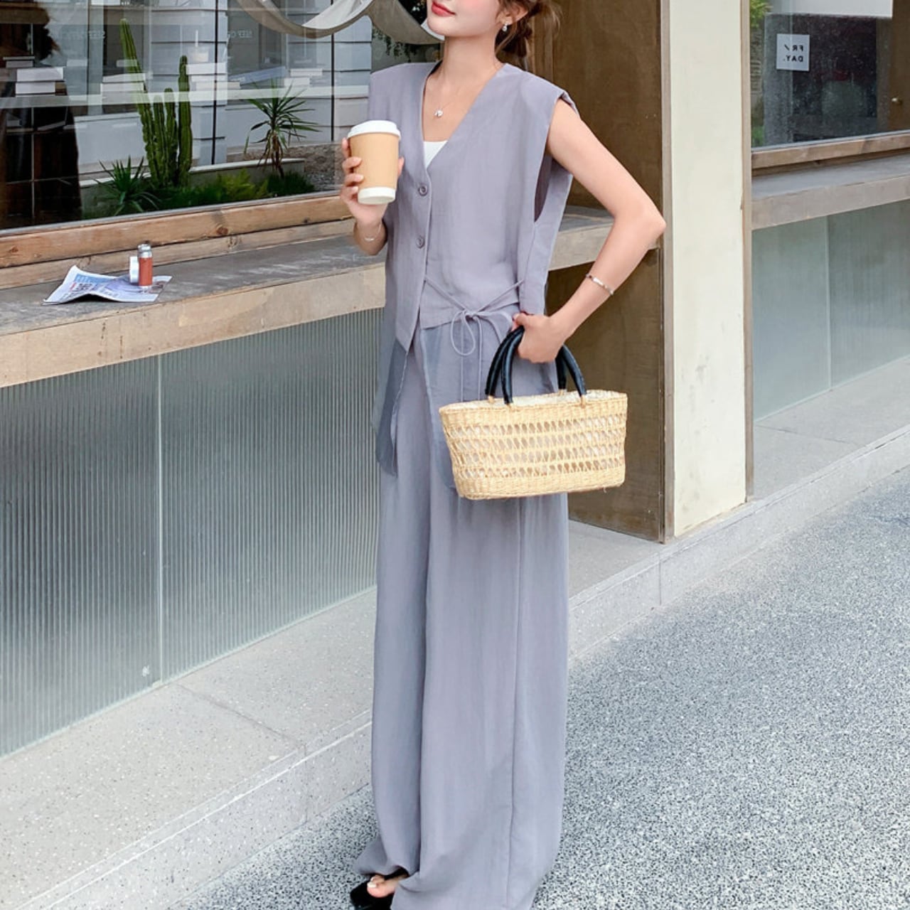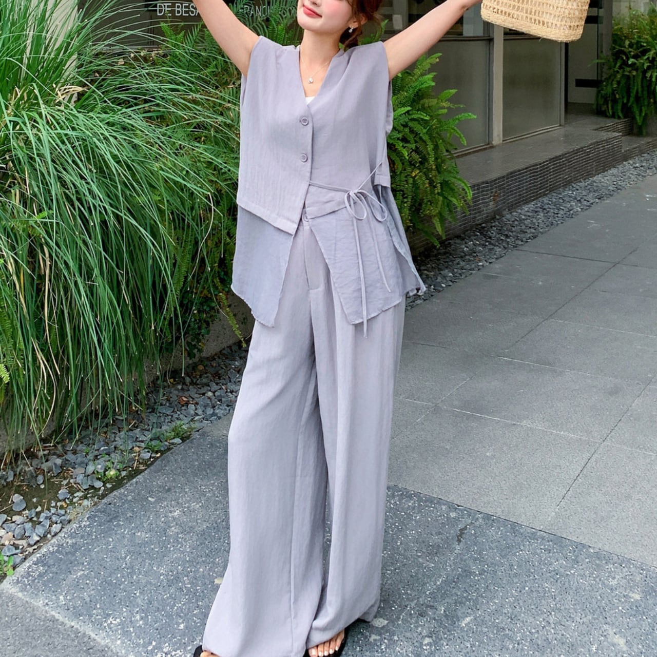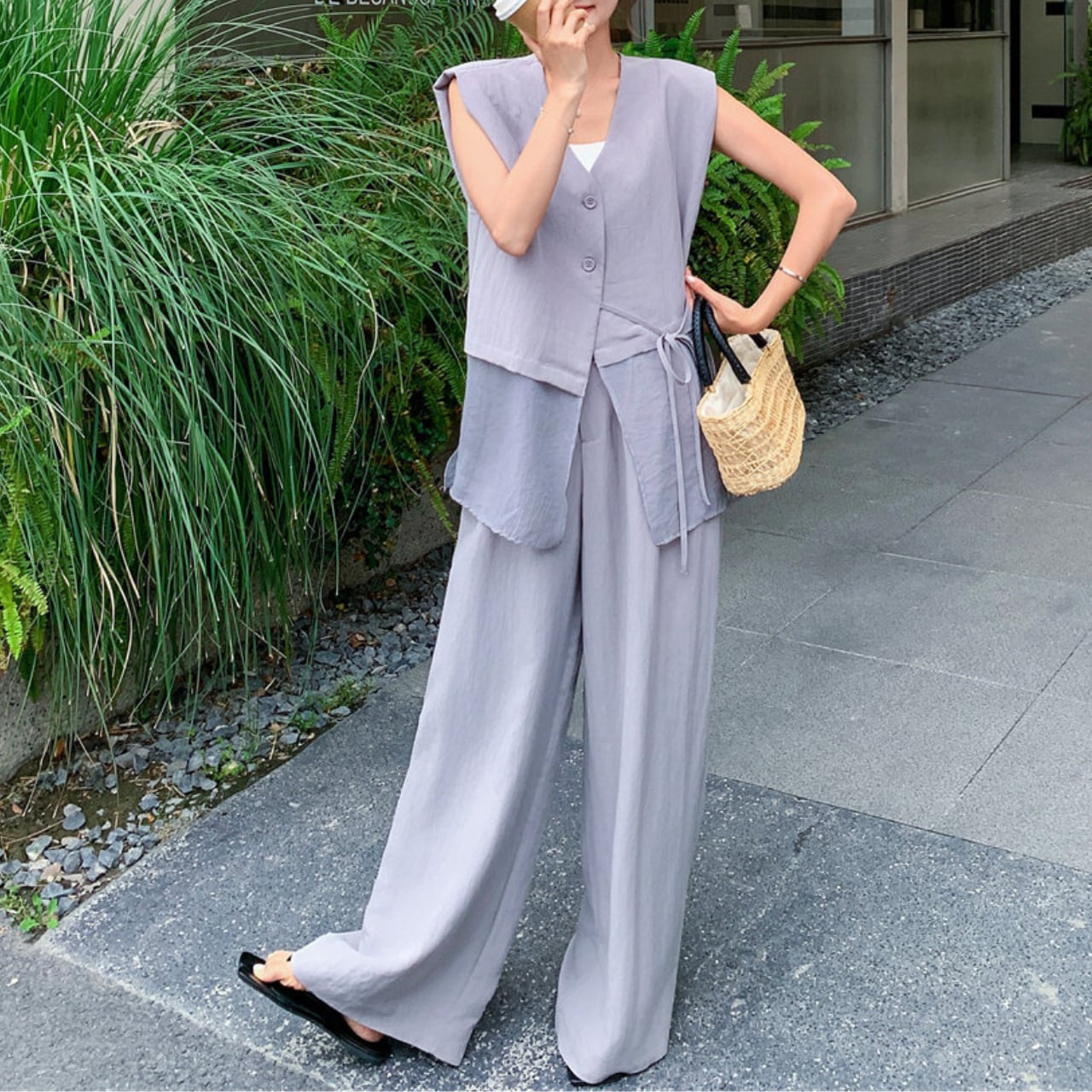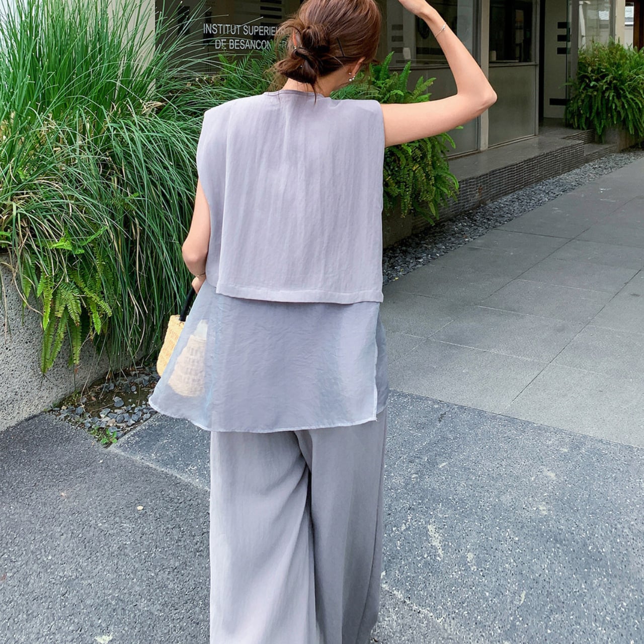 パープルカラーのノースリーブトップス&ワイドレッグパンツセット。