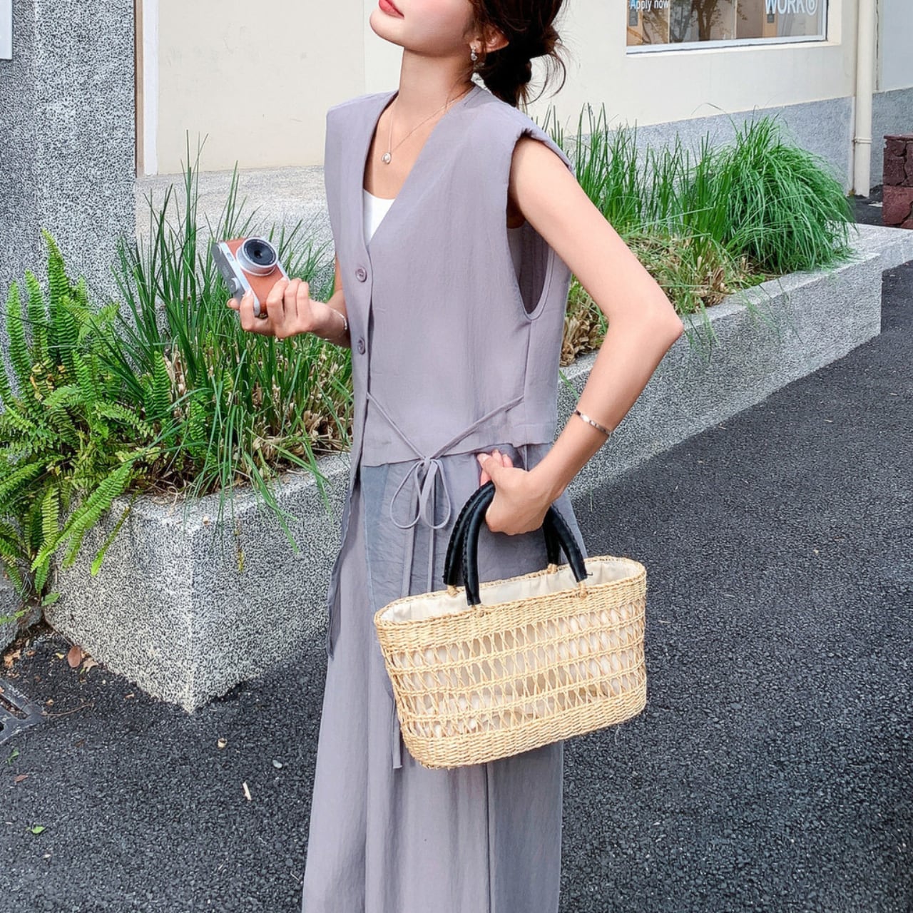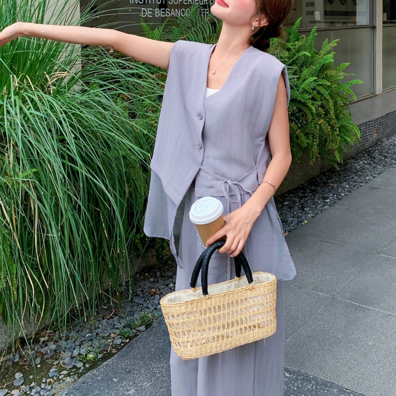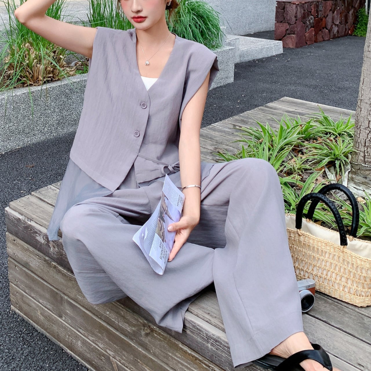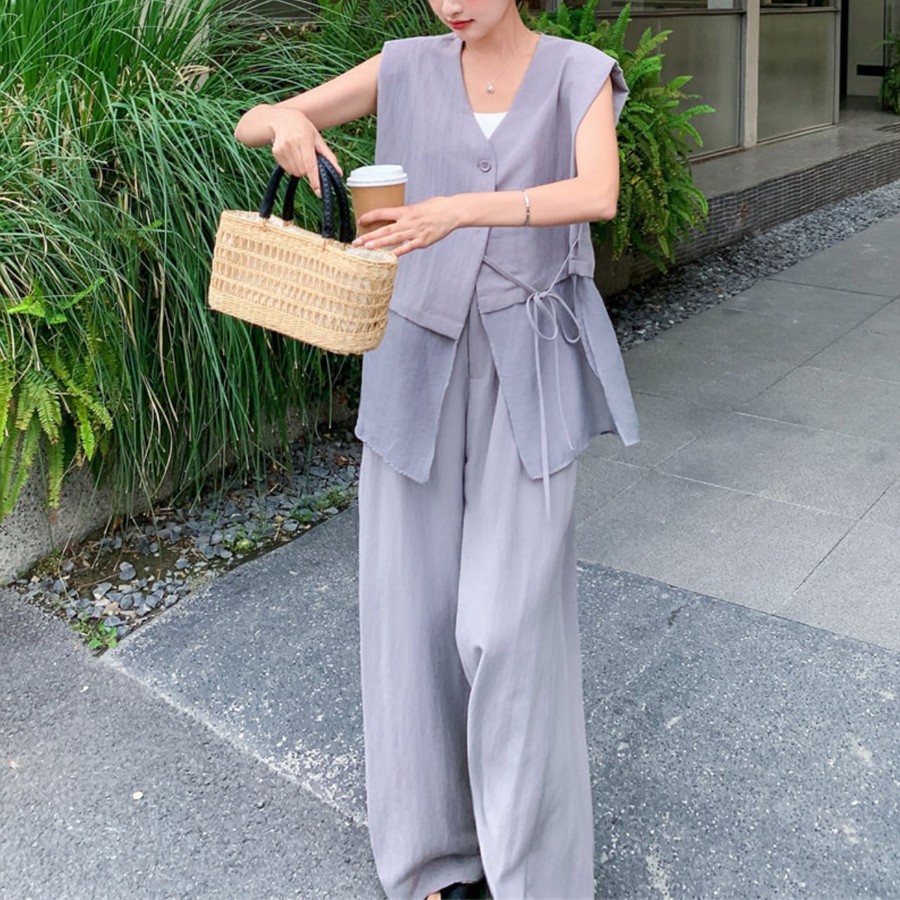 パープルカラーのノースリーブトップス&ワイドレッグパンツセット。