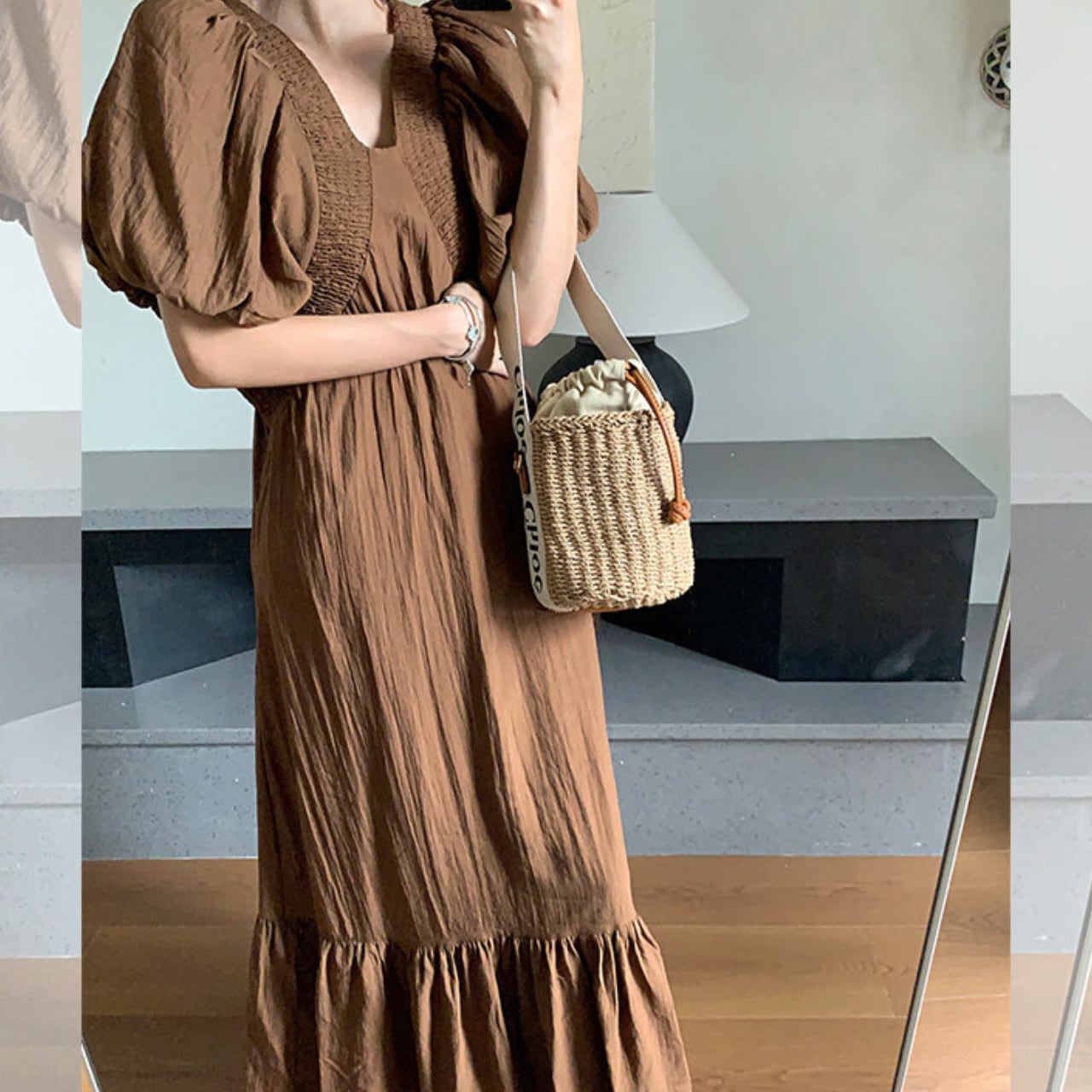 裾に向かって段階的に広がるティアードデザインは、動くたびに美しい立体感を演出。重層的なシルエットが体型をカバーしながら、女性らしい柔らかな印象を与えます。