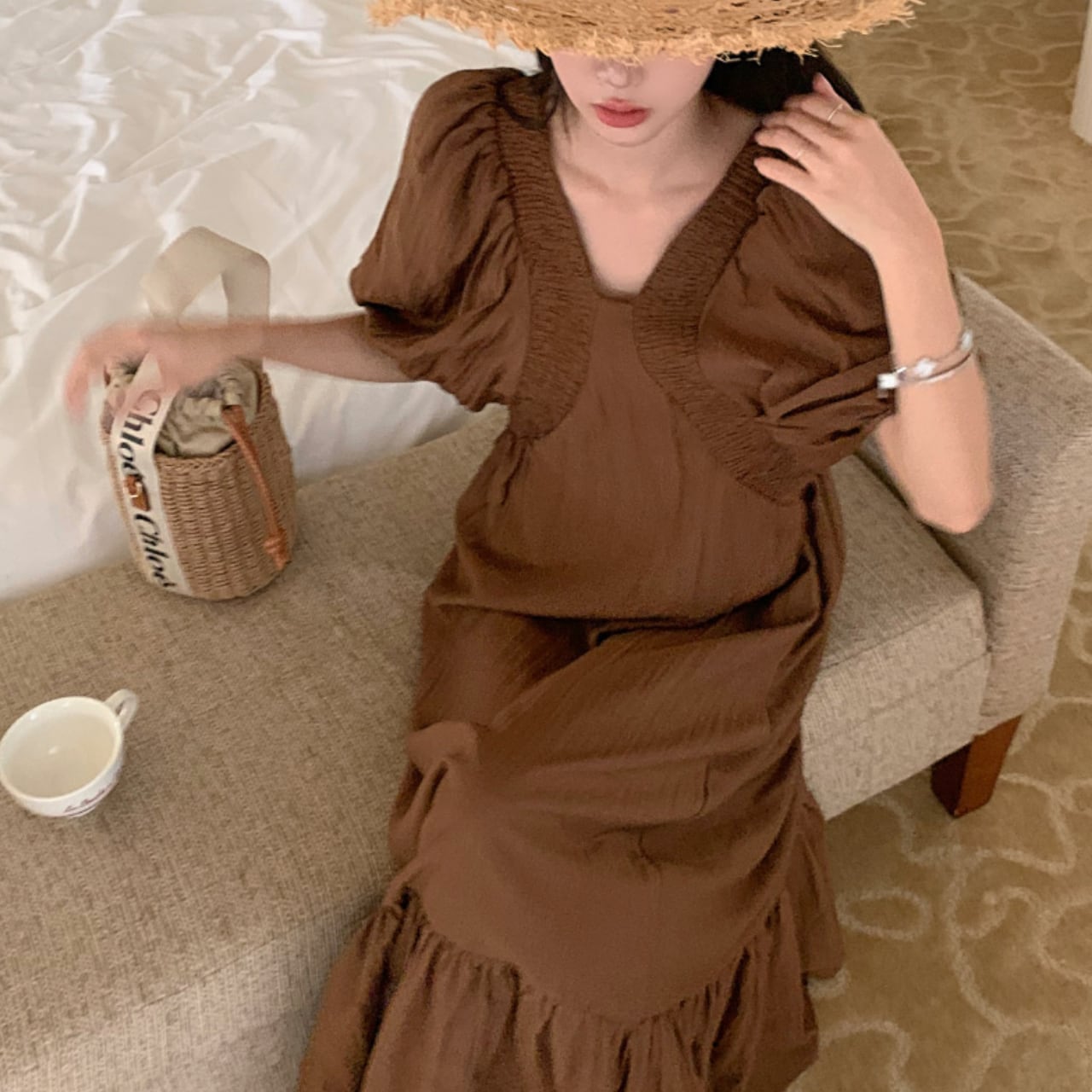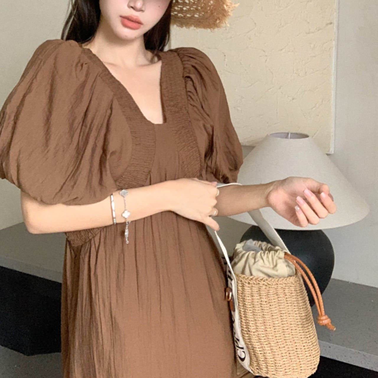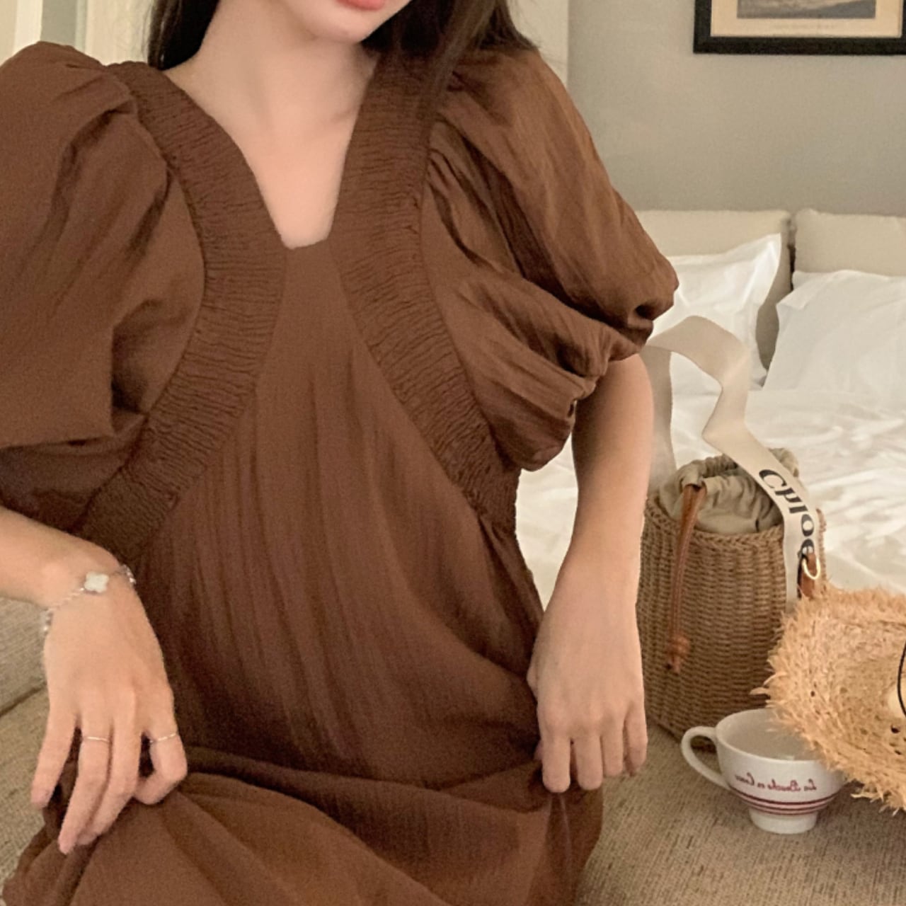 パフスリーブがふんわりとした印象を与えるVネックワンピース。