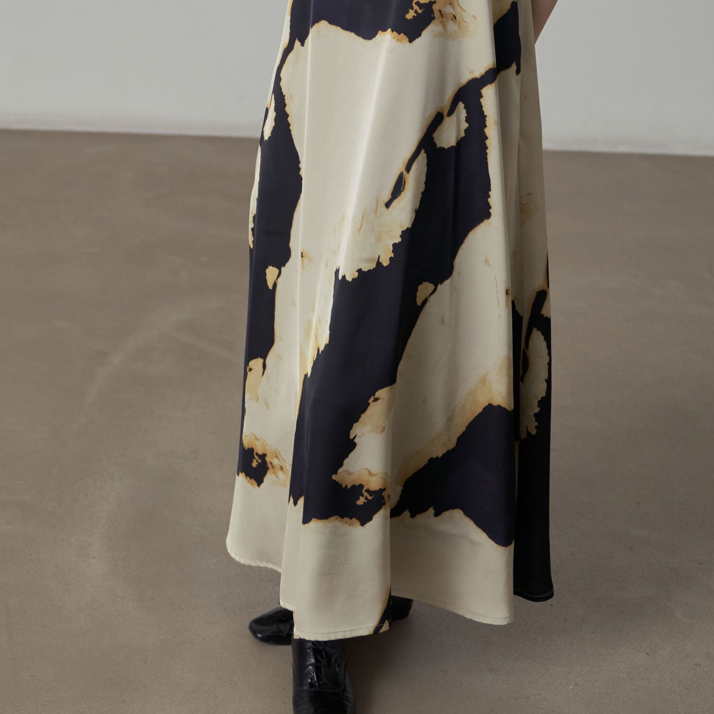 モノトーンベースに温かみのあるベージュを効かせた、まるで現代アートのような抽象的な柄が印象的。不規則で有機的なパターンが、着る人の個性を引き立てます。