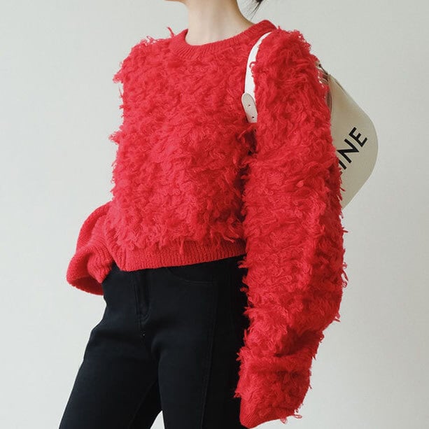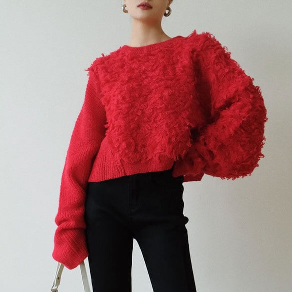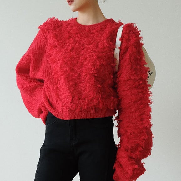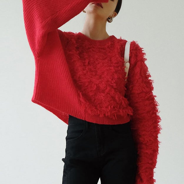 鮮やかなレッドに、左右で異なる表情を持たせたアシンメトリーデザインが印象的なニットセーター。