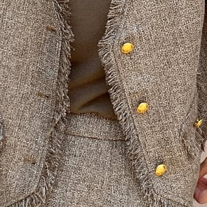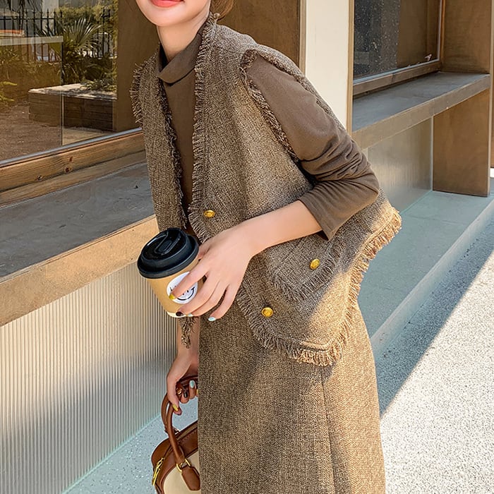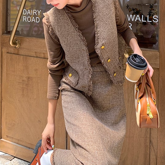 ベストは揺れるフリンジが動くたびに表情を変え、立体的でこなれた印象に。