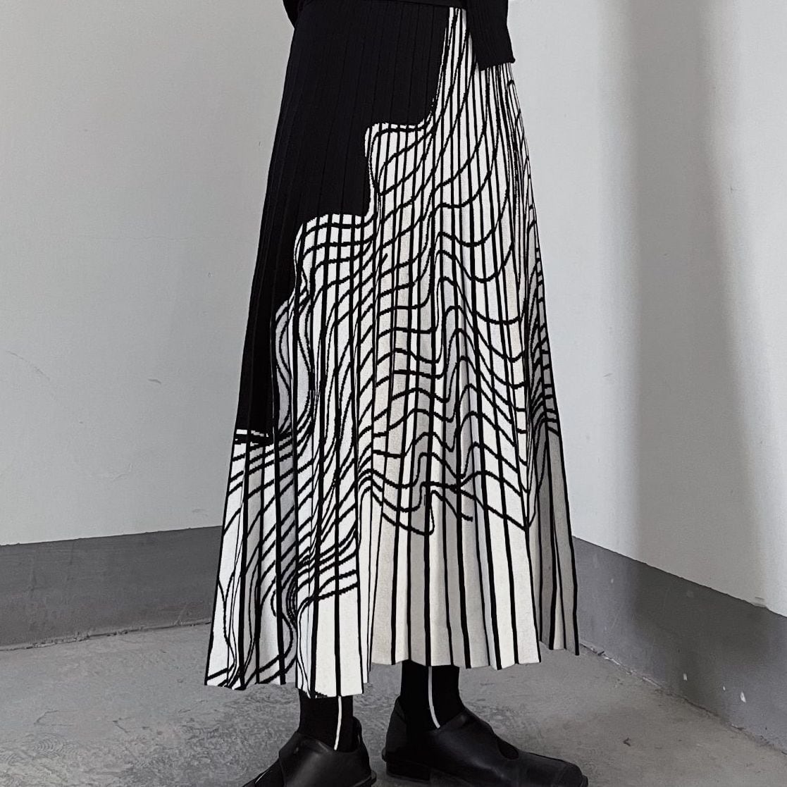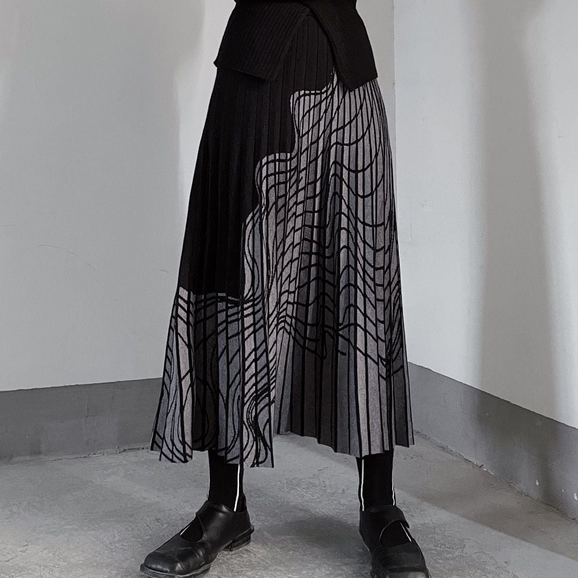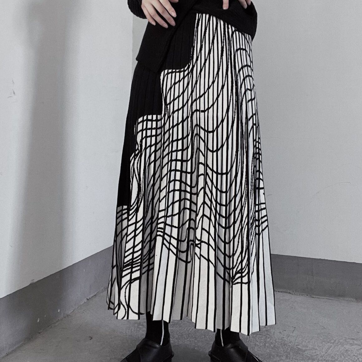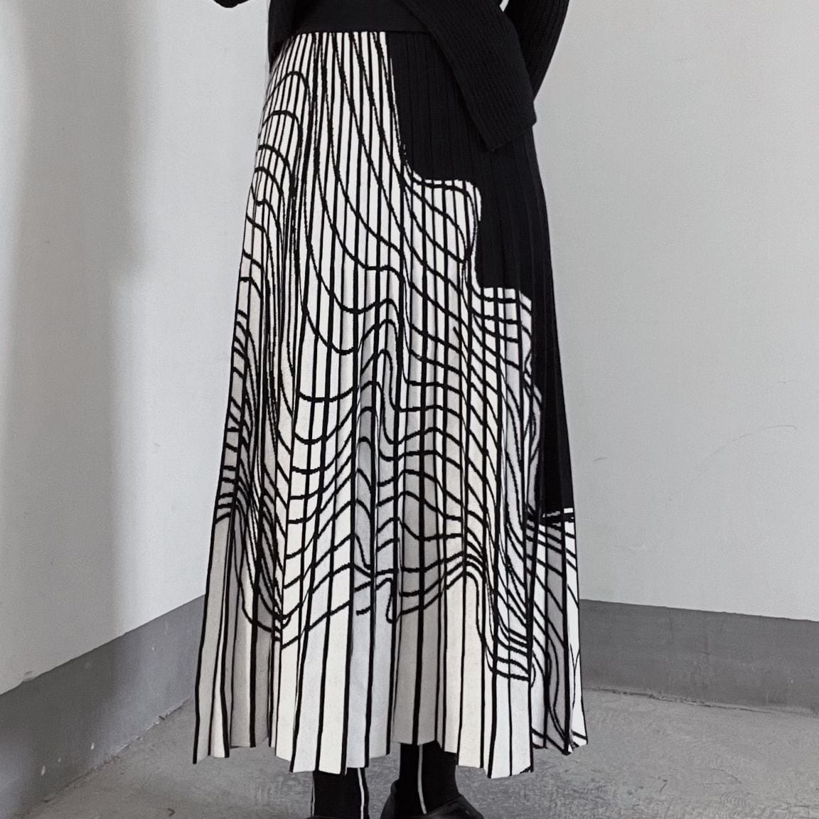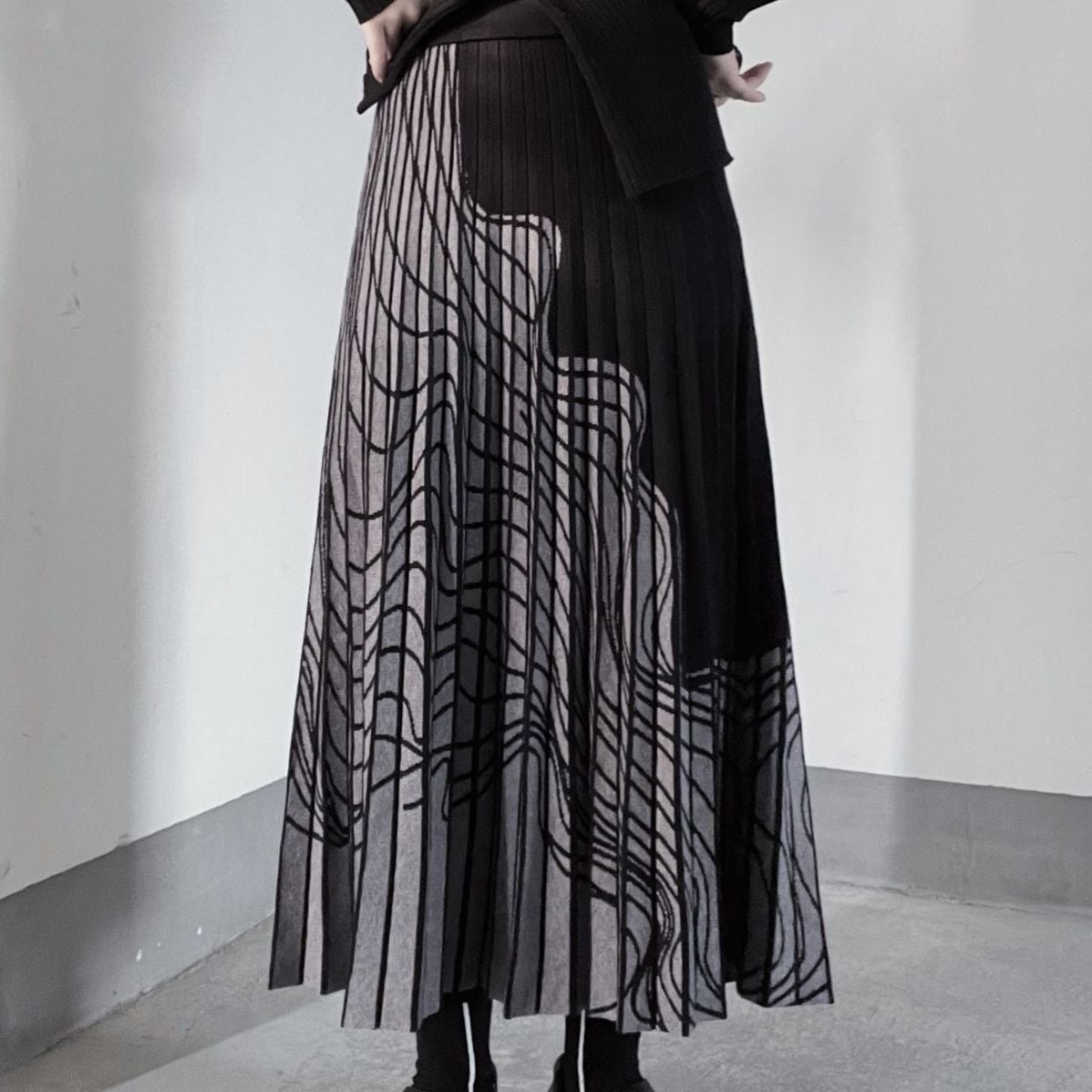 個性的なアート柄と美しいプリーツが融合した、上品で動きのあるスカート。