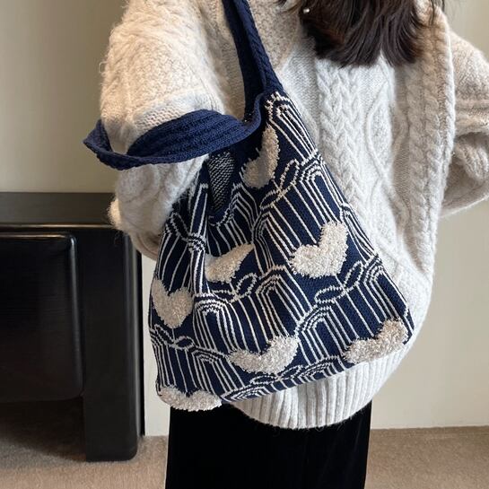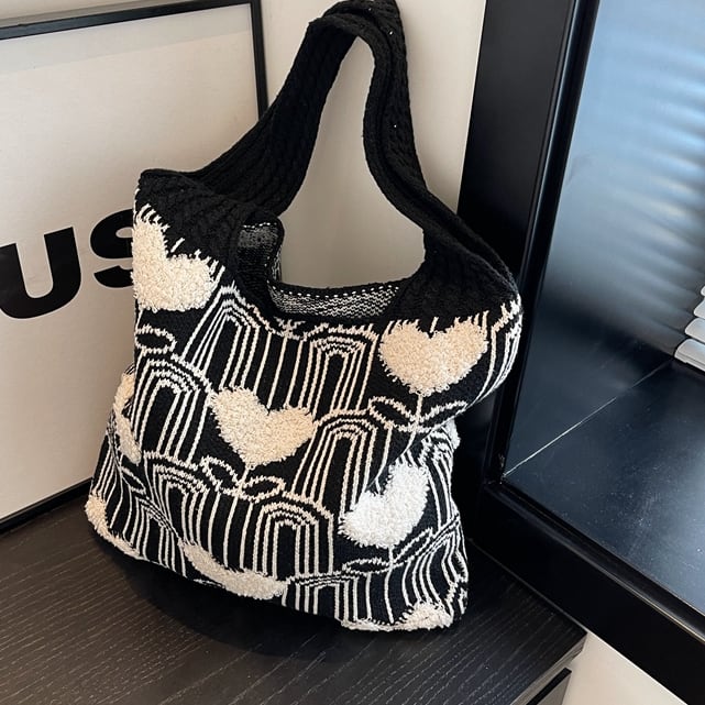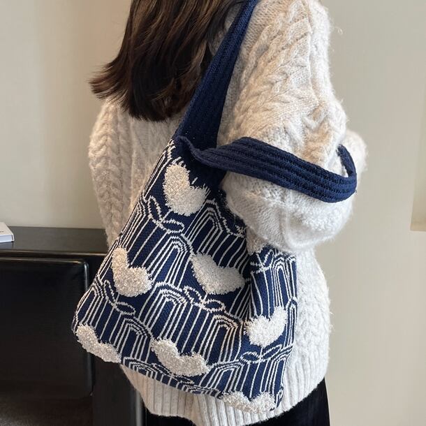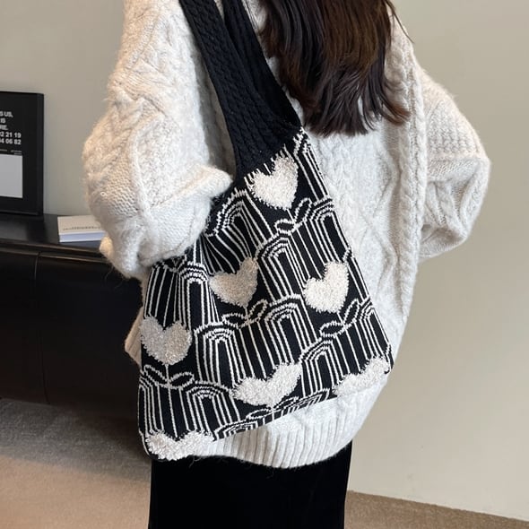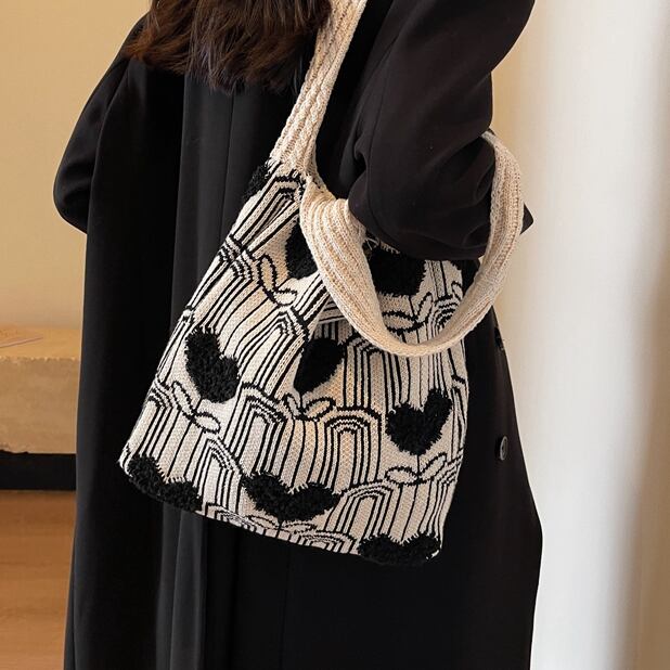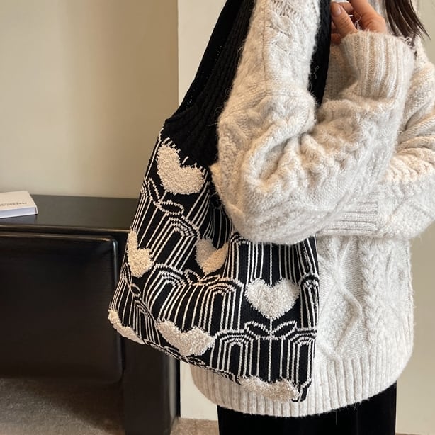 モノトーンで描かれたハート柄が、甘さと大人っぽさの絶妙なバランスを生み出すニットバッグ。「可愛いけど子供っぽくない」を実現した、大人の女性のためのハートデザインです。