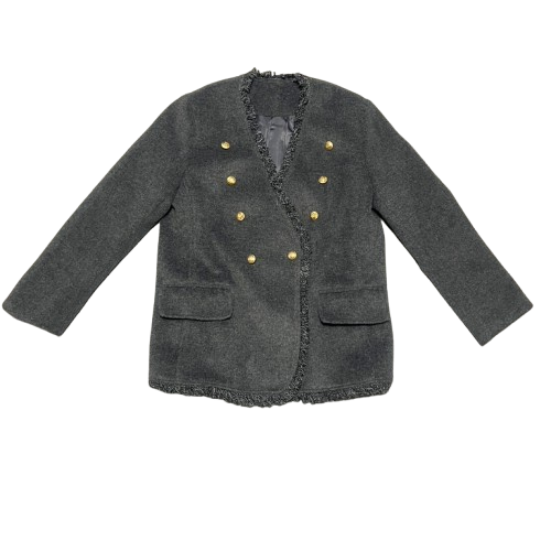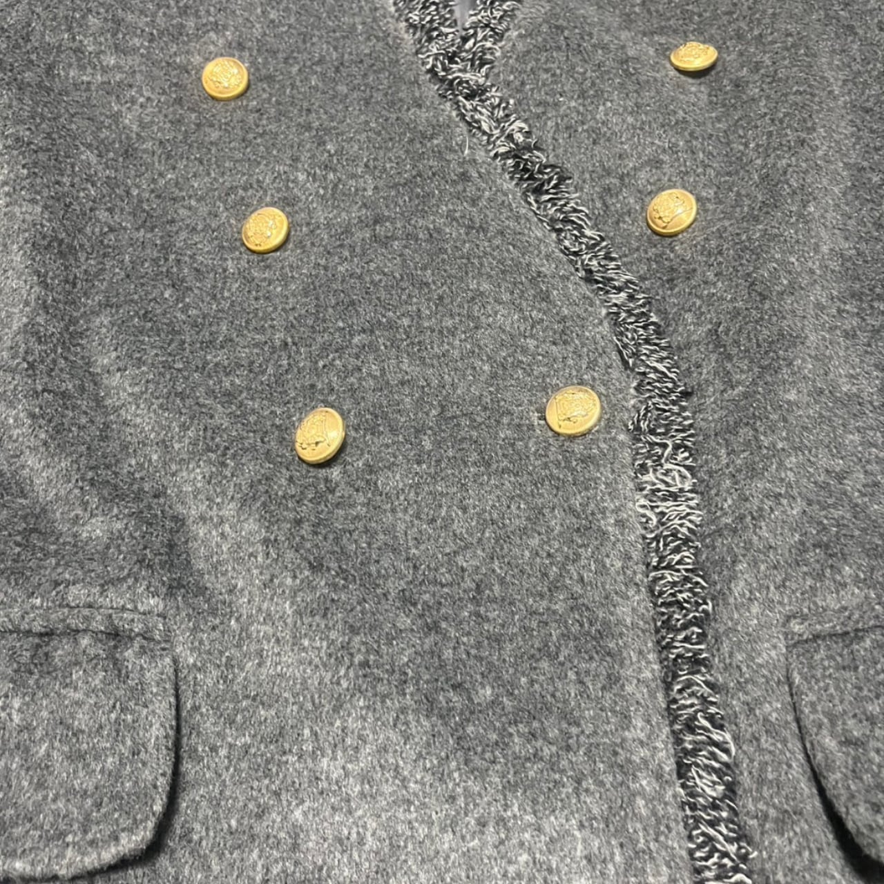 フロントを飾る大ぶりの金ボタンが一際目を引くノーカラージャケット。