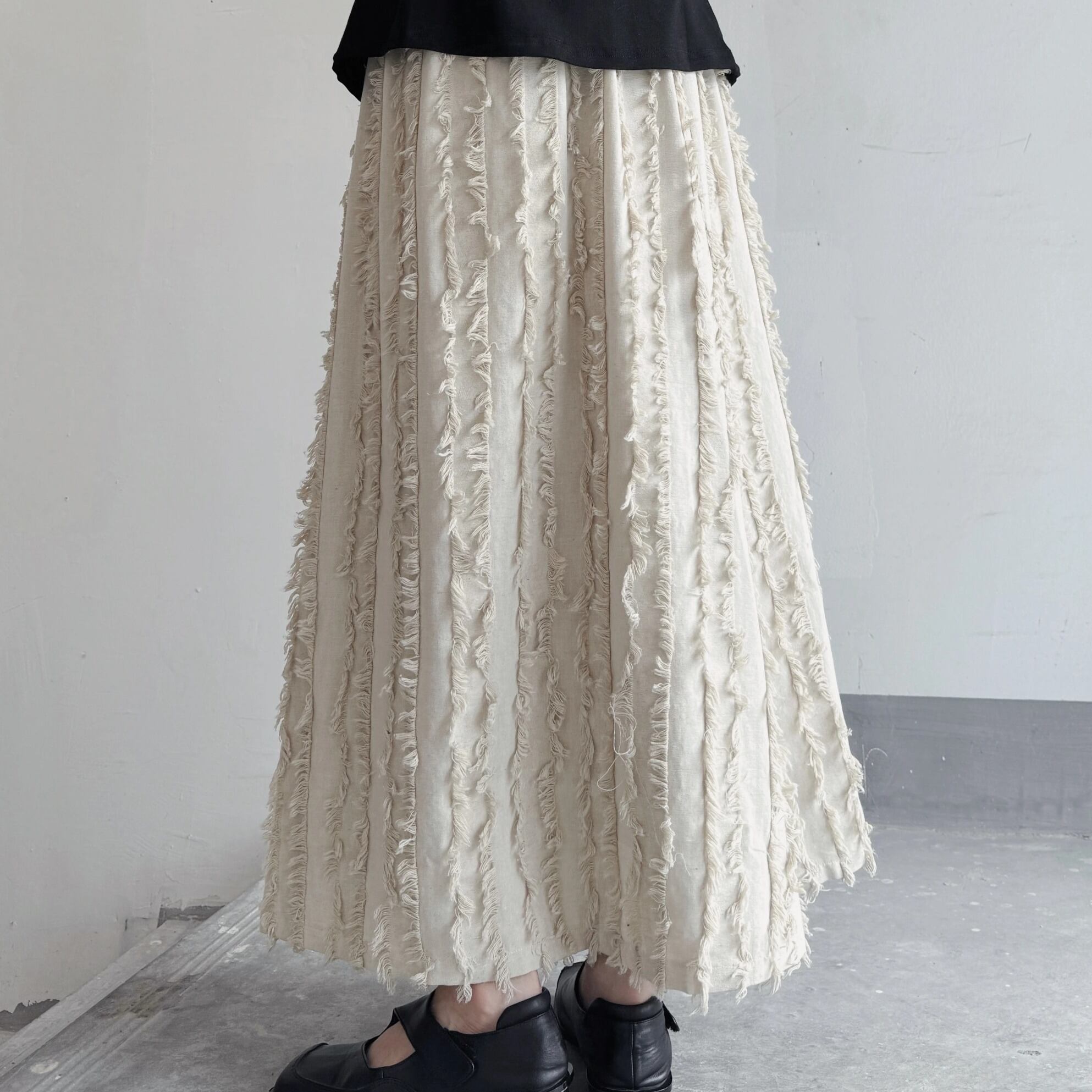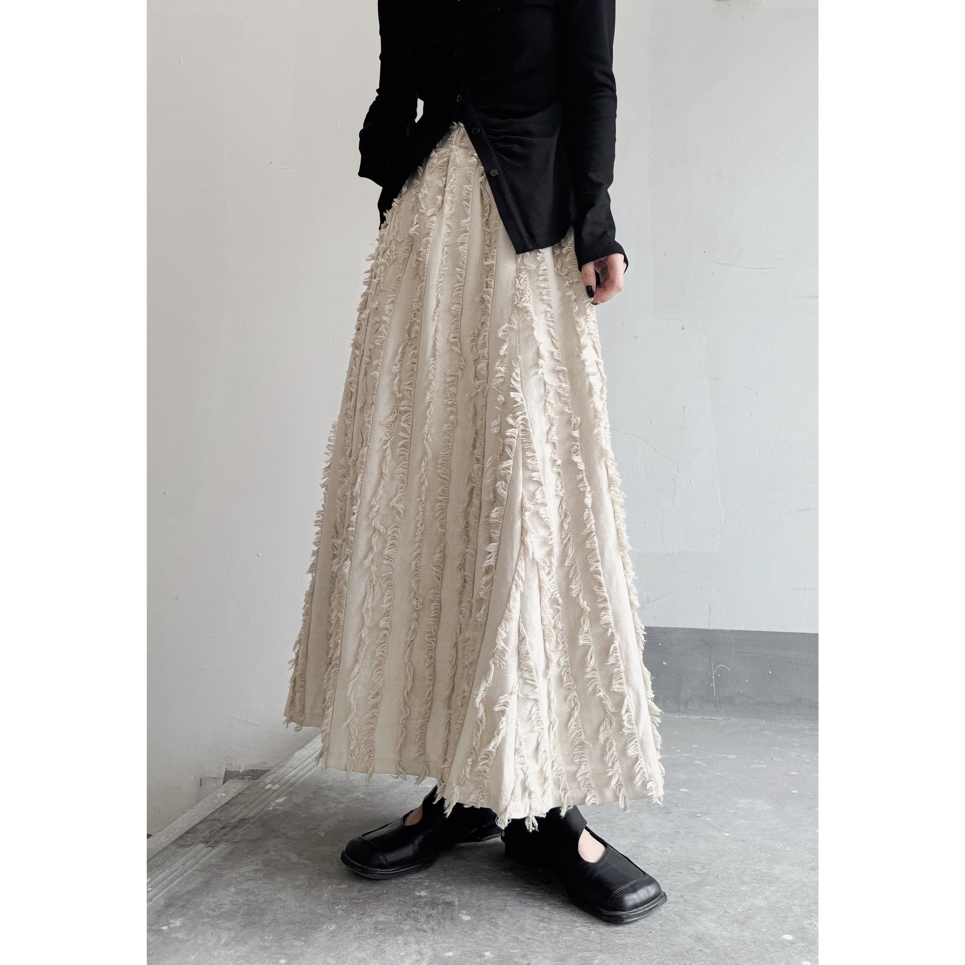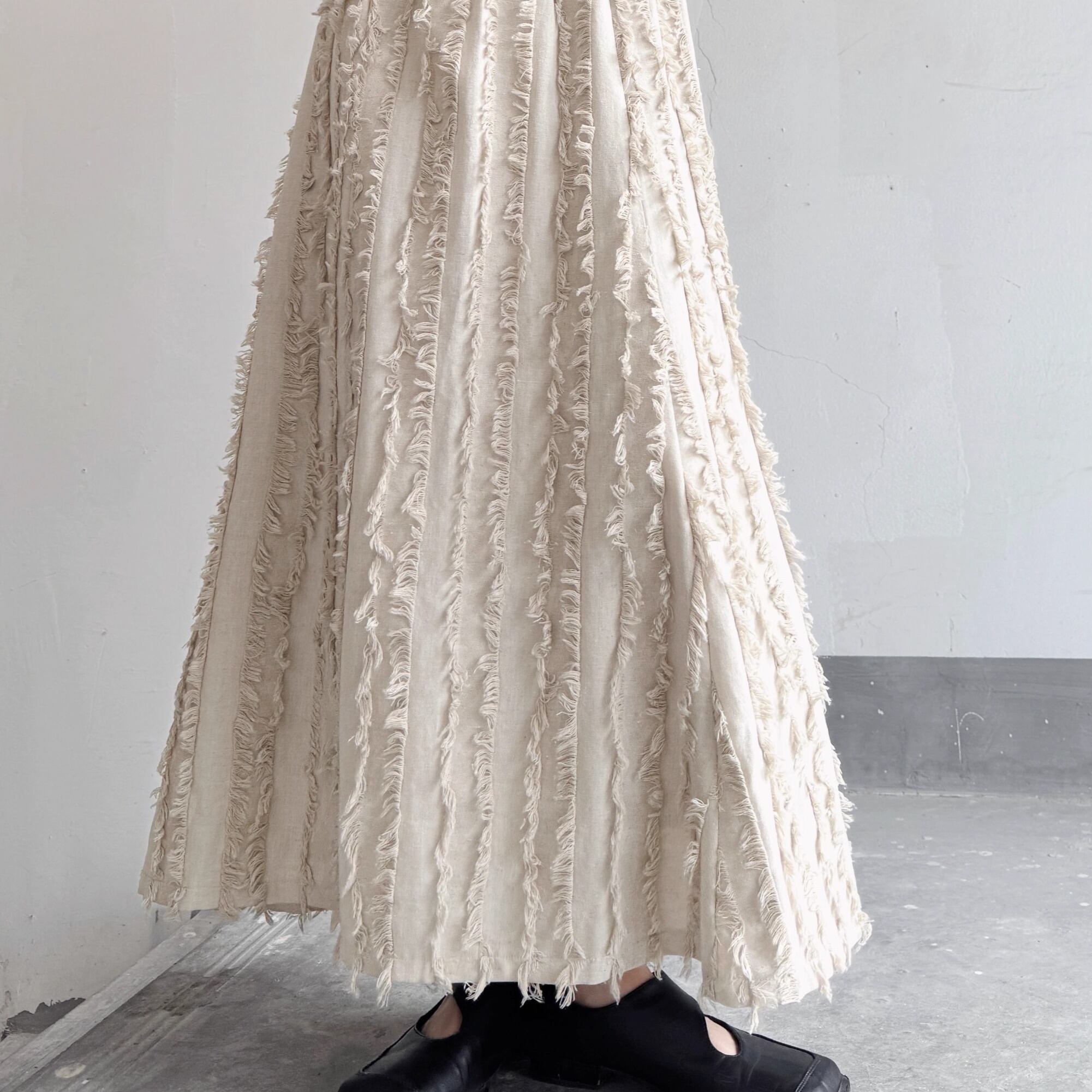 スカート全体を覆う繊細なフリンジデザインが、歩くたびに優雅に揺れ、まるで光を纏っているかのような動きのある表情を生み出します。