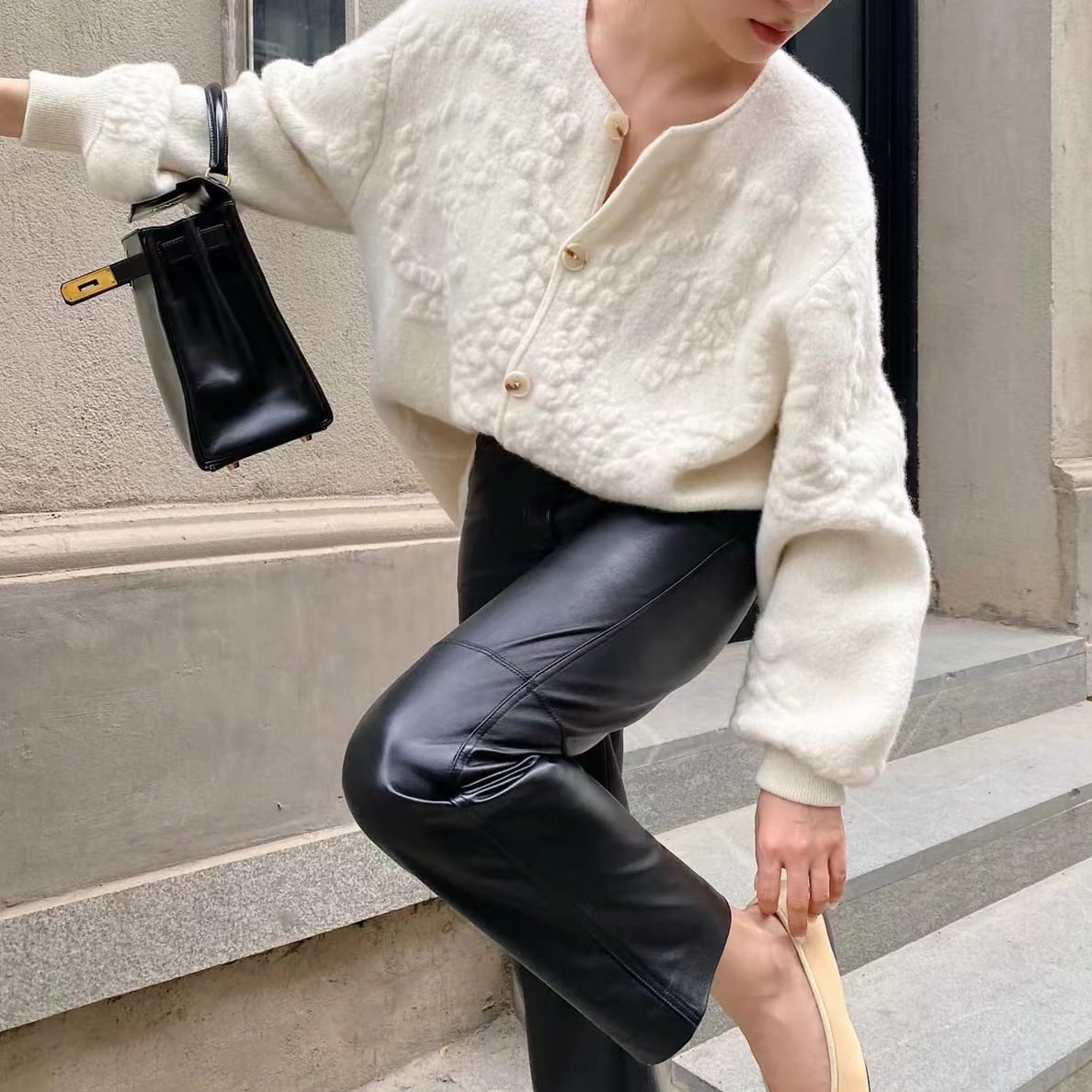 ・レザーやスカートを合わせてモードな印象に仕上げる。