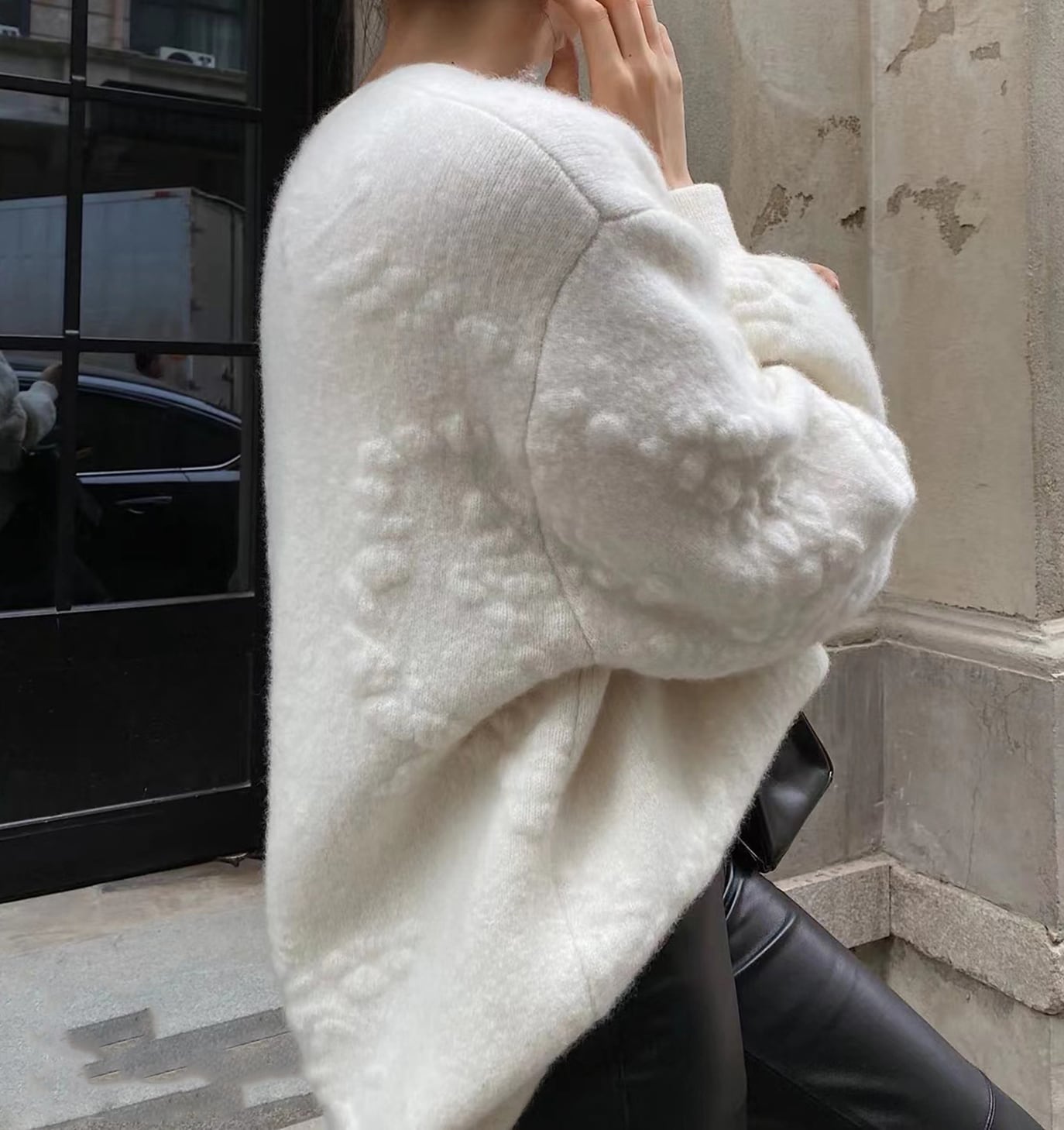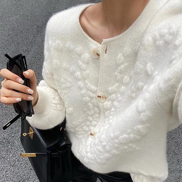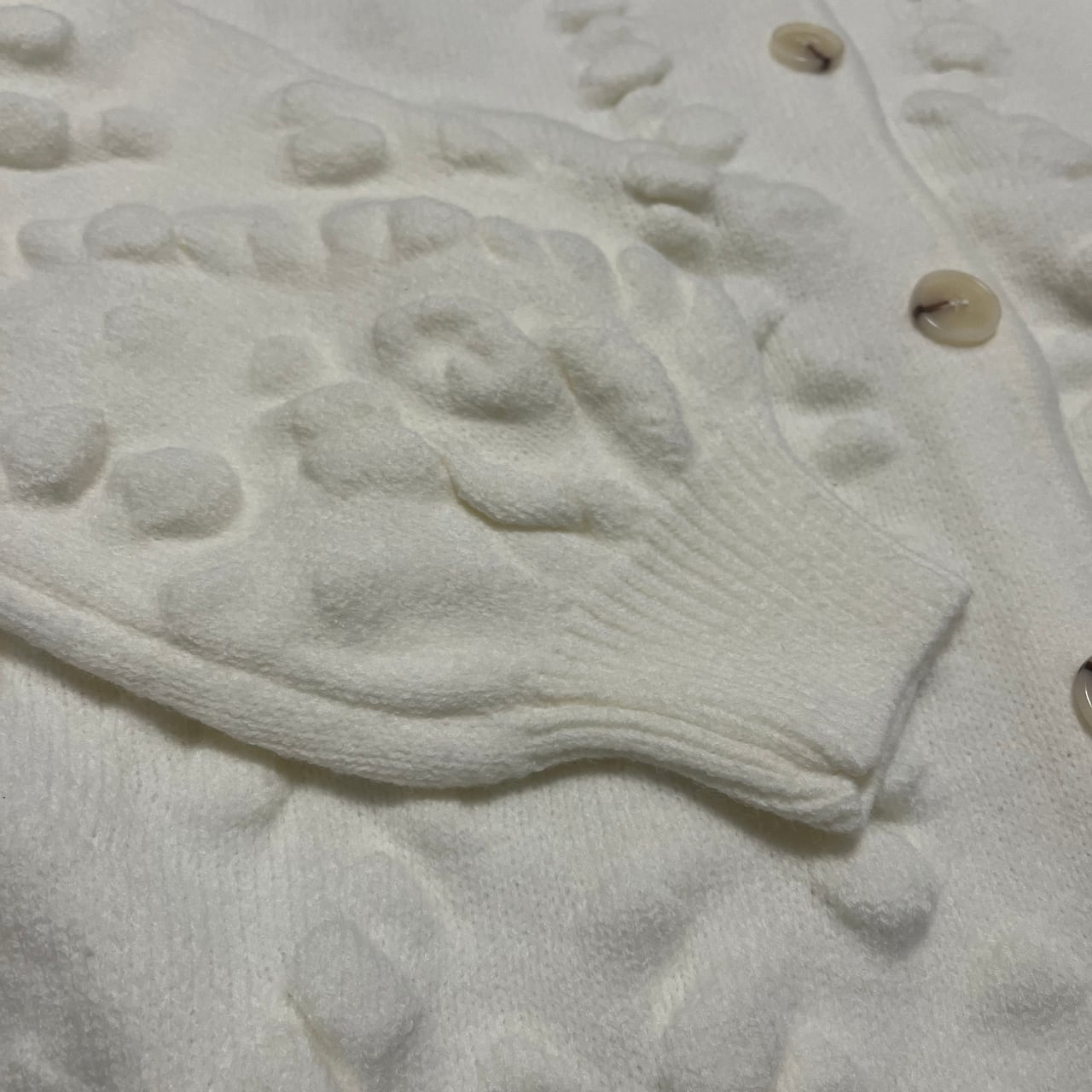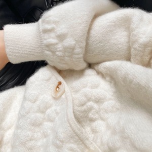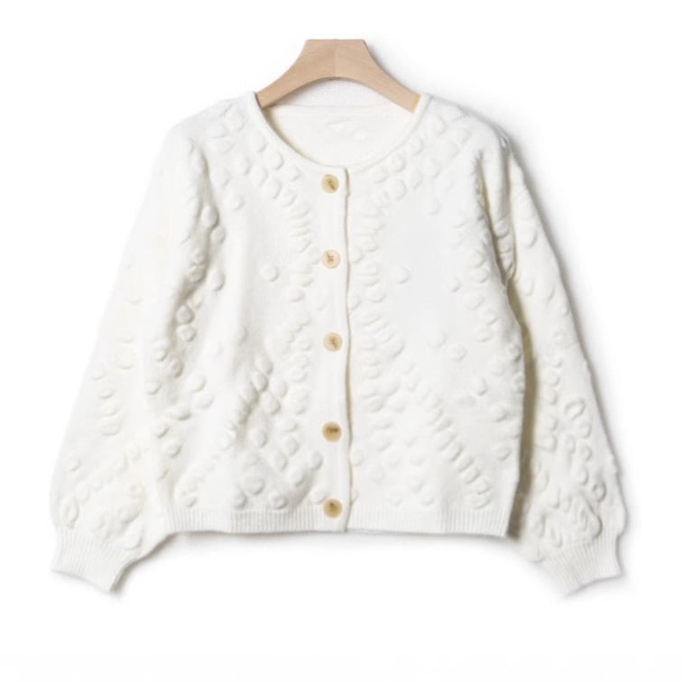 ふっくらとしたポコポコ編みが目を引くホワイトニットカーディガン。