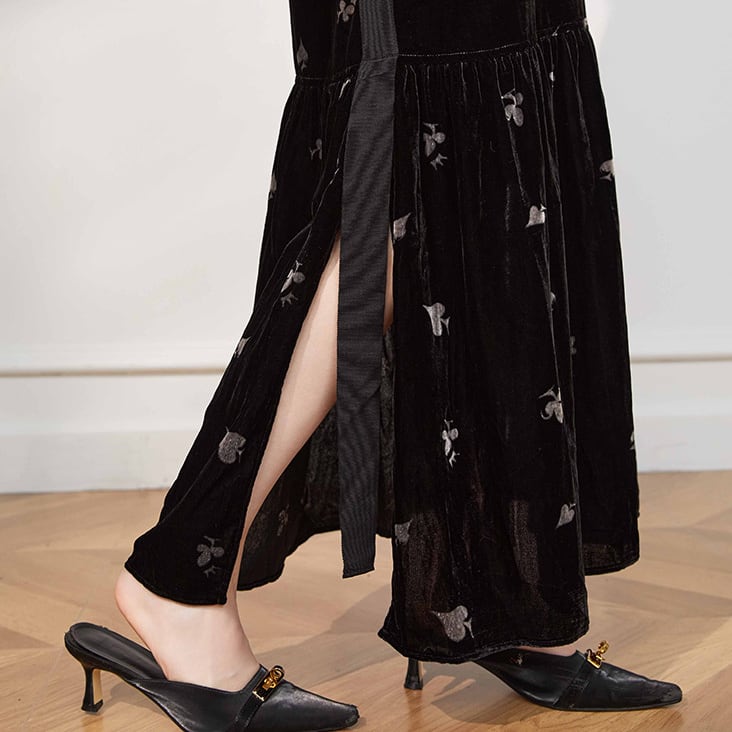 光沢のあるベルベット生地にトランプ柄を散りばめた、遊び心満載のワンピース。