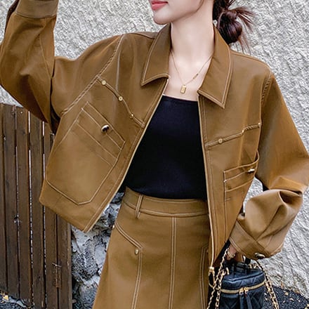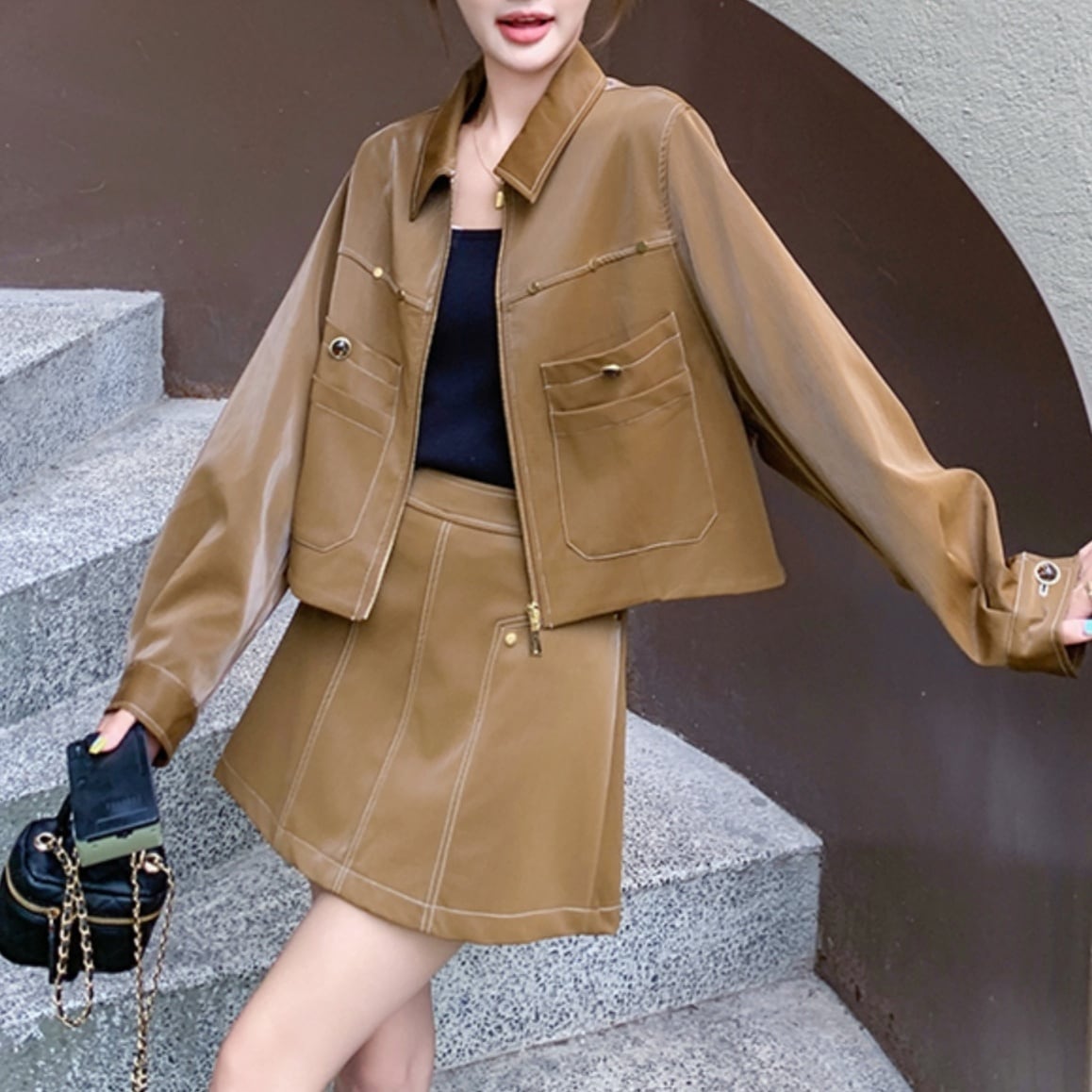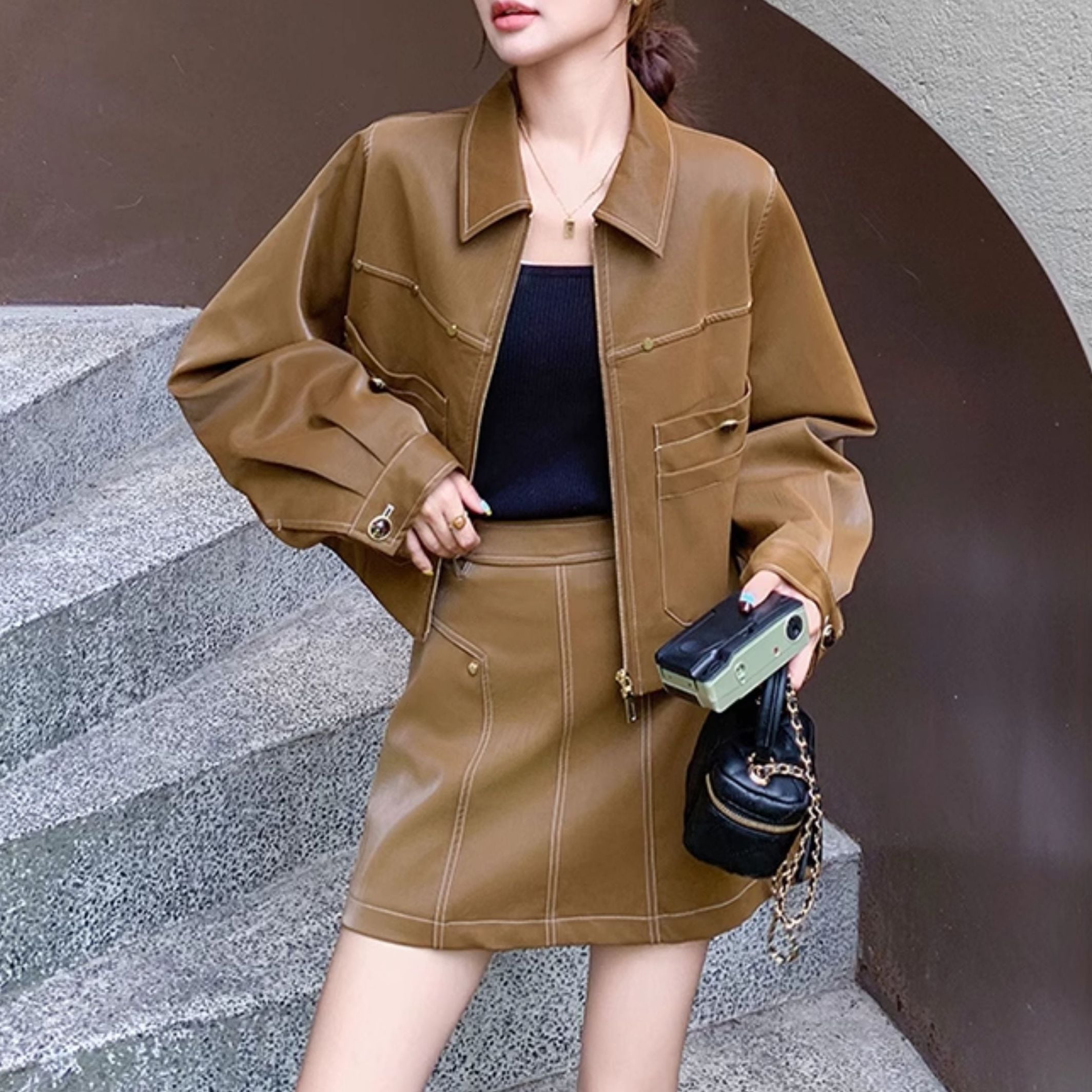 ジャケット×ショートスカートのツーピースセットは、クラシックなブラウンに、現代的なシルエットを融合させた特別な一着。
