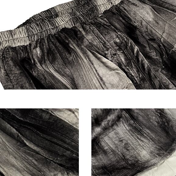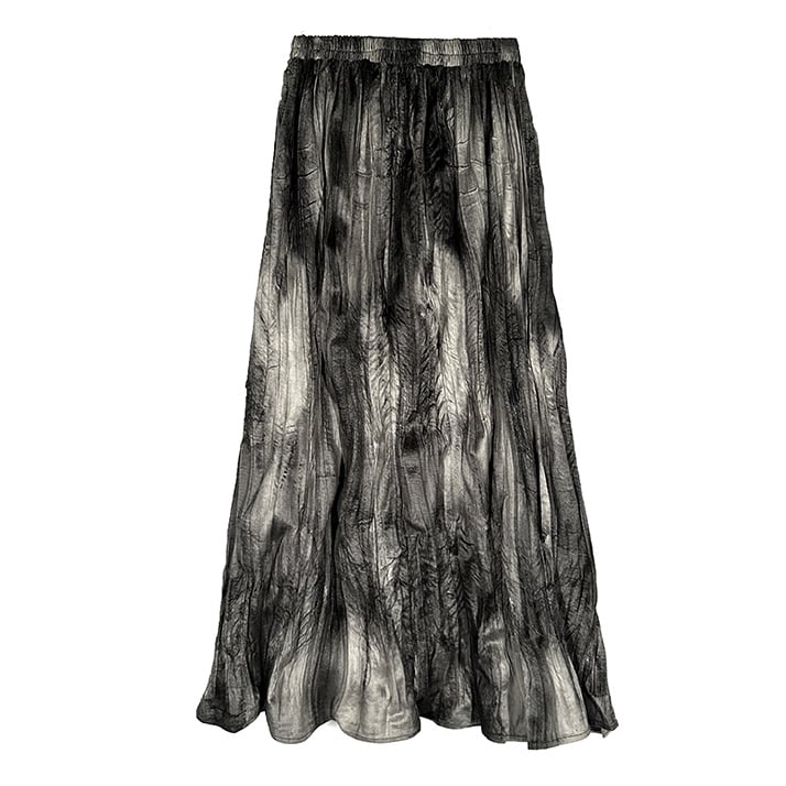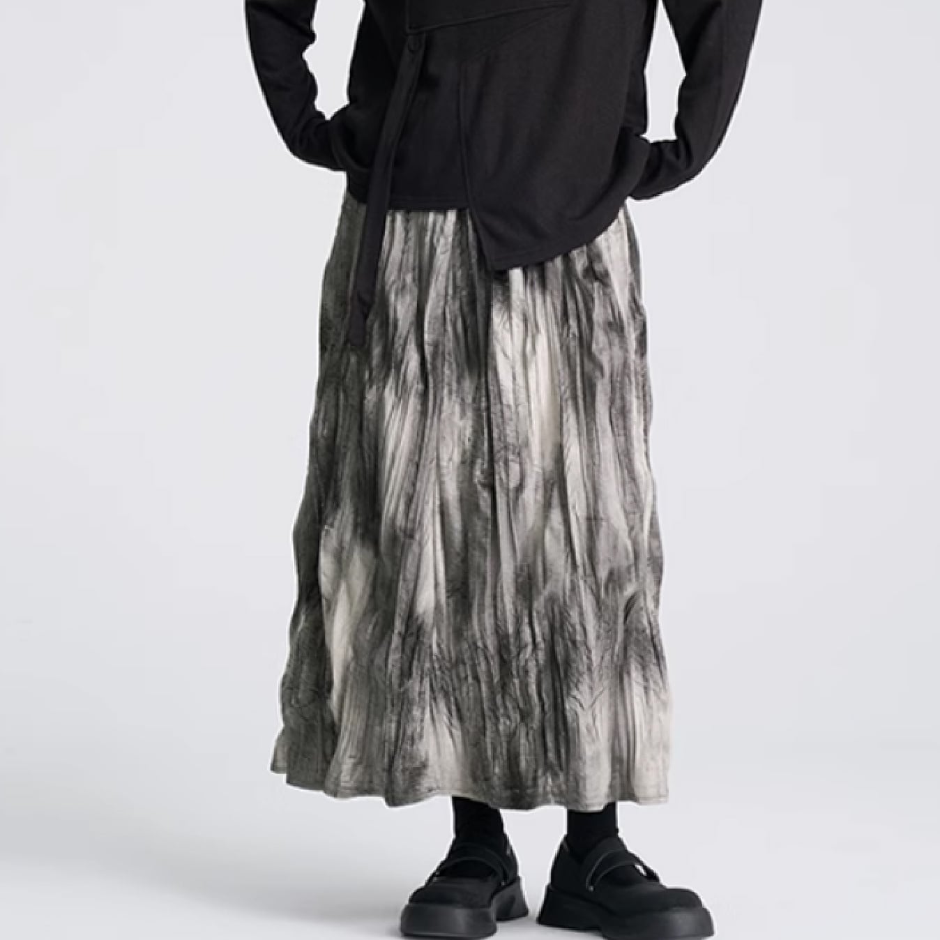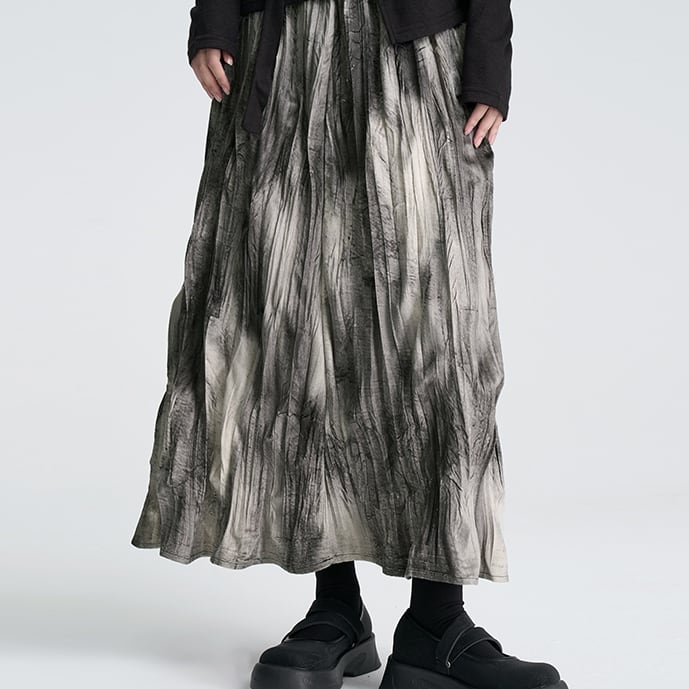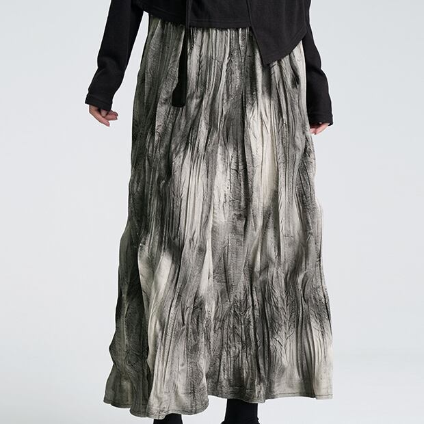 まるで水墨画やインクアートを纏ったような、独創的なプリントデザインのプリーツスカート。