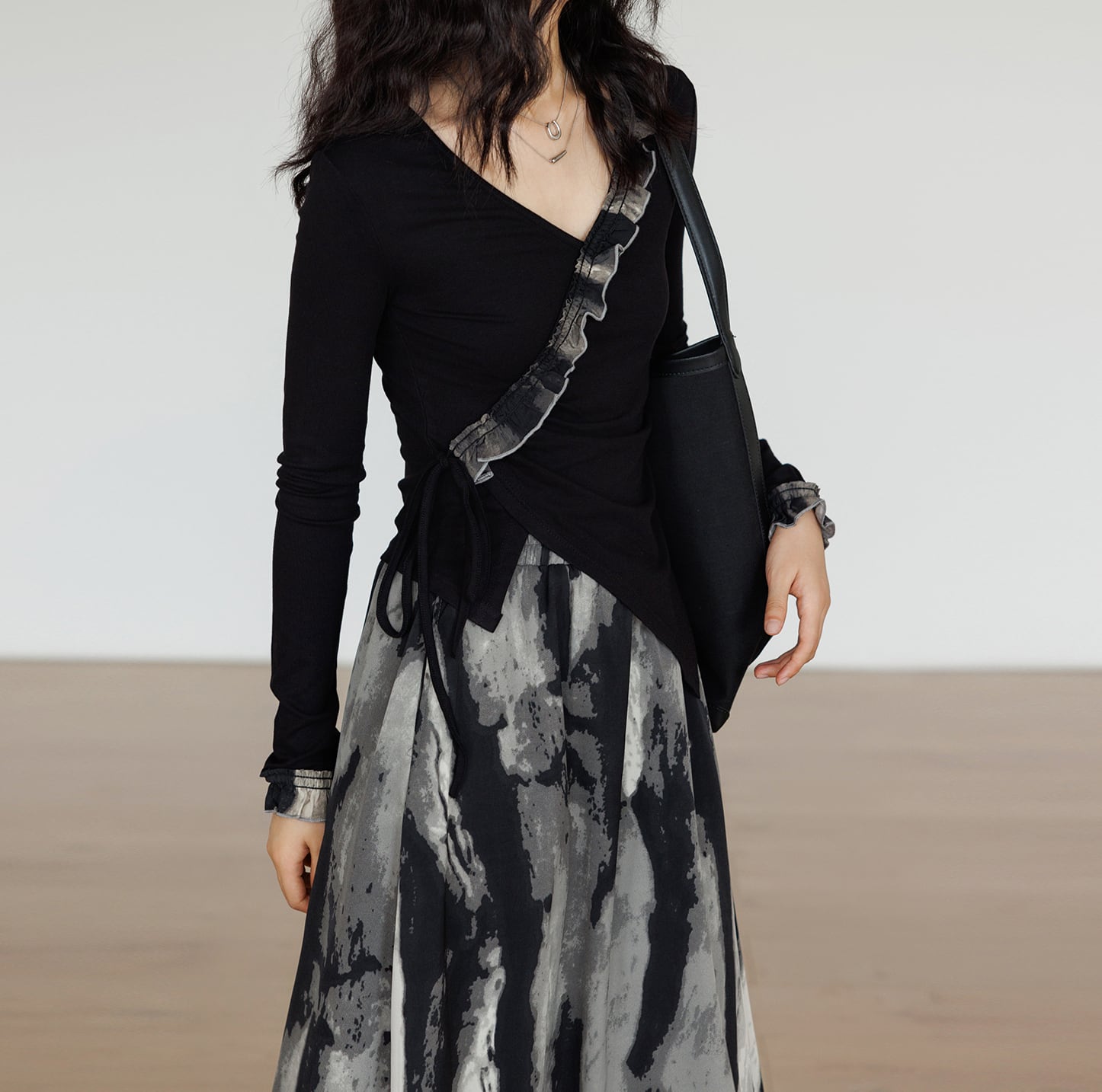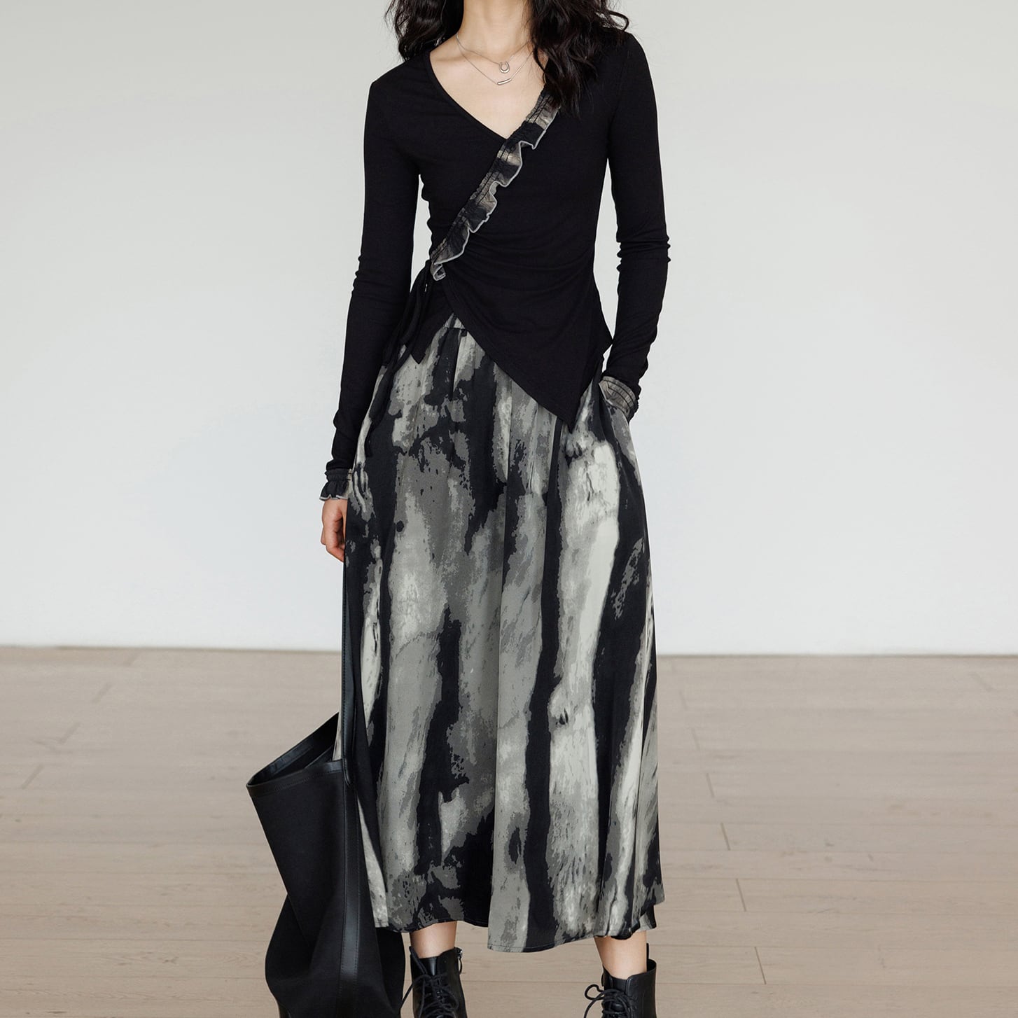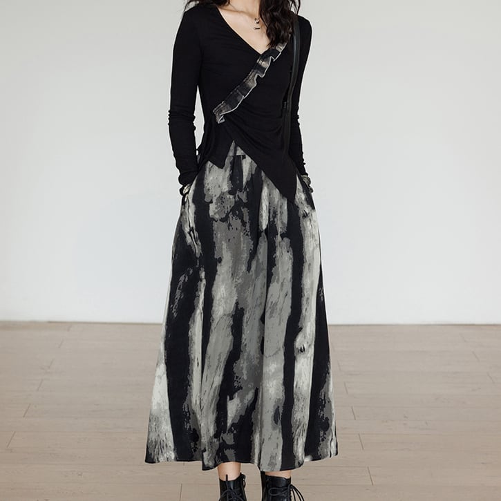 スカートは足首まで届く長め丈が、エレガントで洗練された雰囲気を醸し出します。
