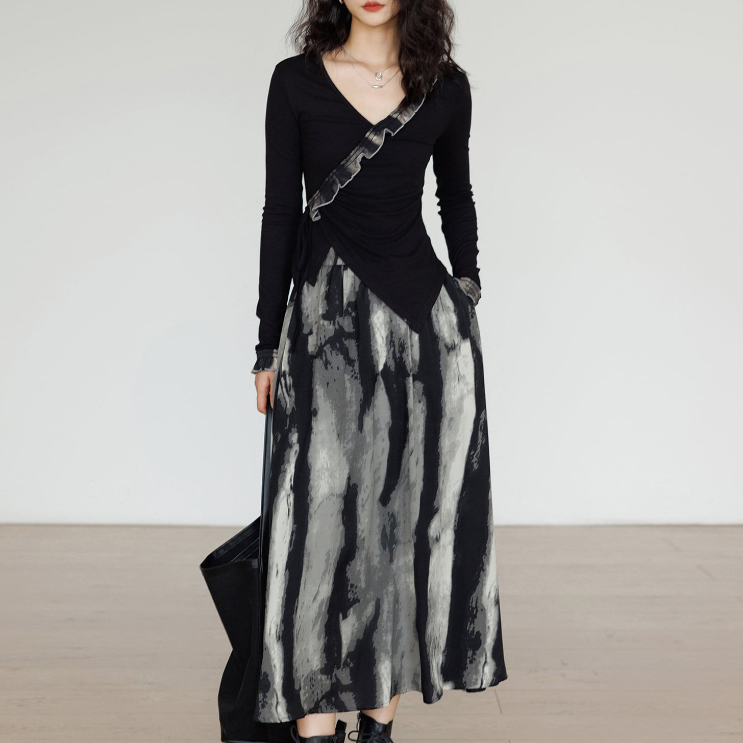 ブラックとグレーの柄が美しくリンクした、視覚効果抜群のセットアップ。