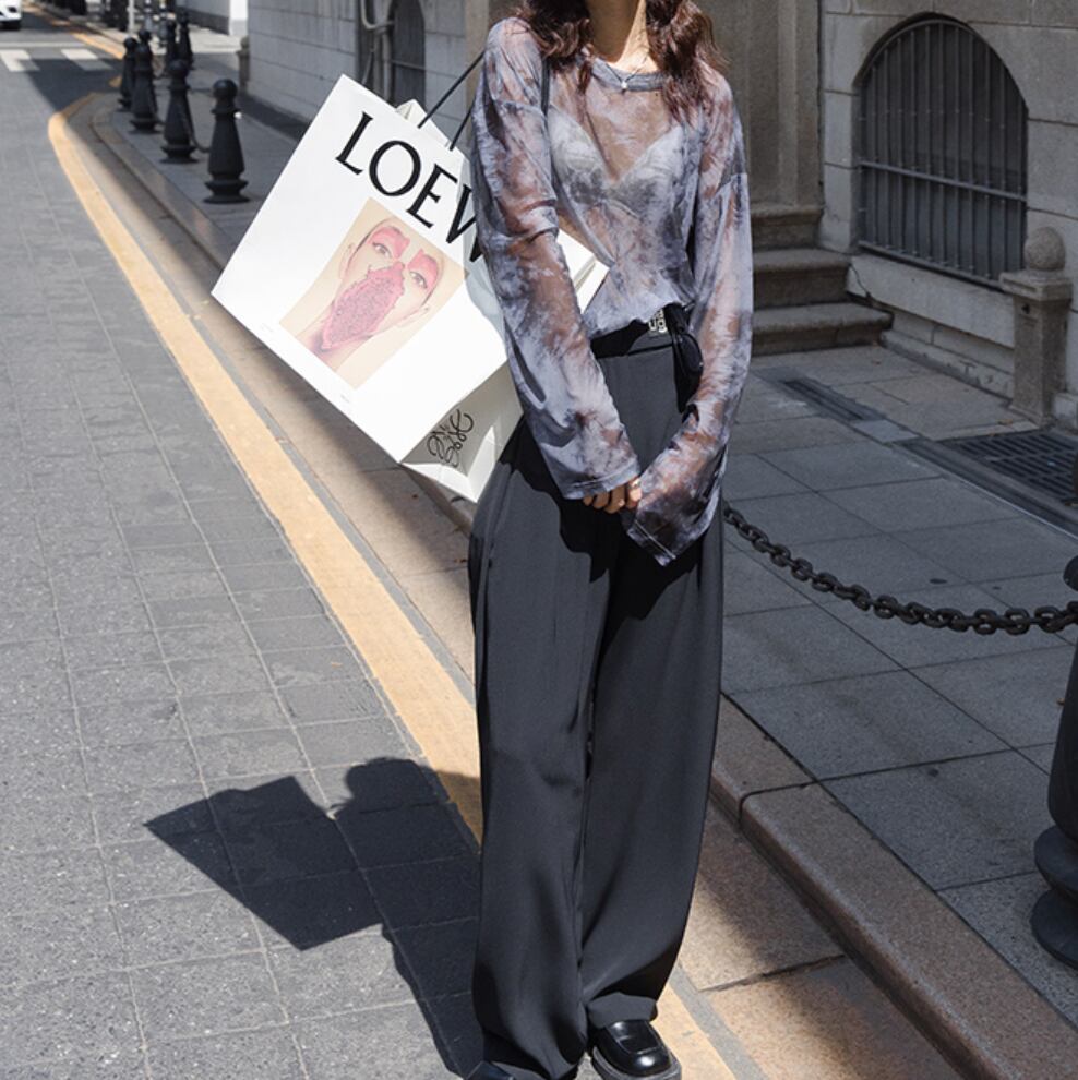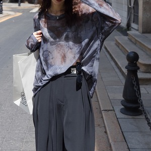 淡いパープルとグレーが溶け合うタイダイ柄が、まるで水彩画のような儚げな美しさを放つシアートップス。