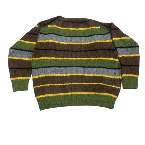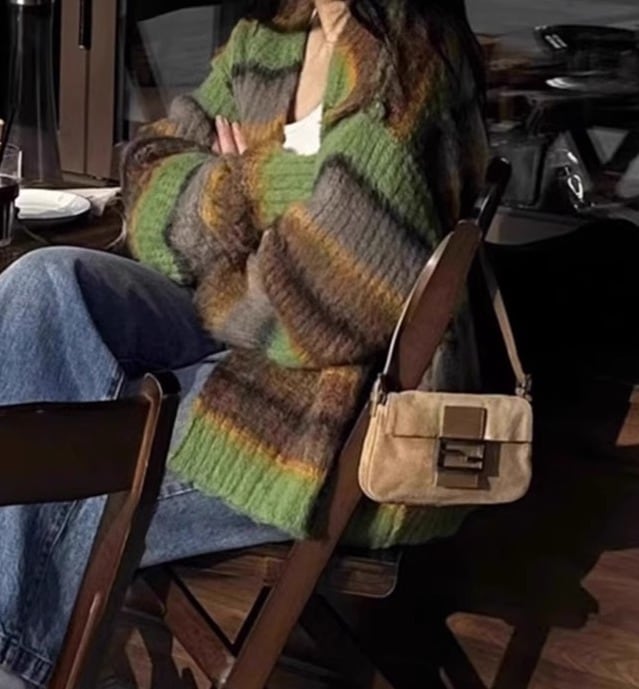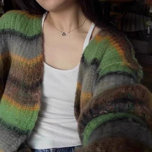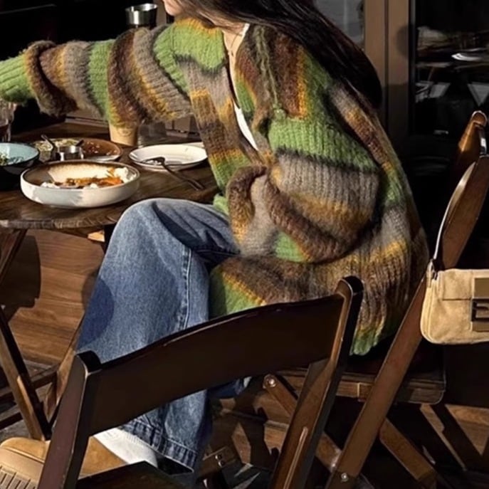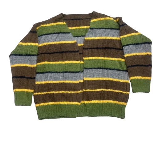 グリーン、イエロー、ブラウンなどの多色ストライプが特徴的なカーディガン。